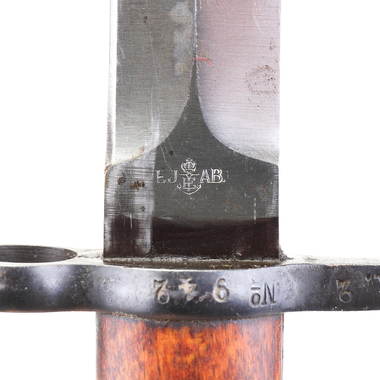 Bajonetten är stämplad med ett krönt ankare och EJ AB och tillverkad i Eskilstuna.
