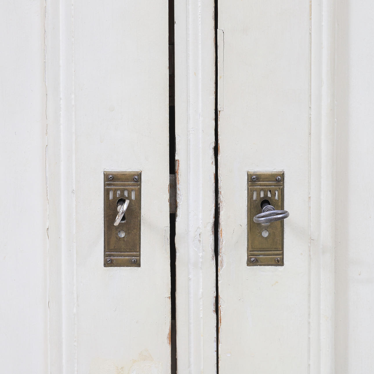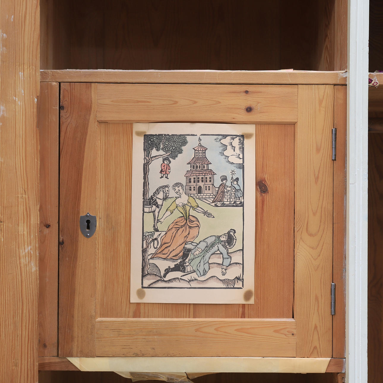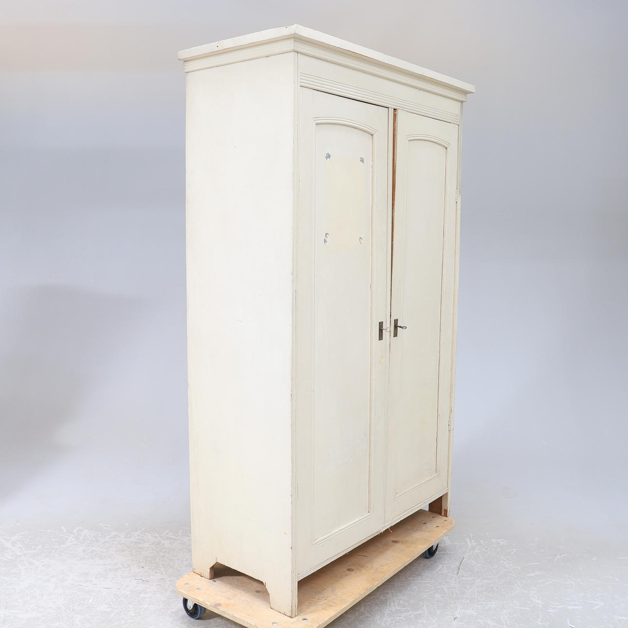 Bruksslitage. Repor, slag och märken. Senare och ojämnt bemåla. Häftmassa kvar. Nyckel saknas till det inre skåpet.