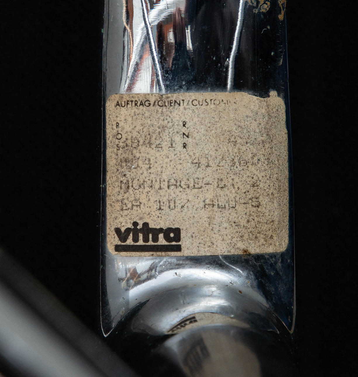 Utkast: 1958. Ej roterbar. Armstöd och sockel i gjuten aluminium, förkromad. Svart Hopsak omslag Var och en markerad på undersidan. HxBxSH: 82x58x47cm.