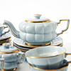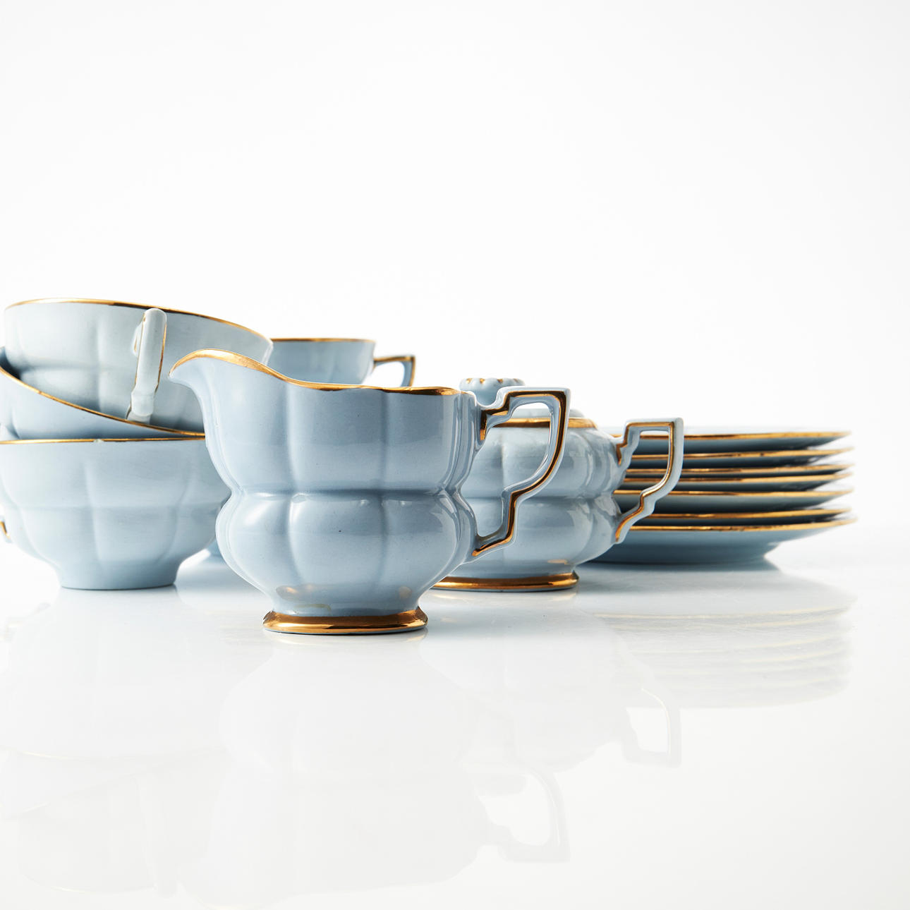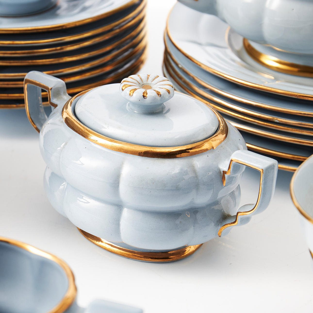 Bestående av tekanna, sockerskål, gräddkanna, 7 tekoppar med fat, 7 assietter.