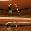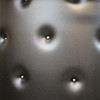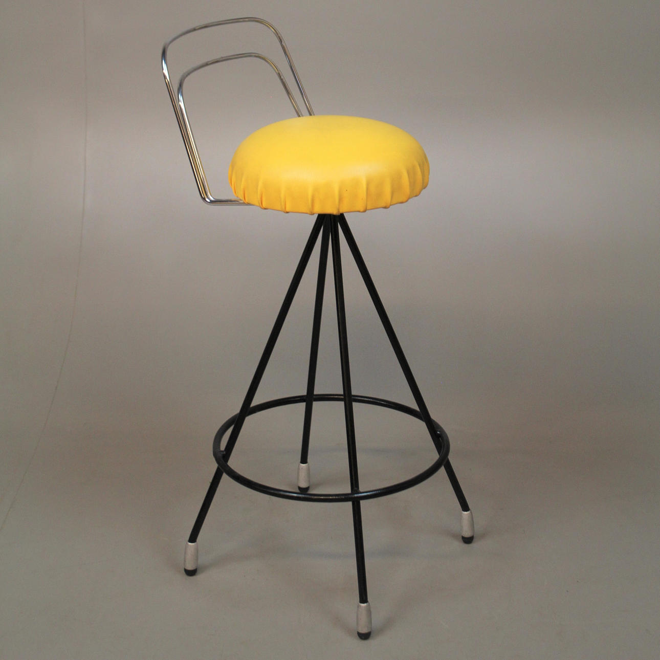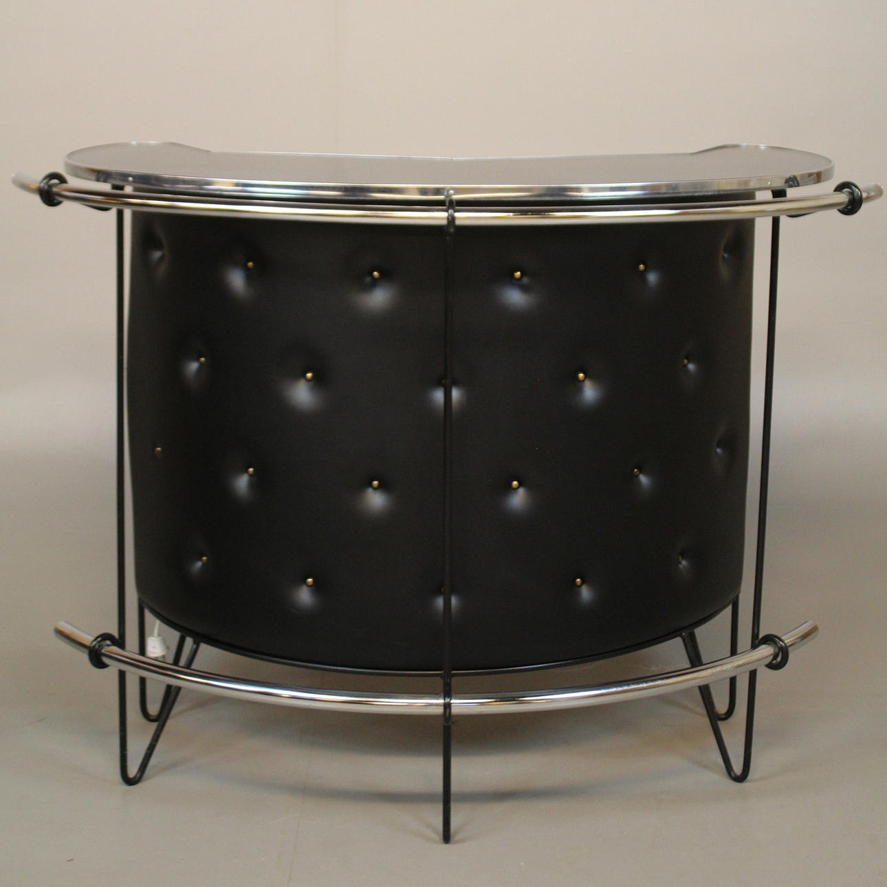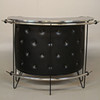 Djuphäftad barfront med kromade detaljer. Bakom disken tre laminerade hyllor. Stolar i delvis svartlackerad metall med stoppade sitsar. Sitthöjd stolar ca 69 cm. Barens bredd 133 cm och höjd ca 100 cm.