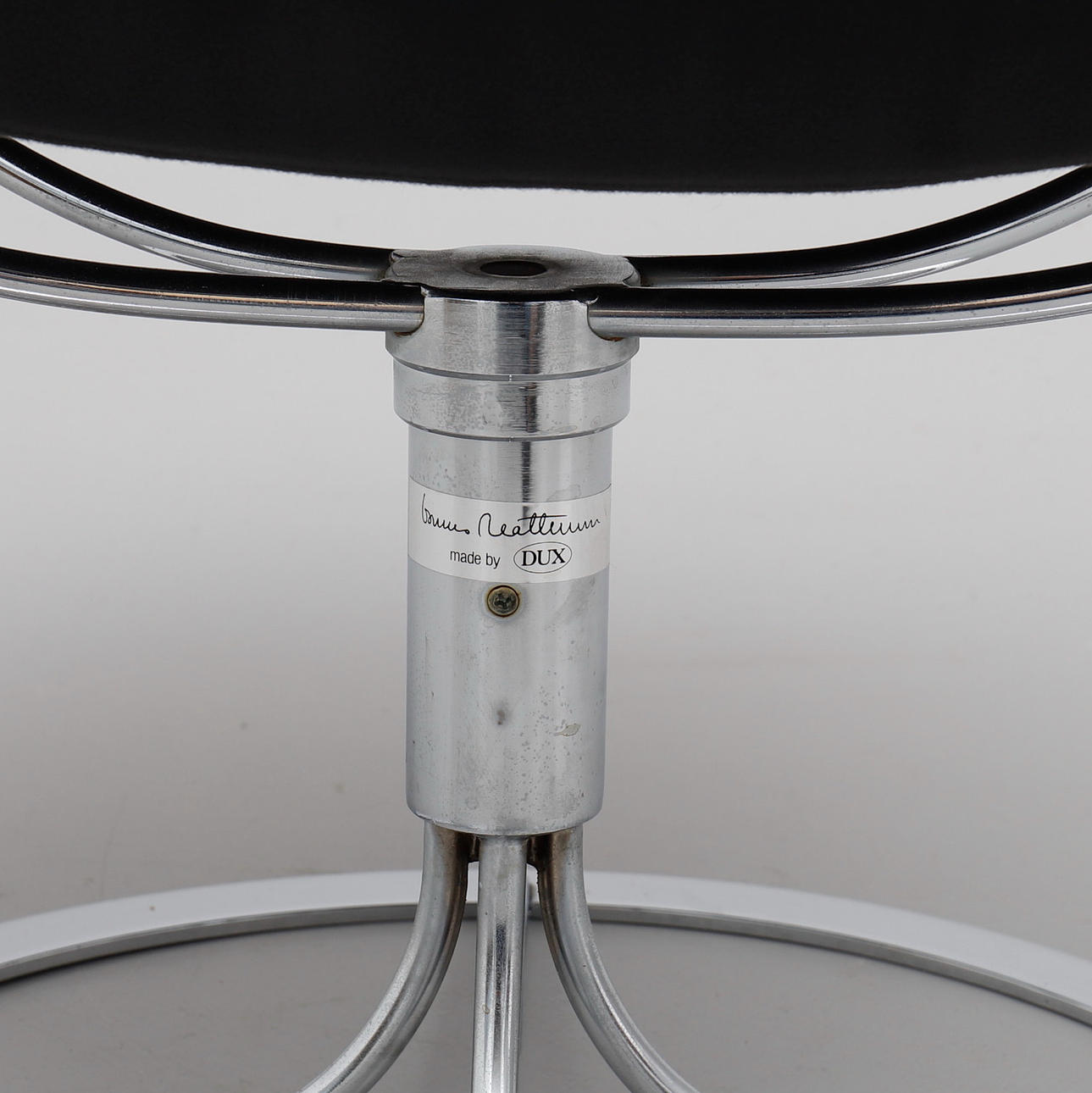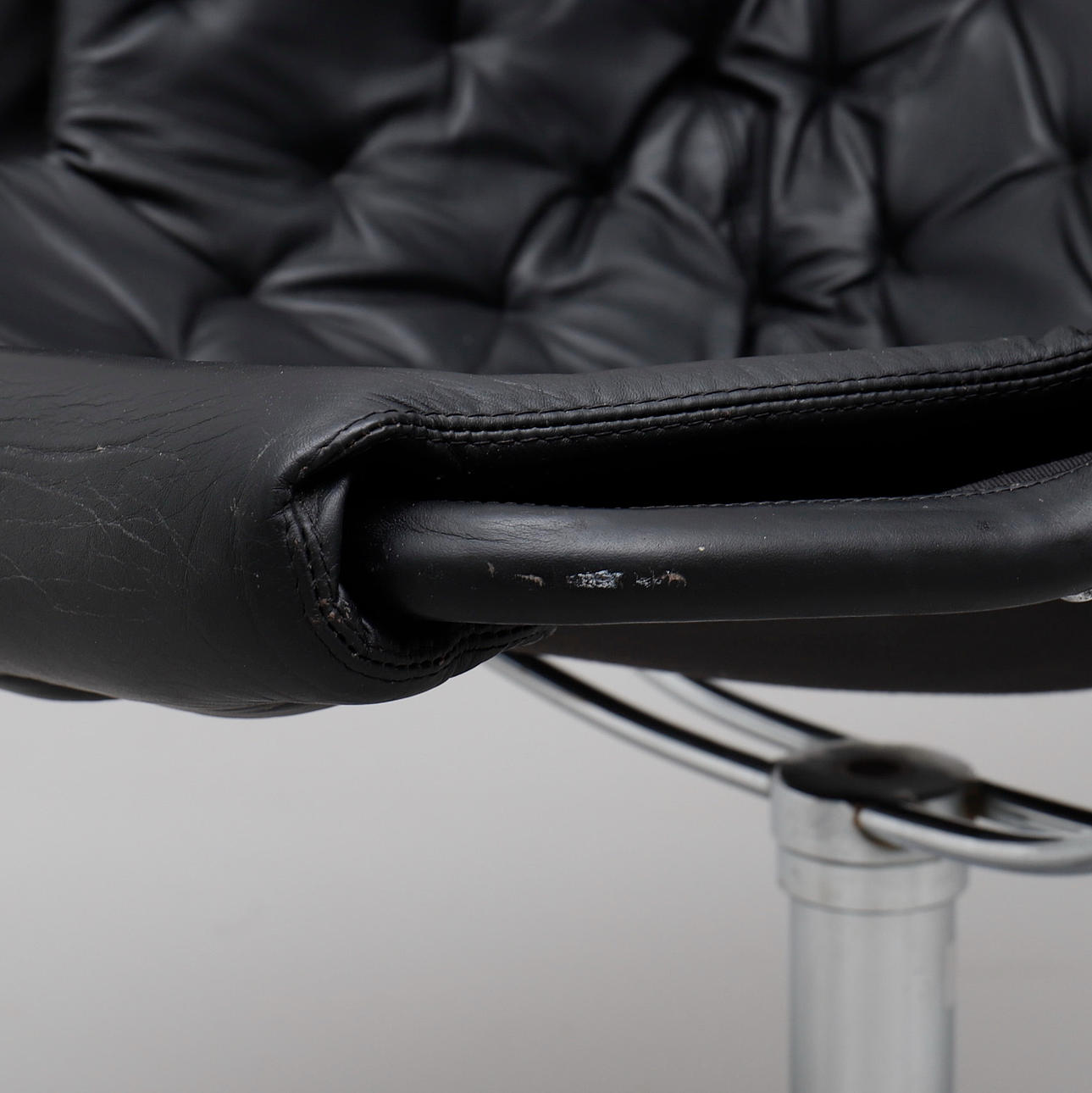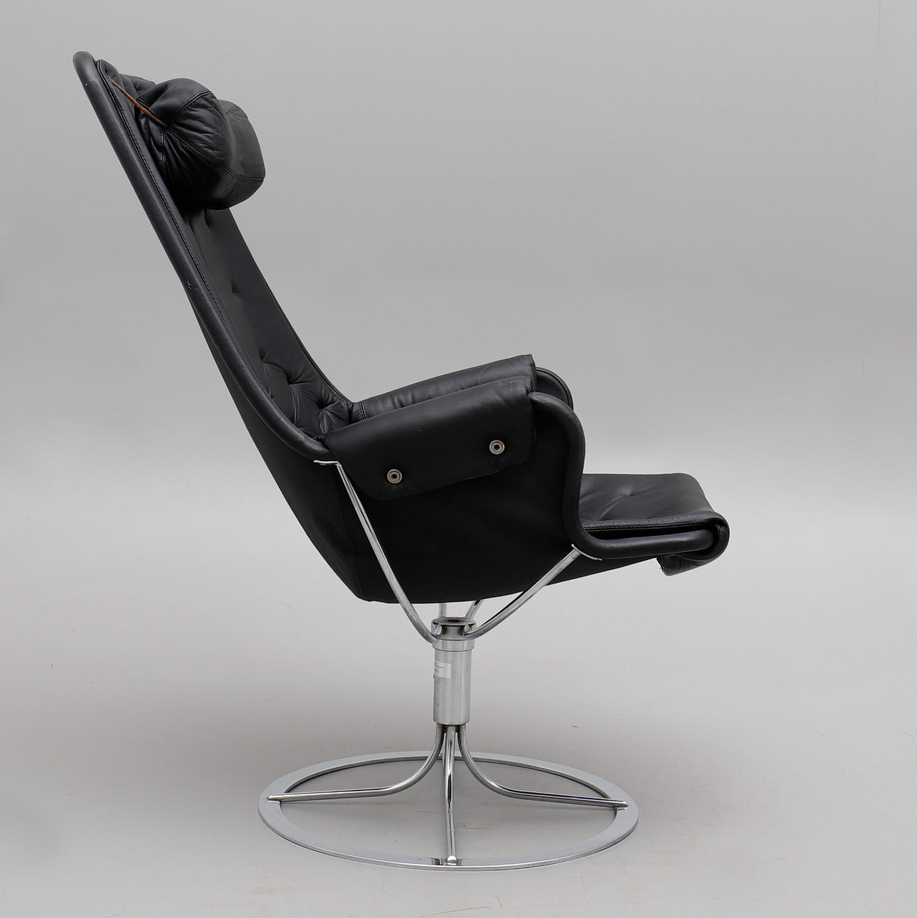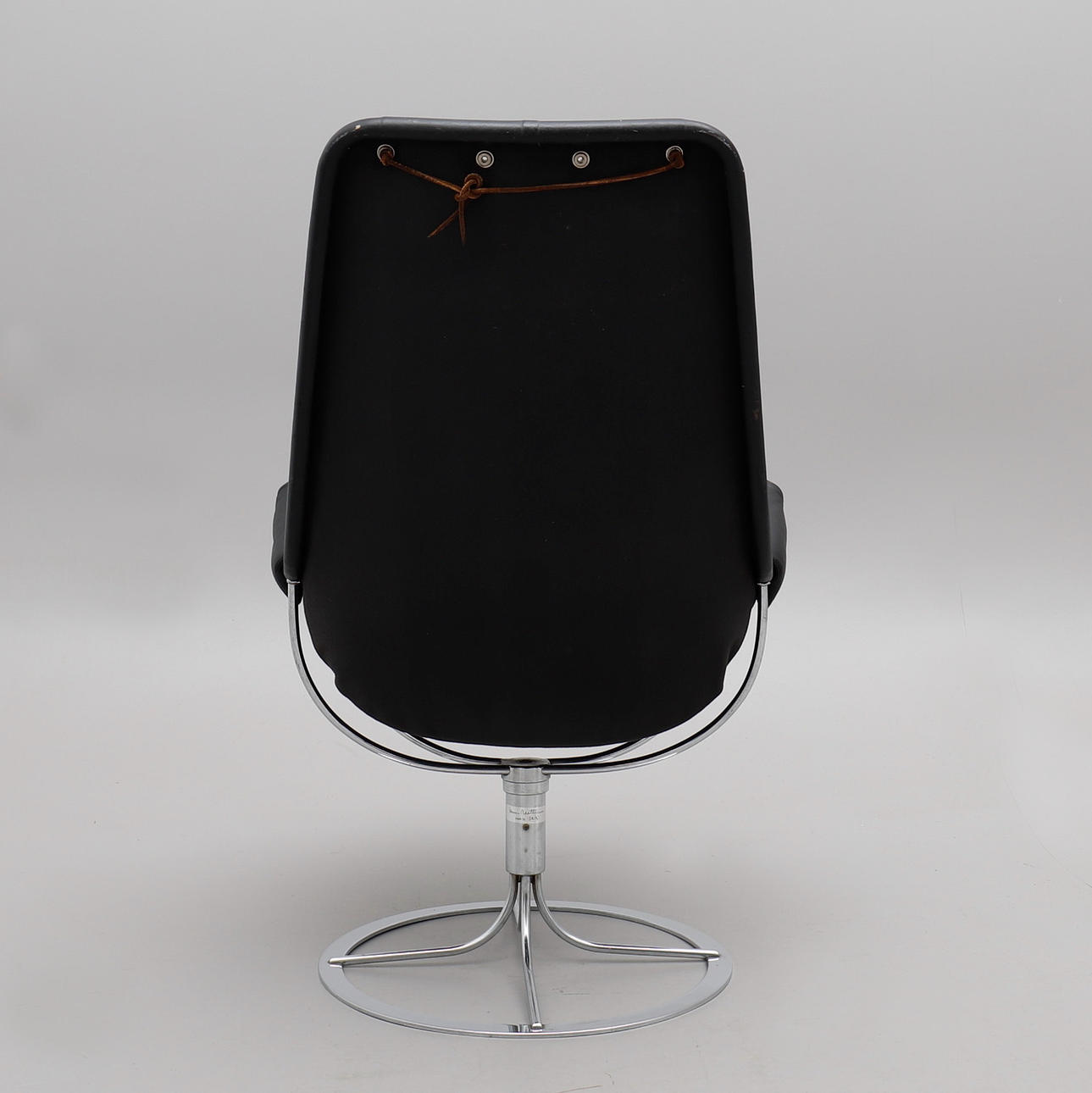 Klädda i svart läder med lös nackkudde. Snurrbar kromad fot.