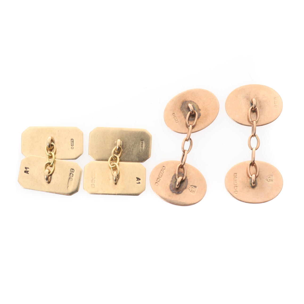 Birmingham 1923, de ovala plack med kedjelänk kontakter1,7 cm x 1,3 cm, och ett par 9ct guld manschettknappar, Birmingham 1943, snedställda hörnet rektangulära plack, vände en sida motor, den andra graverad med ett monogram, kedjelänk kontakter, 1,7 cm x 0,9 cm, 9,1 g (4).