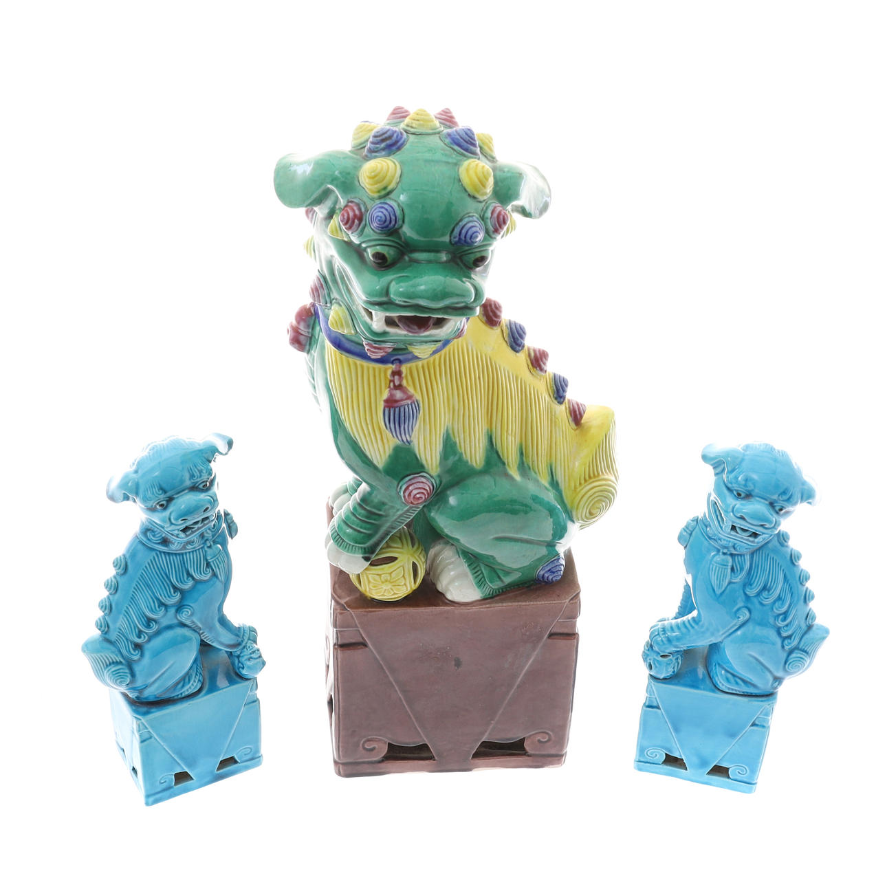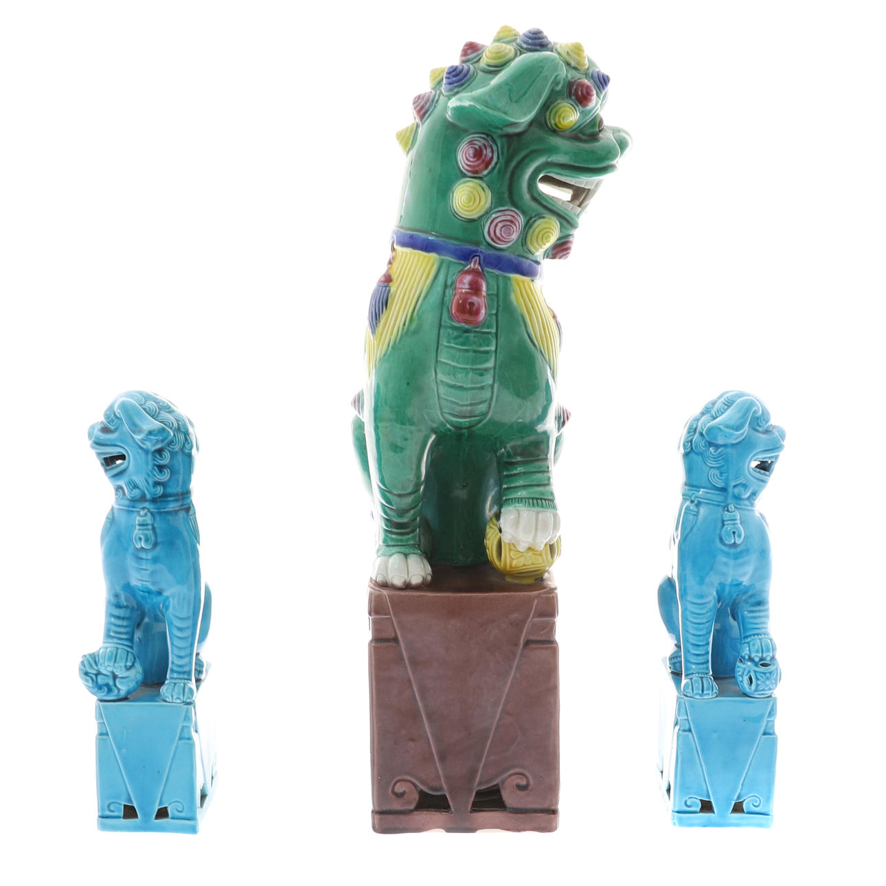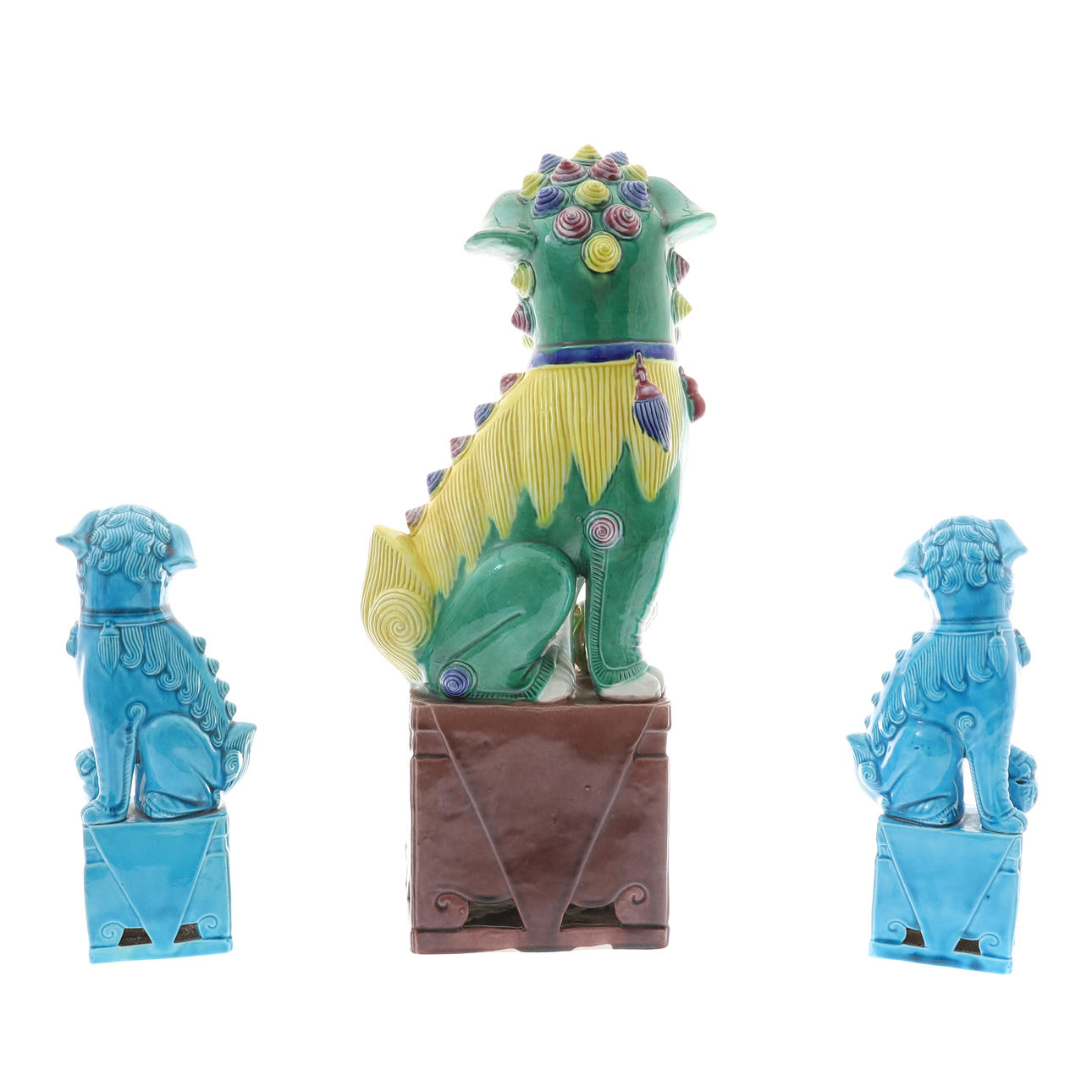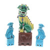 i färgade glasyrer, 37cm höga, och ett par moderna kinesiska porslin turkos glaserade figurer av foo hundar, 21cm höga (3).