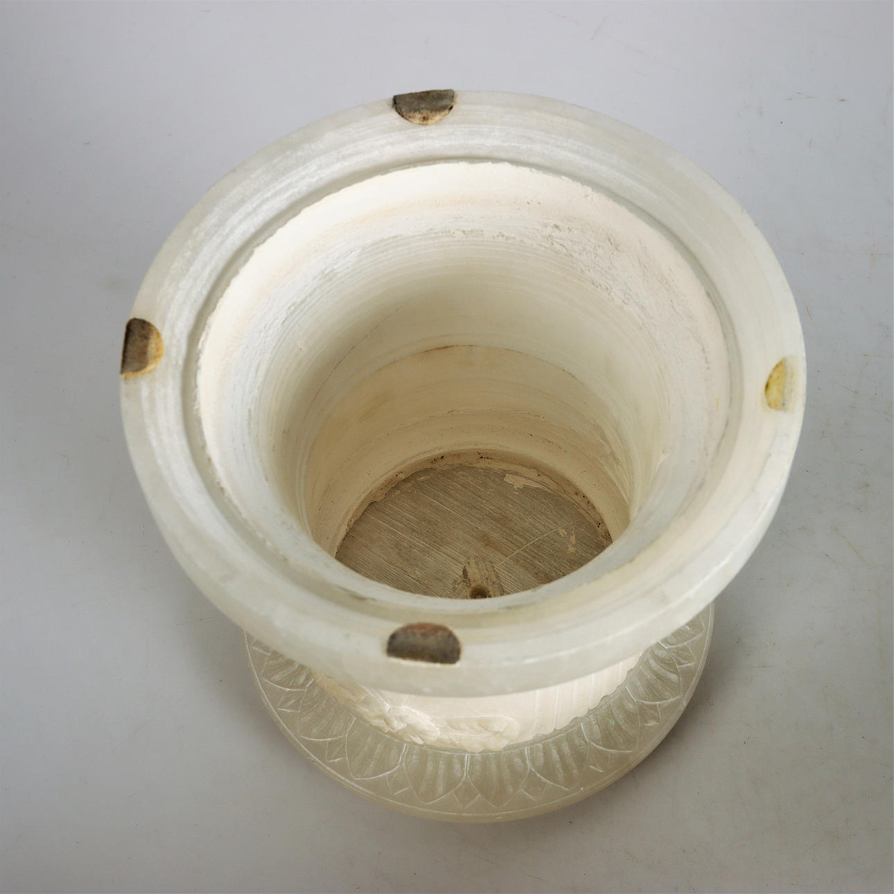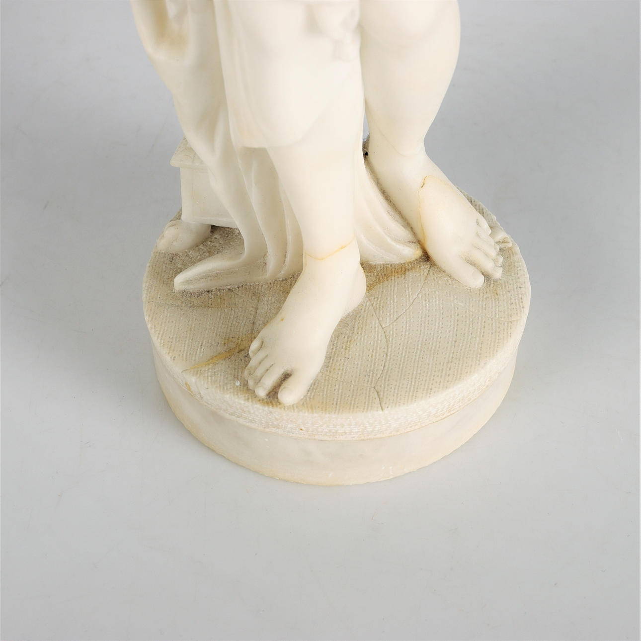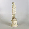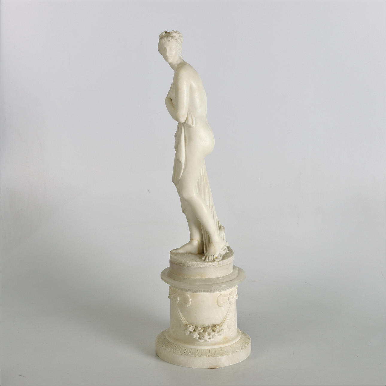 "Afrodite", skulpterad alabaster på tillhörande sockel med skurna rosor. Södra Europa 1900-talets första hälft Höjd 69 cm Diameter sockel 21 cm.