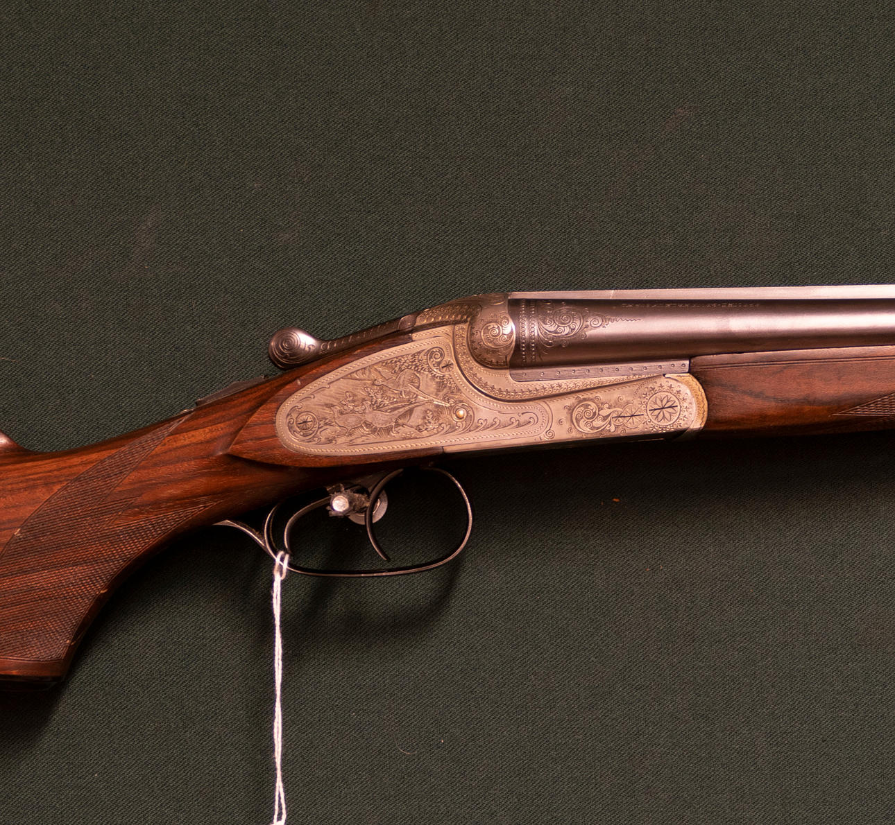 Hagelgevär Tysk SvS Hammerless. Fabrikat Merkel. Mod 147E. Kaliber 20/70. Tillv.nr. 761801. Piplängd 68cm. Förlängd spång med kryssbult. Top lever. Ejektor. Säkring på kolvhals.Dubbla avtryckare. baskyl och sidoplattor stålfärgade och försedda med riklig jkatgravyr. Kolv med pistolgrepp samt skurem bakkappa.