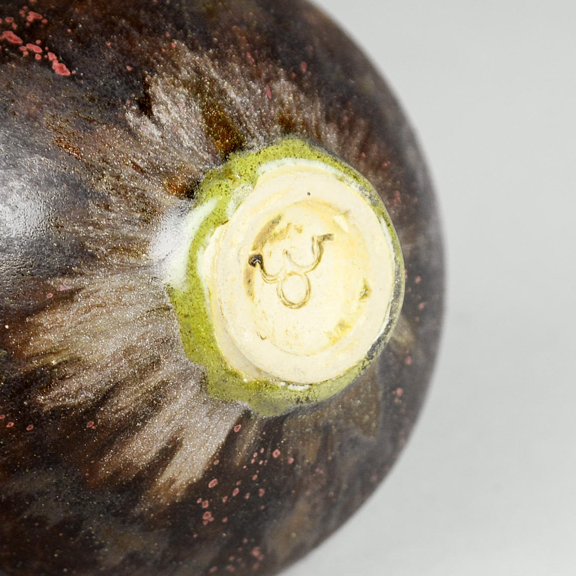 Glaserat stengods. H. 5,8 cm, D. 11 cm. Signerad.