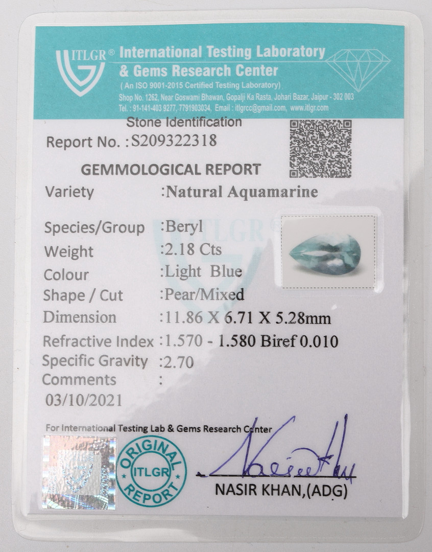 2175684. AKVAMARIN, päronslipad, 2.18 ct, certifierad.