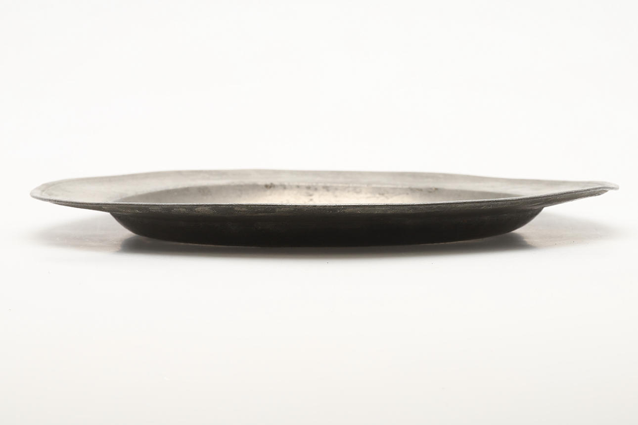 Med slät kant, stämplad med initialer 'MB' till framkanten och baksidan med svagt engelskt rosetryck märke. 42,5 cm diam..