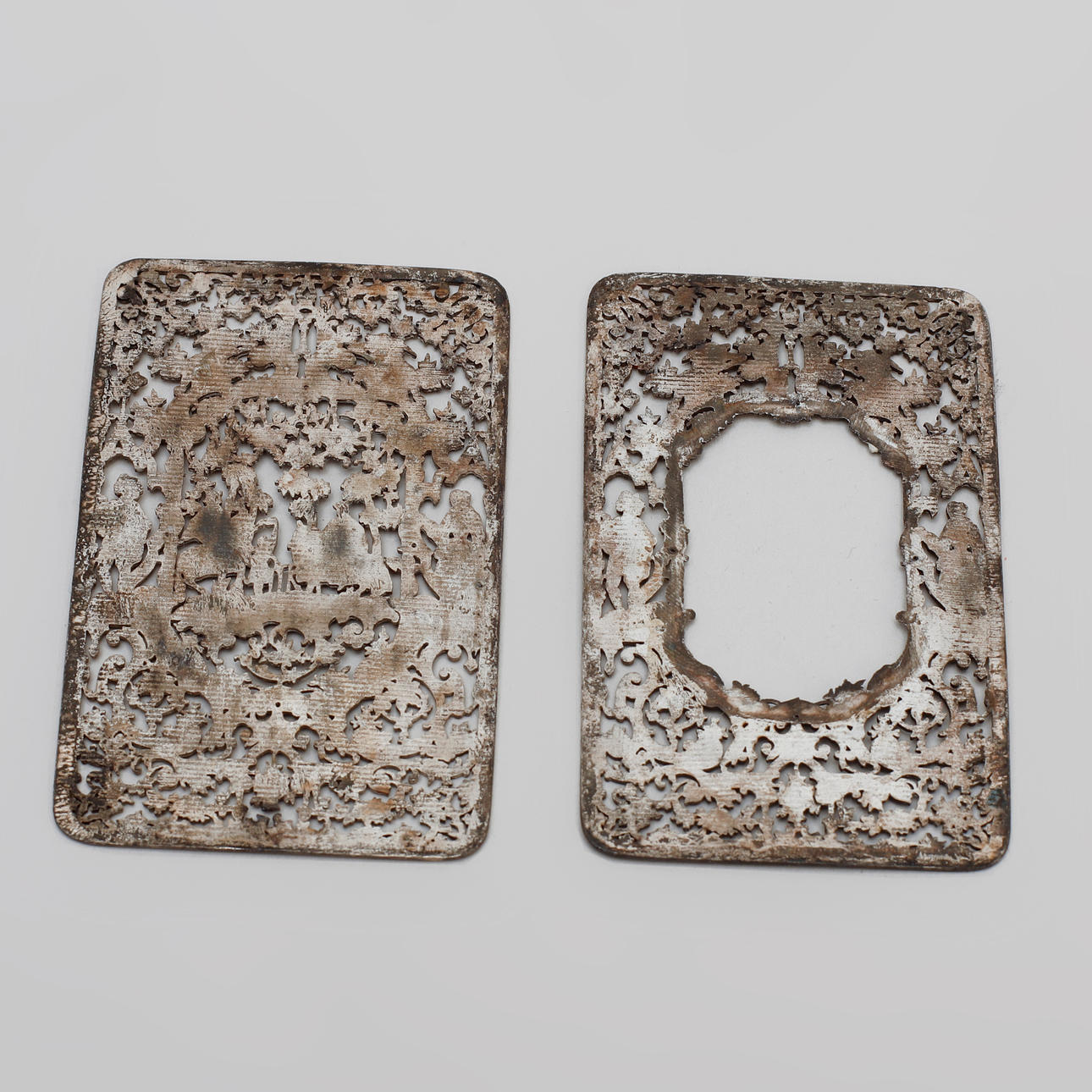 Silver med genombruten dekor av figurscen i landskap. 8.5x5.5 cm. Vikt 50 gram.
