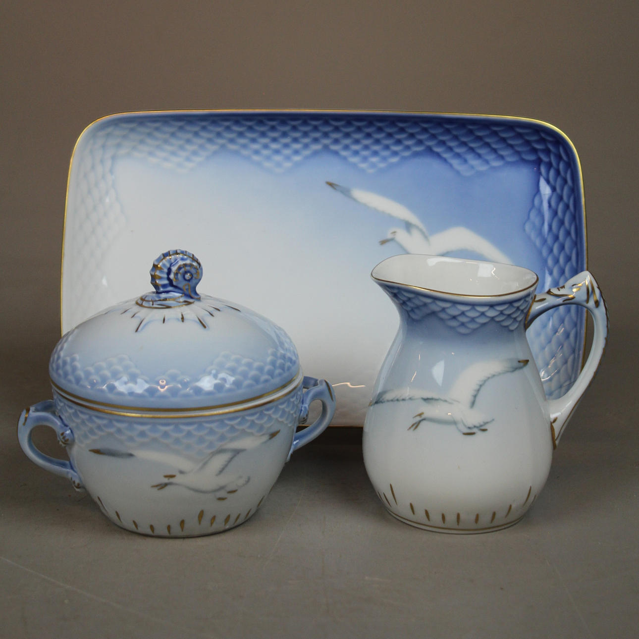 2 lövformade fat, 1 fat på fot bestående av fiskar, 1 ljusstake , 1 vas, 1 kaffekanna, 14 kaffekoppar med fat, 12 assietter, 1 rektangulärt fat, 1 gräddkanna, 1 sockerskål
