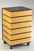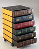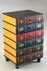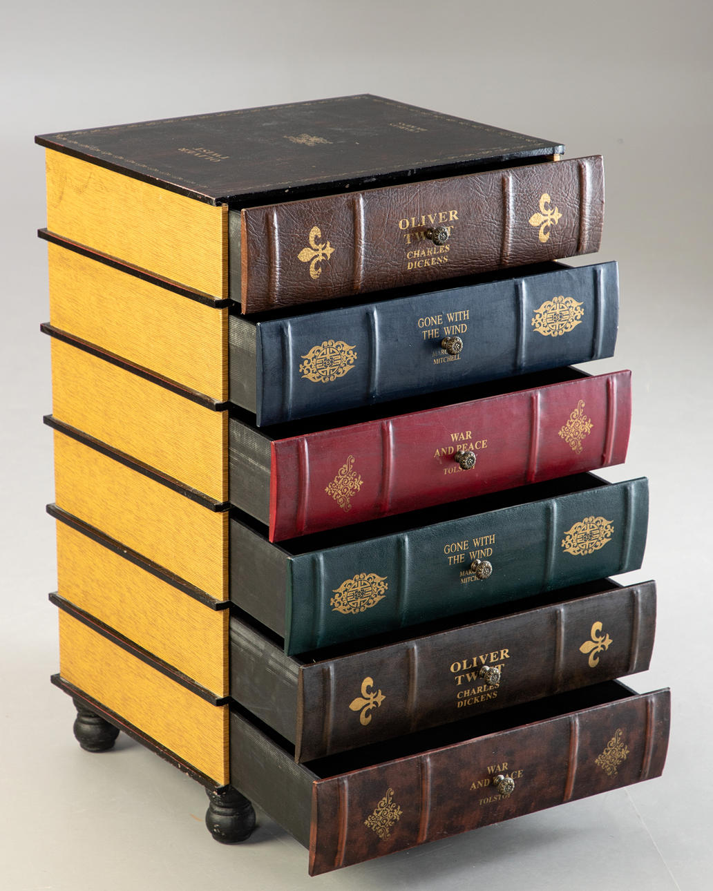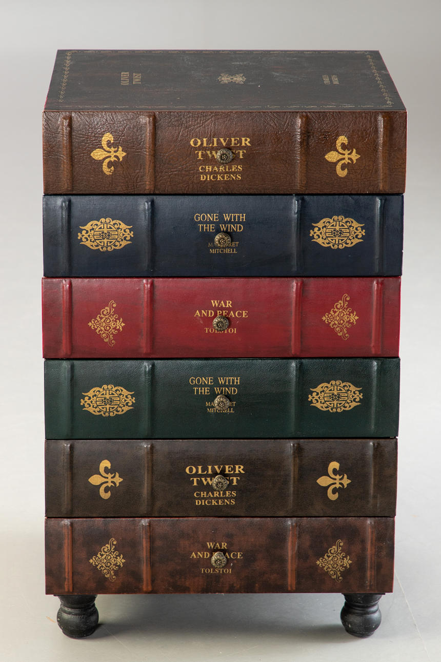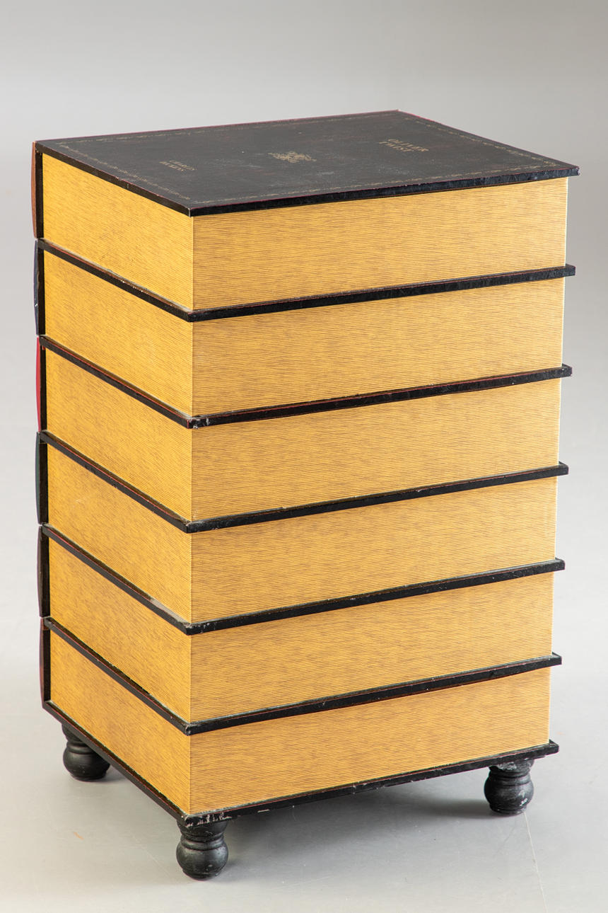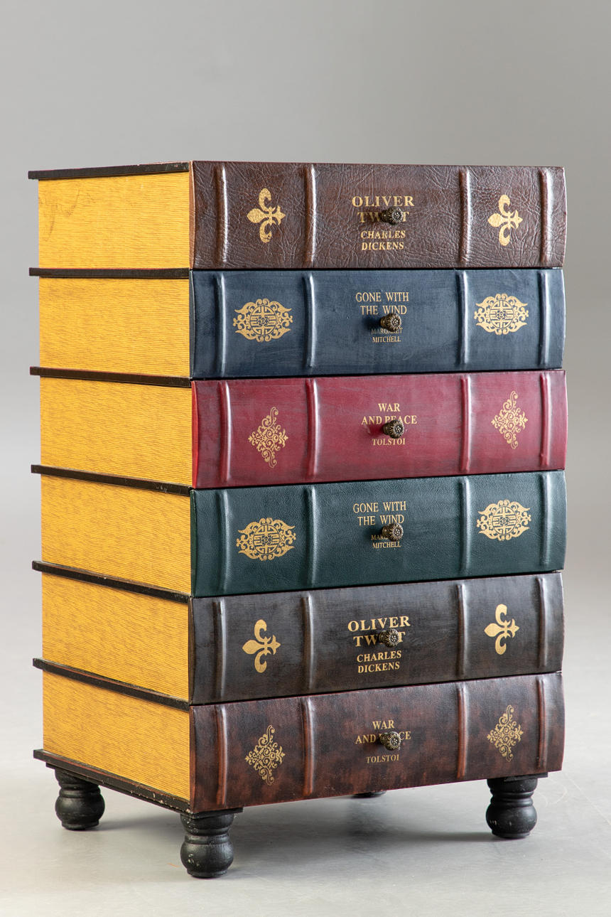 Trä, mattlackerat, guldtryck och täckt med färgat konstläder. Rektangulär kropp dividerat med sex lådor. Fronterna i form av bok ryggar med olika titlar av klassisk litteratur. Tresidig guldslipning. HxBxD: 81,5 x 50 x 42 cm.