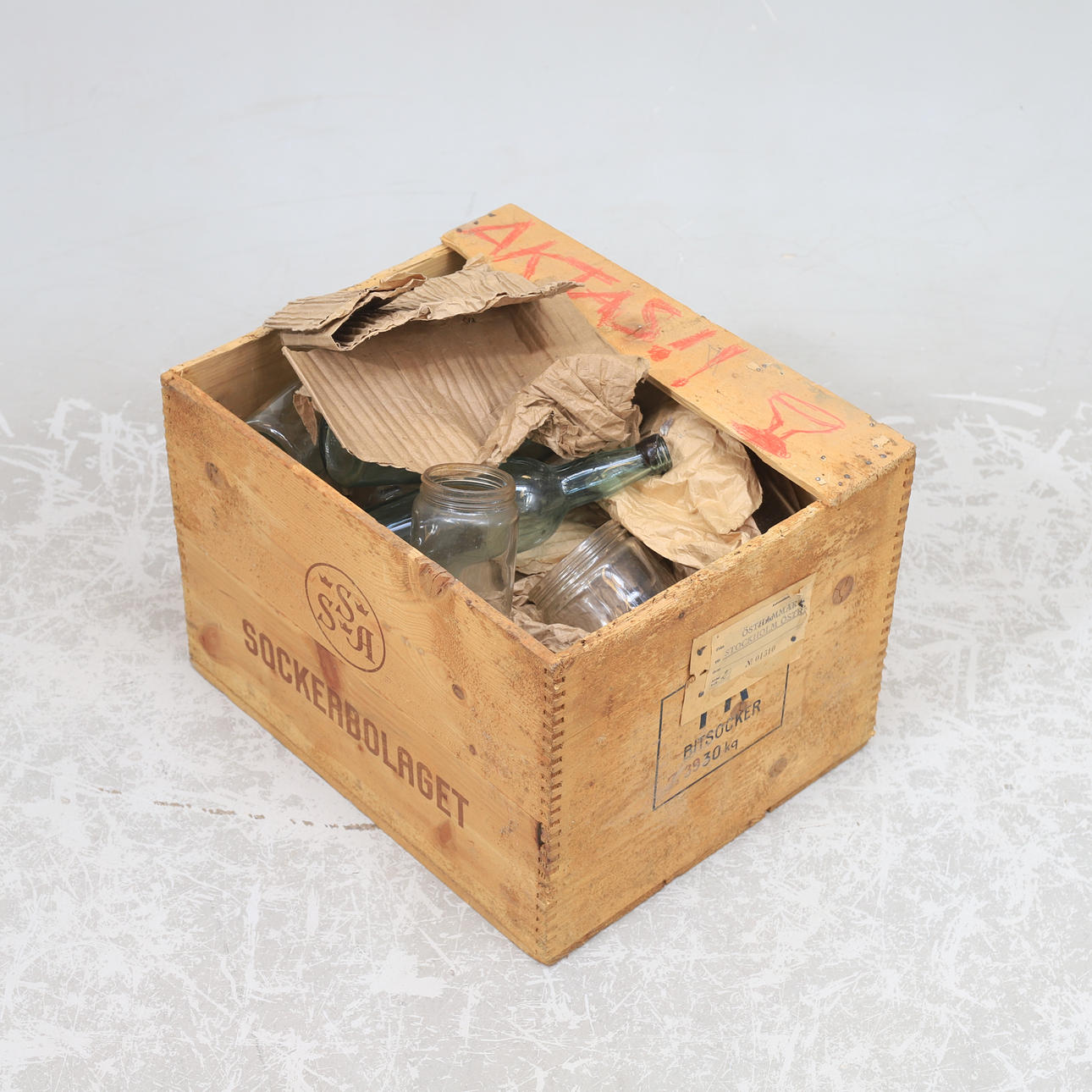Med trälåda från SSA Sockerbolaget. Längd ca 45 cm. Bredd ca 36 cm. Höjd ca 31 cm. Flaskor upp till ca 32 cm.