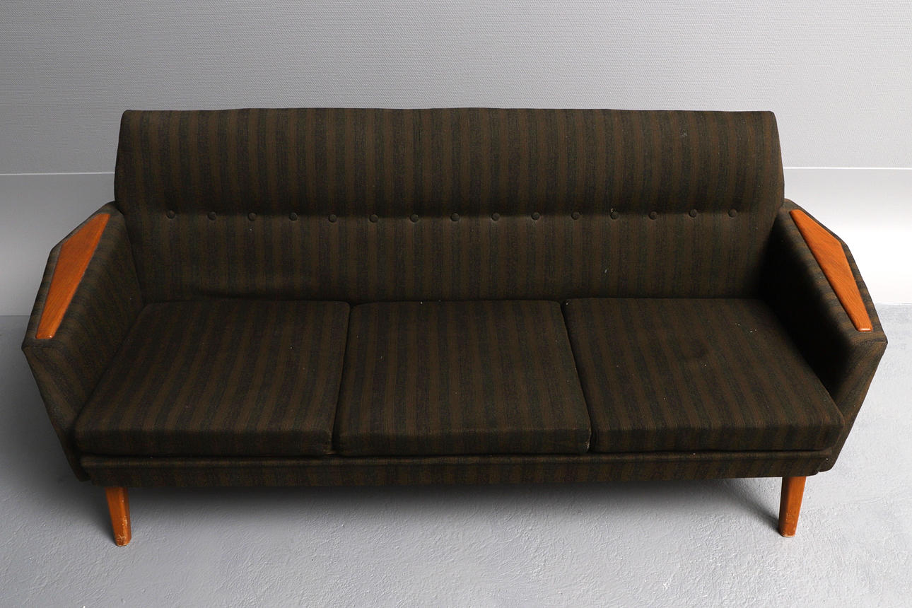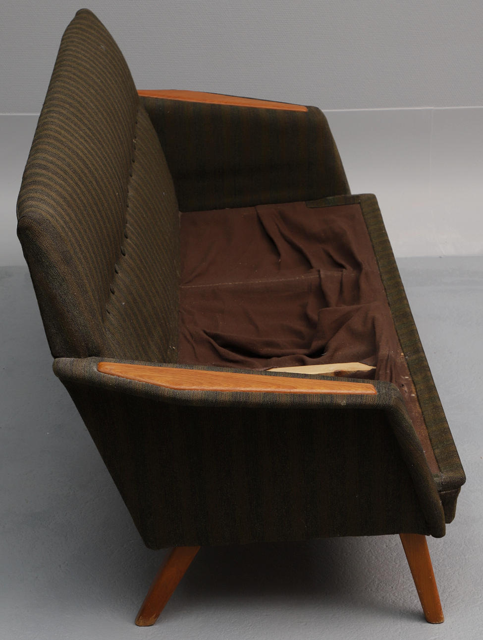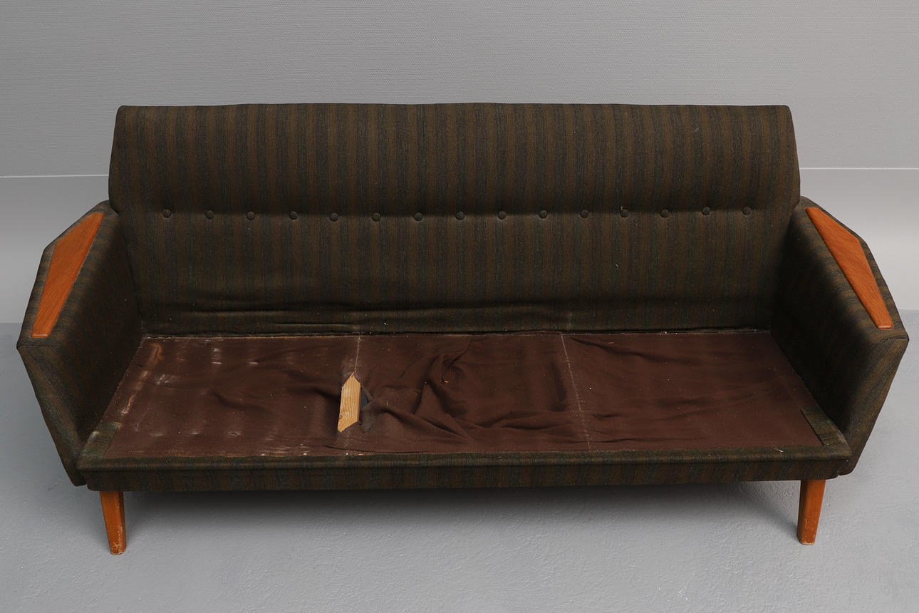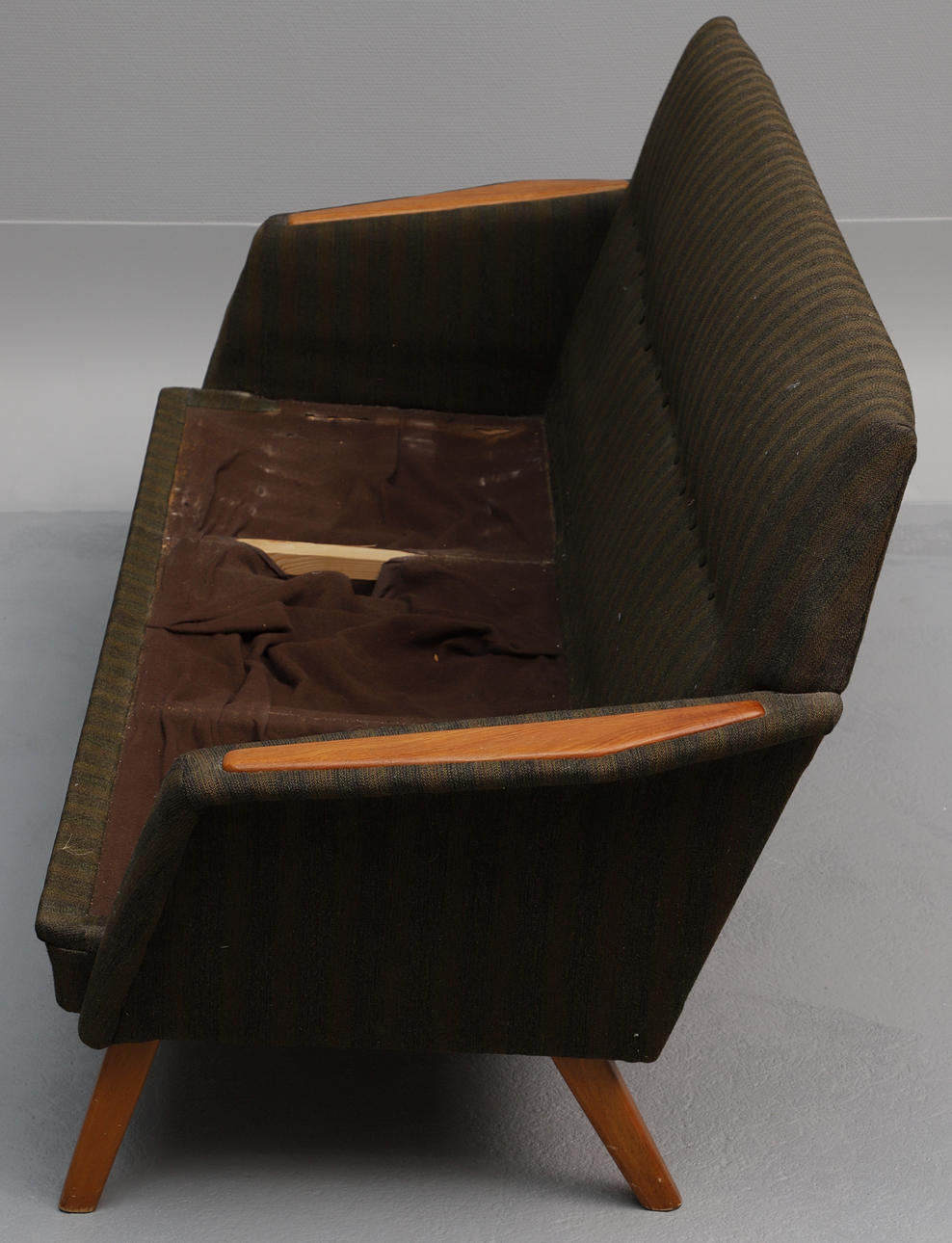 Klädsel i grönrandig textil med armstöd i teak. Bredd ca 194 cm. Sitthöjd ca 38 cm. Rygghöjd ca 75 cm. SIttdjup ca 52.5 cm.