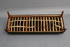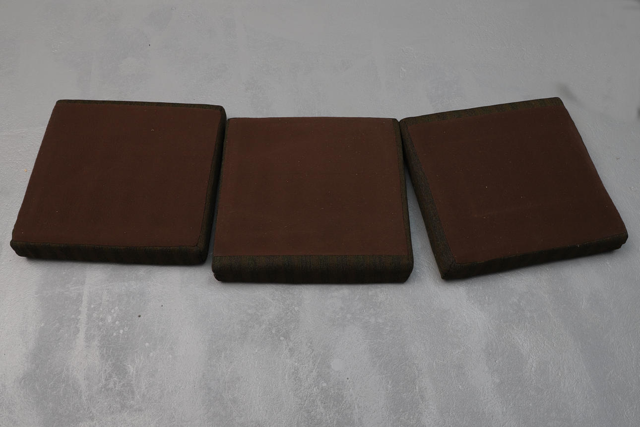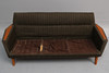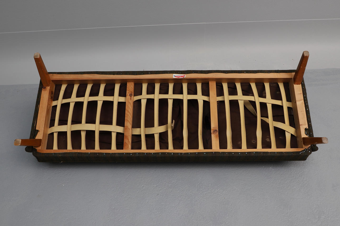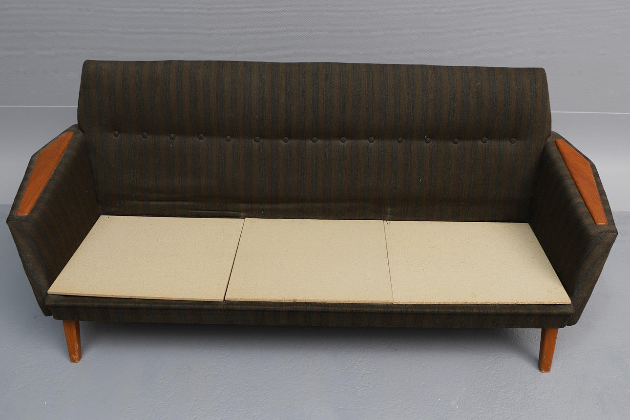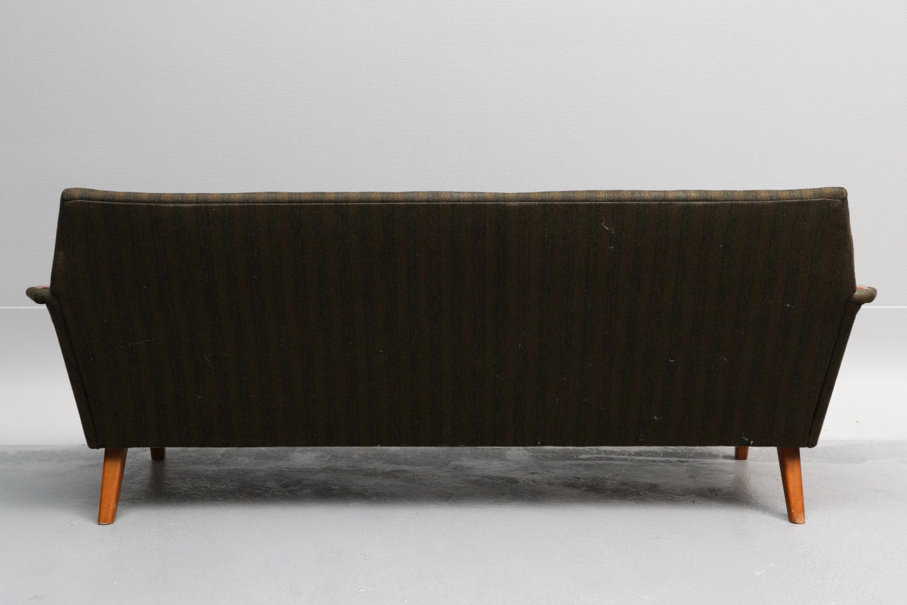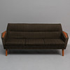 Klädsel i grönrandig textil med armstöd i teak. Bredd ca 194 cm. Sitthöjd ca 38 cm. Rygghöjd ca 75 cm. SIttdjup ca 52.5 cm.