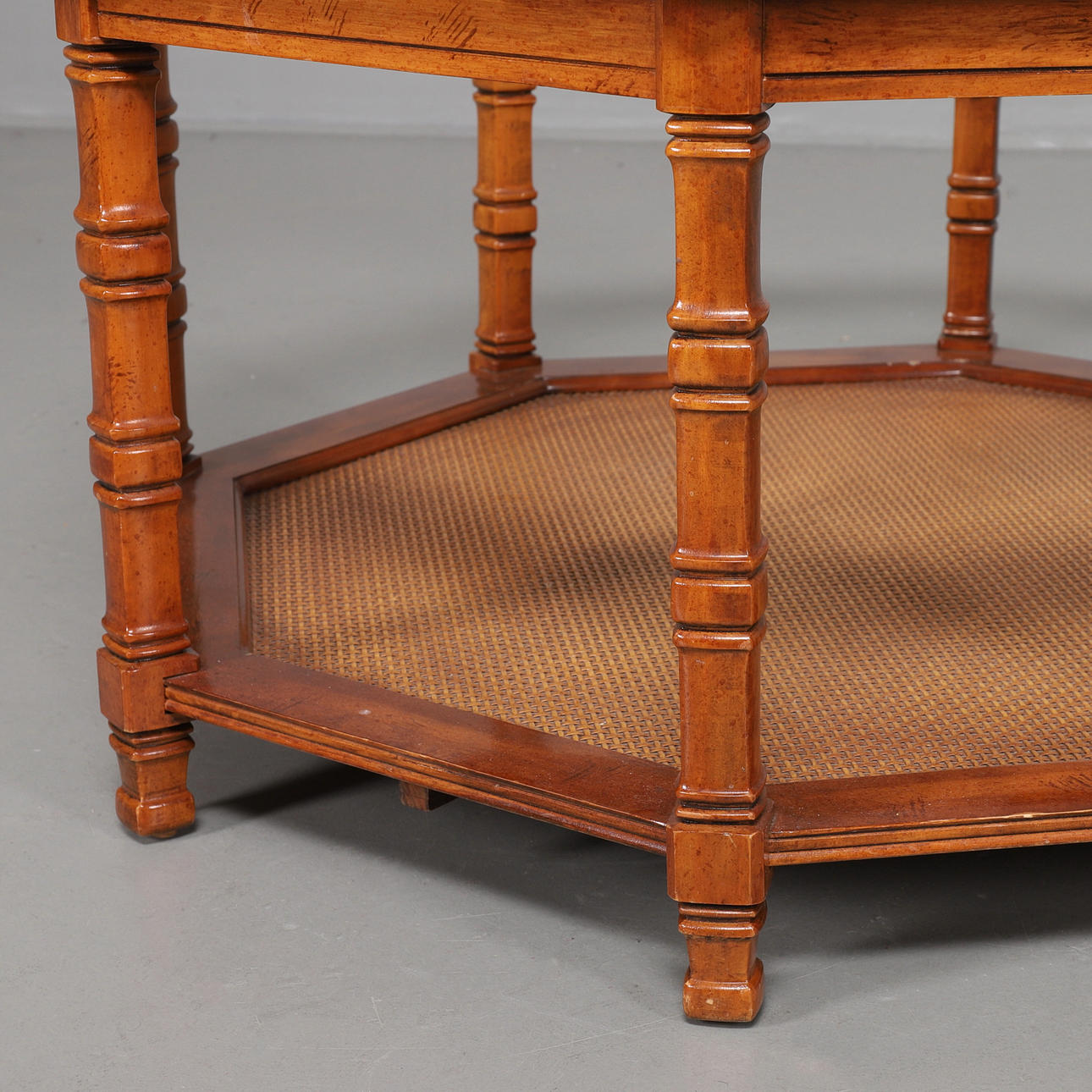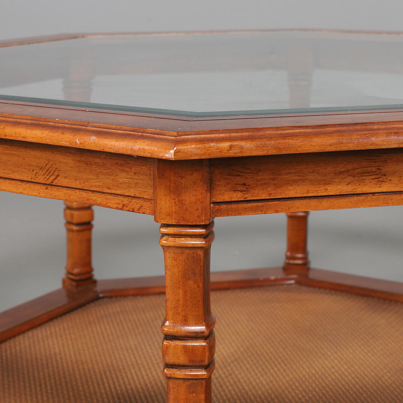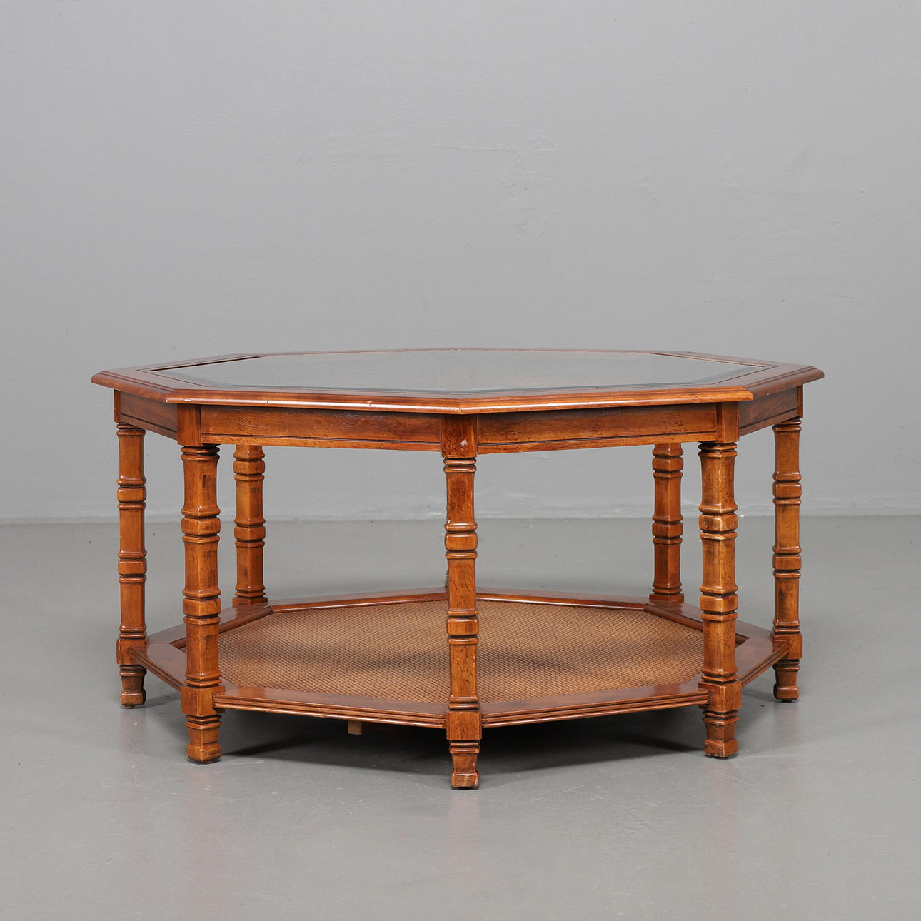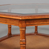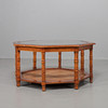 Stomme i idegran, glasskiva och tidningshylla i rotting. Diameter 96 cm, höjd 49 cm.