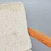 SOFFA/SOFFA, teak, ull, 1970-tal, Danmark. Tre-sits soffa med furu ram med armstöd, sits täckt med brunt tyg och försedd med lös beige fläckig ullklädsel, H.70cm, sitthöjd: 40cm, l.205cm, W.80cm.