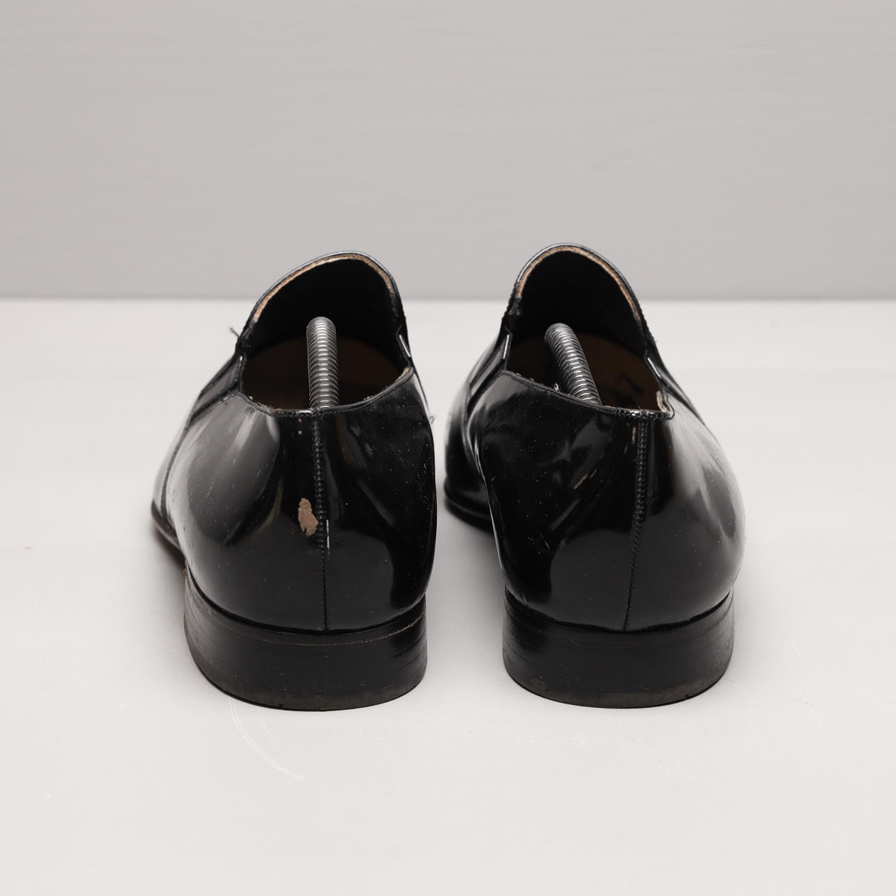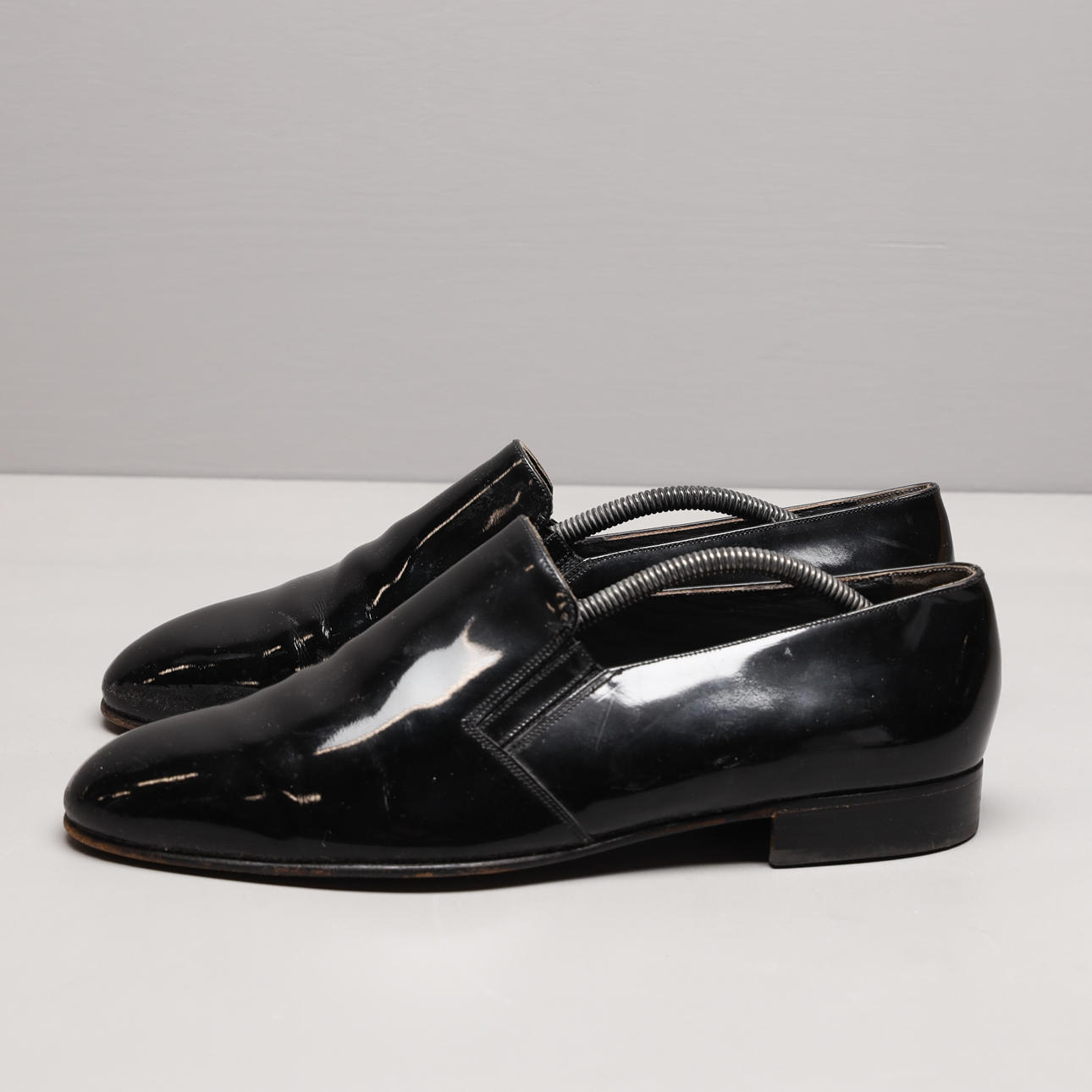 Smokingsko i svart lack med lädersula. Storl 10 motsvarande 44. Skoblock i trä medföljer.