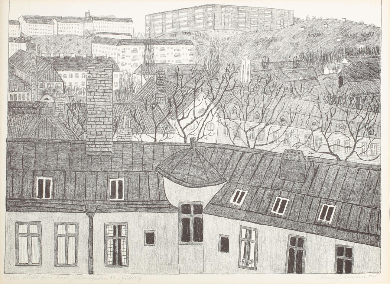 "Brobergs tobakshandel", 125/383 bildyta 62 x 45 cm, "Utsikt från Karl Johansgatan 62", 89/415 bladmått 39, x 53,5 cm.