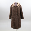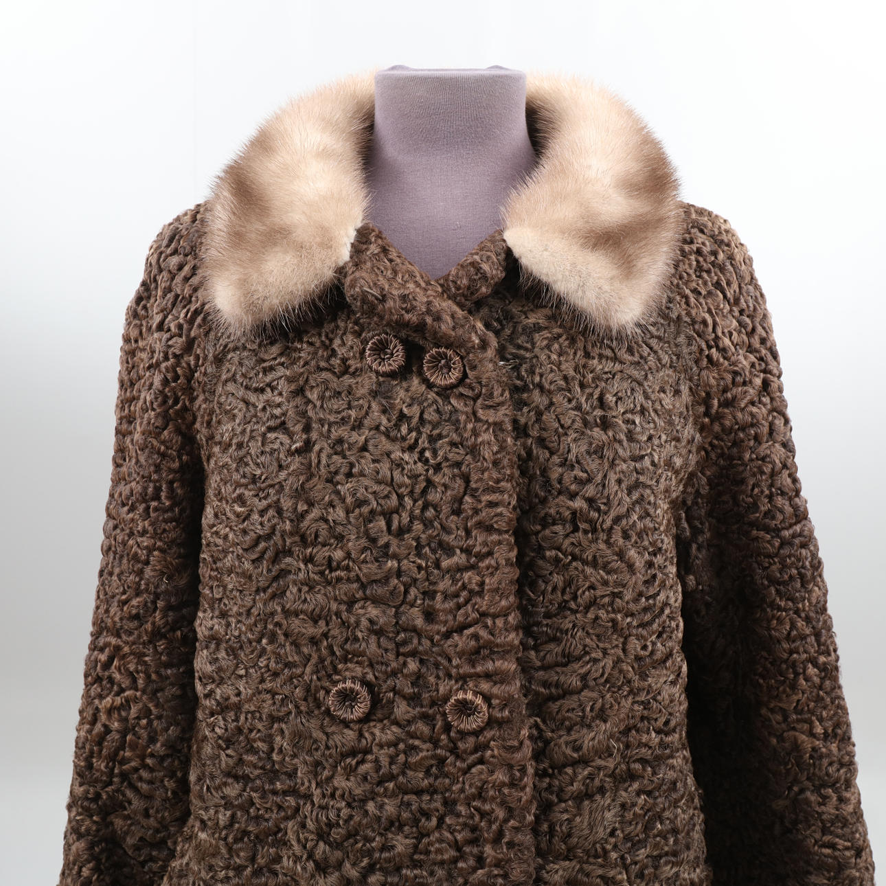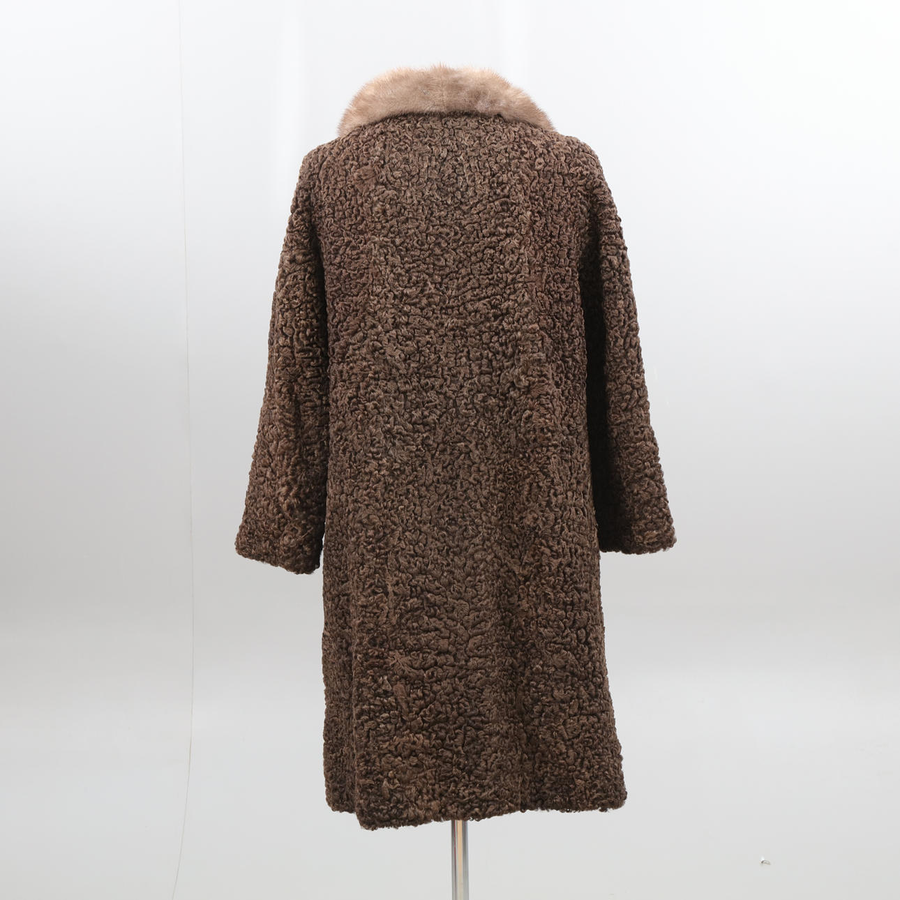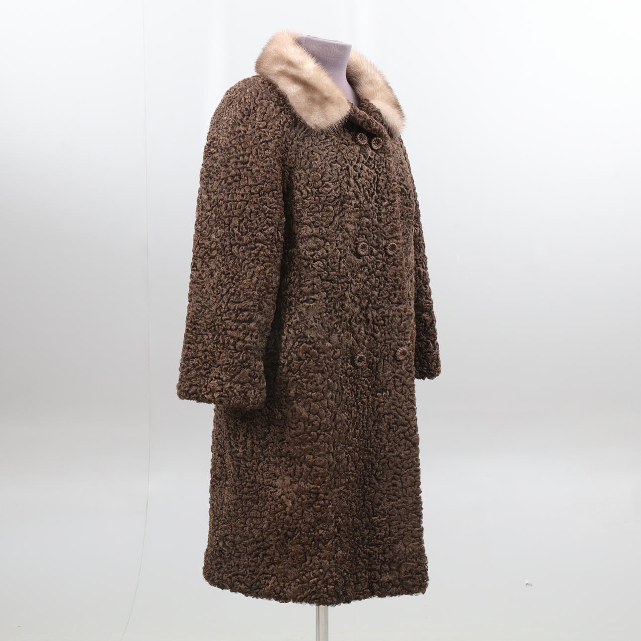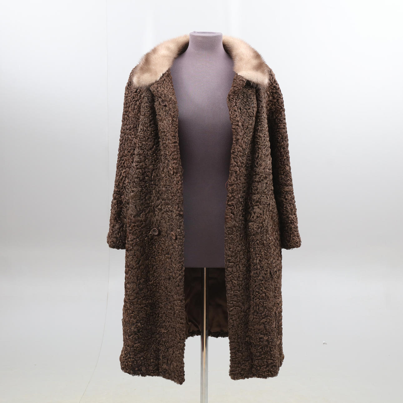 Brun persianpäls med beige pälskrage, omärkt. Stängs med hyskor.