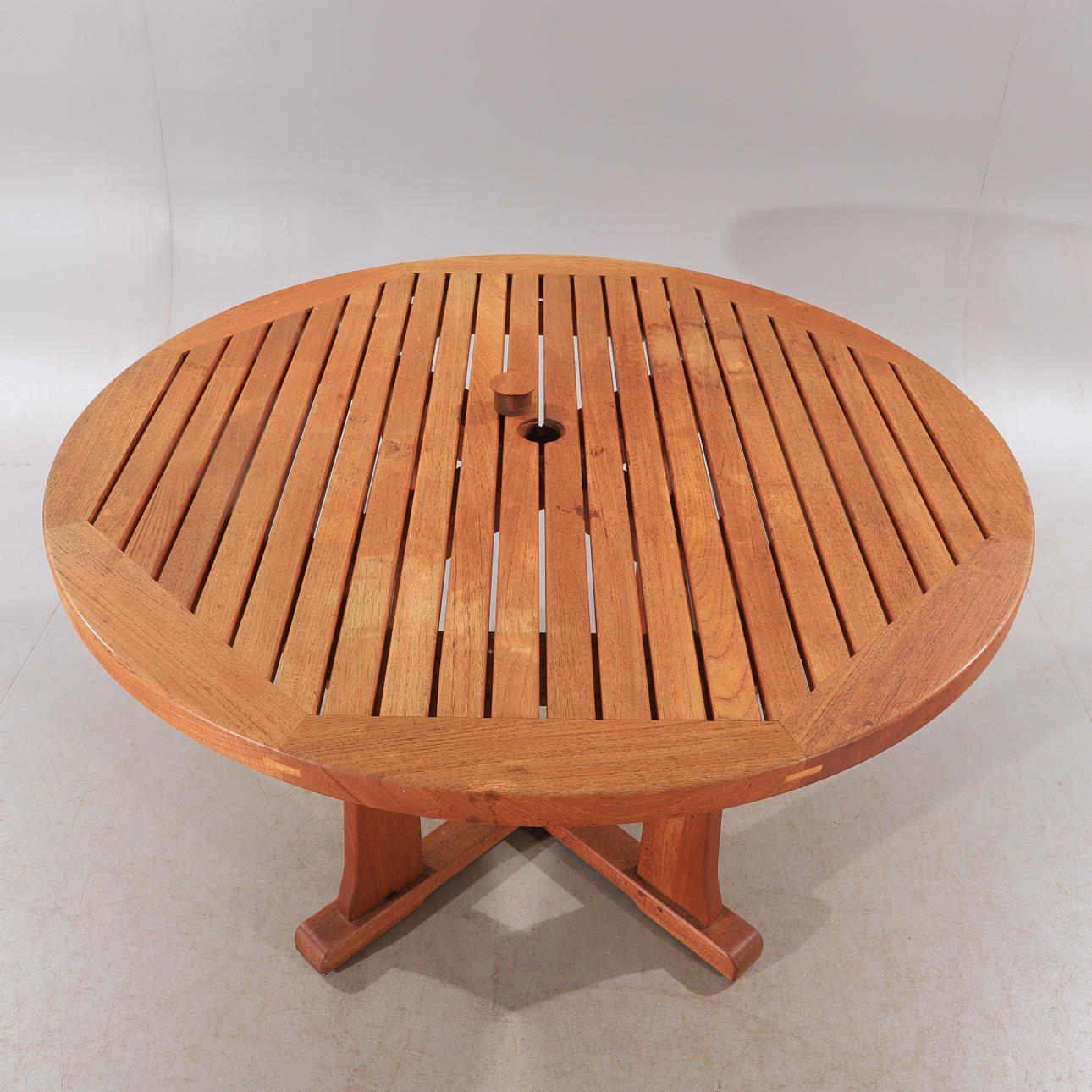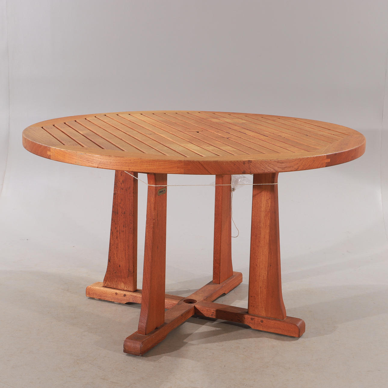 Bord samt 4 hopfällbara stolar. Bordets diameter 122, höjd 70 cm.