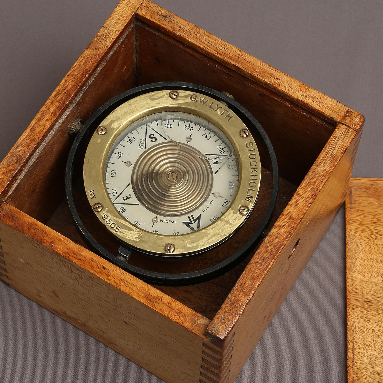 Kompass Lyth, märkt G. W. Lyth, Stockholm, No 9505, med låda. Lådans mått 17 x 17, höjd 12,5 cm.