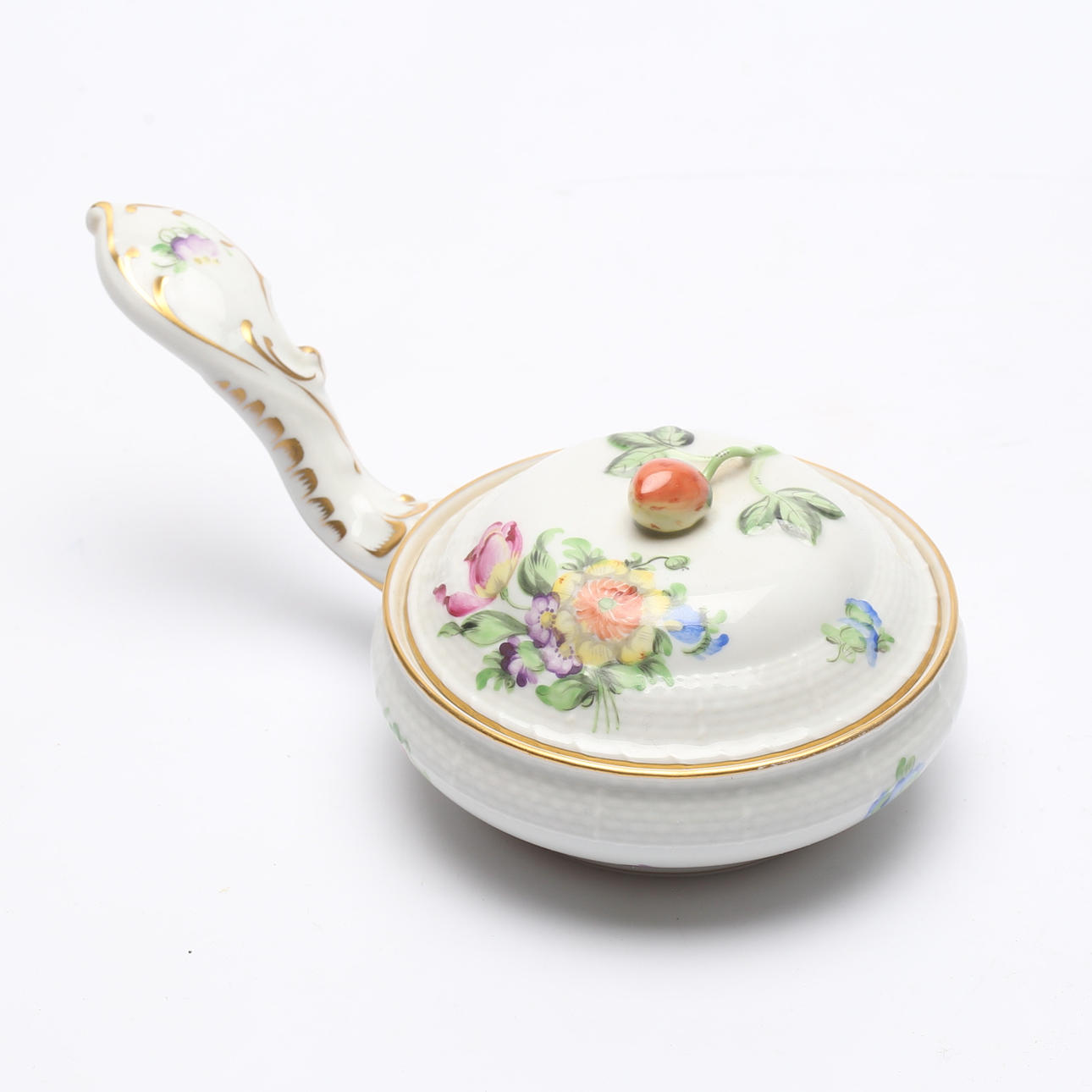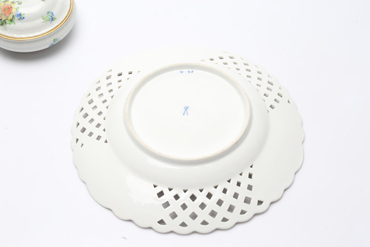 Fat med genombruten dekor, Meissen, diameter ca. 24 cm. Skål med lock, Herend, längd ca. 19 cm.