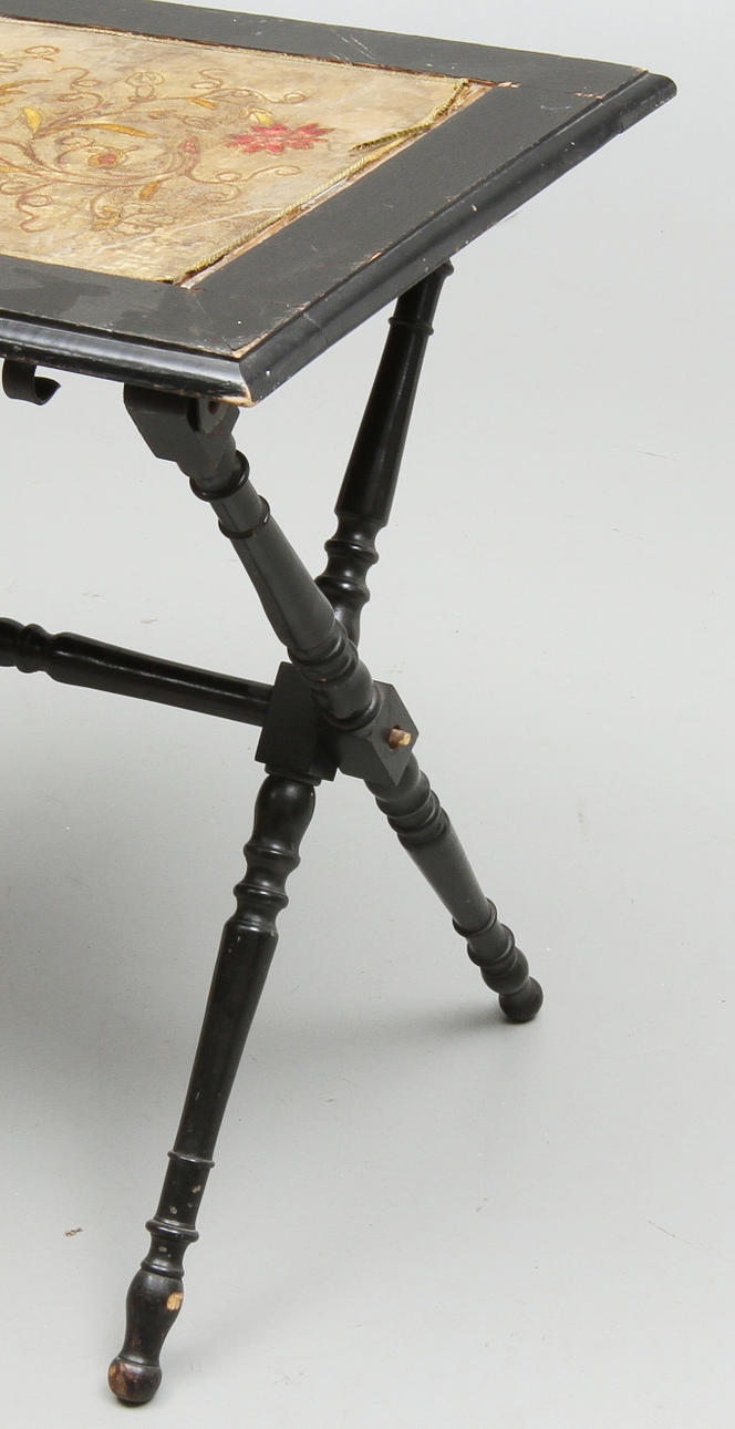 Skiva med brodyr. Längd 72, bredd 52, höjd 69 cm.