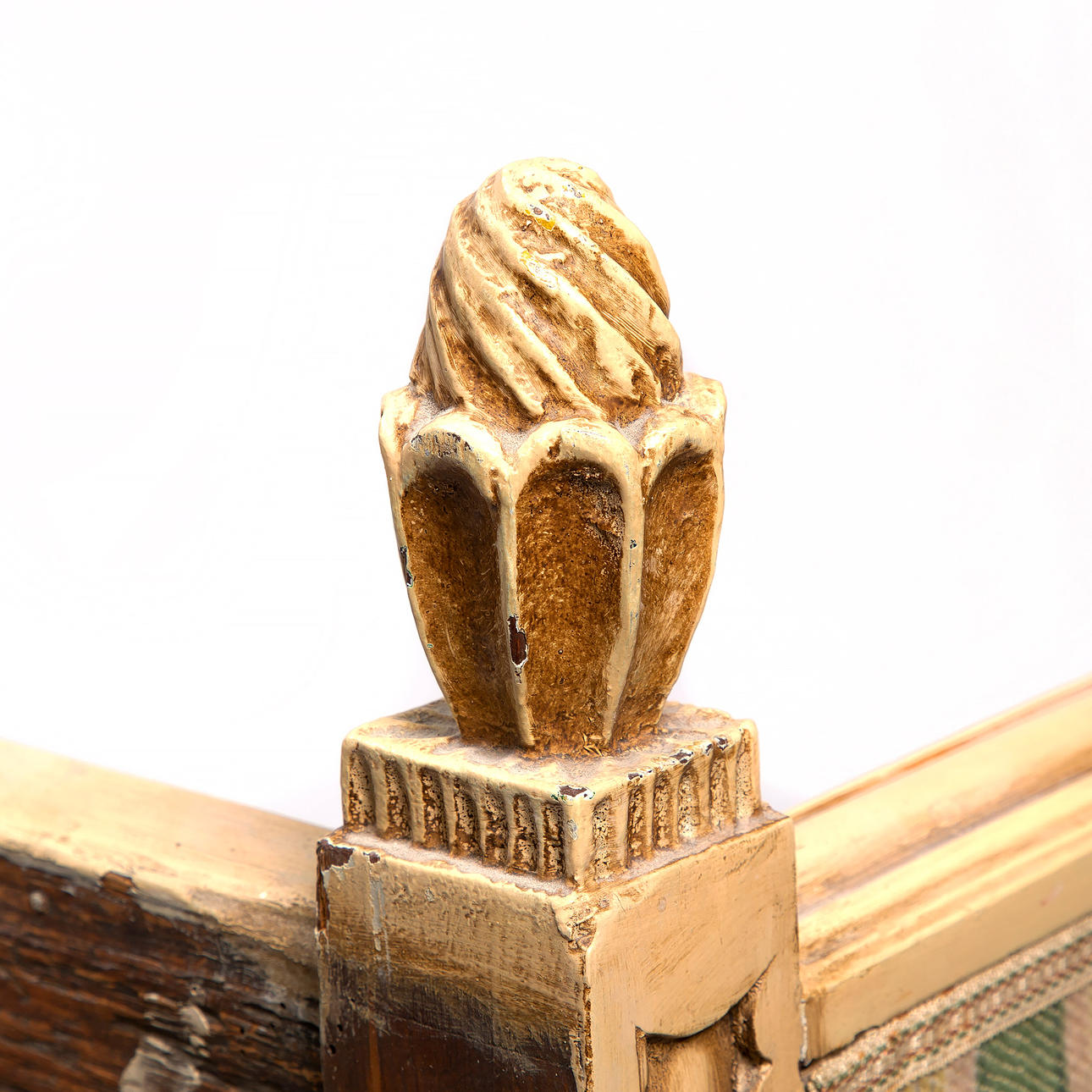 Sarg och rygg med dekor av bladverk. Fyrsidigt avsmalnande ben. Längd 190 cm, bredd 73 cm, höjd 98 cm. Sitthöjd 44 cm.