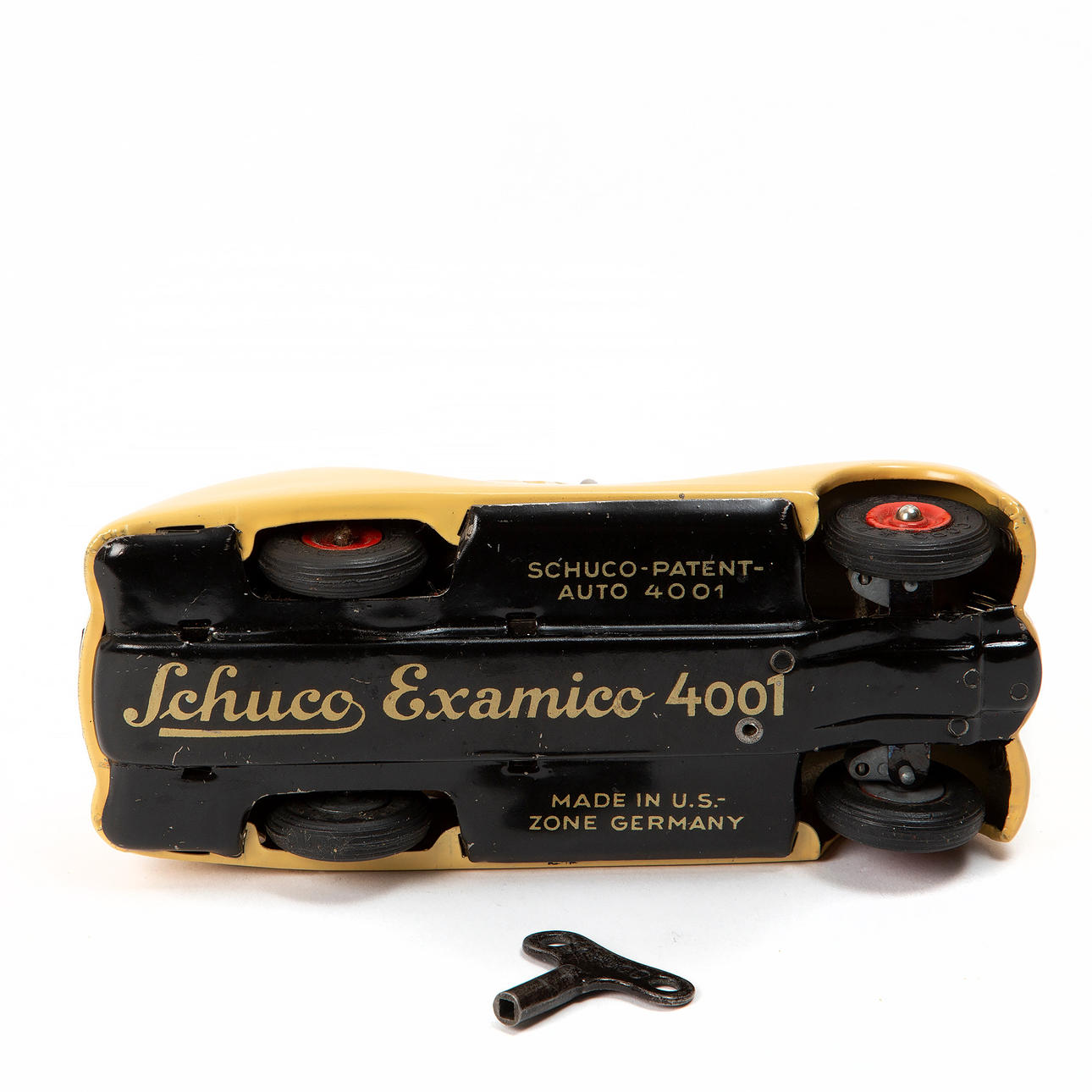 Modellbil, plåt. Urverk. Med nyckel. Längd 14 cm.