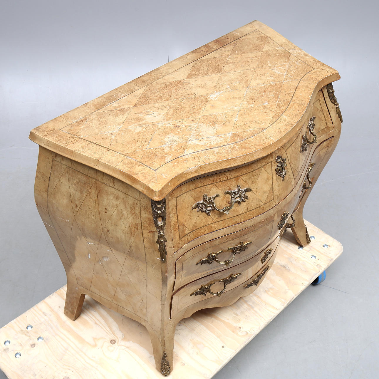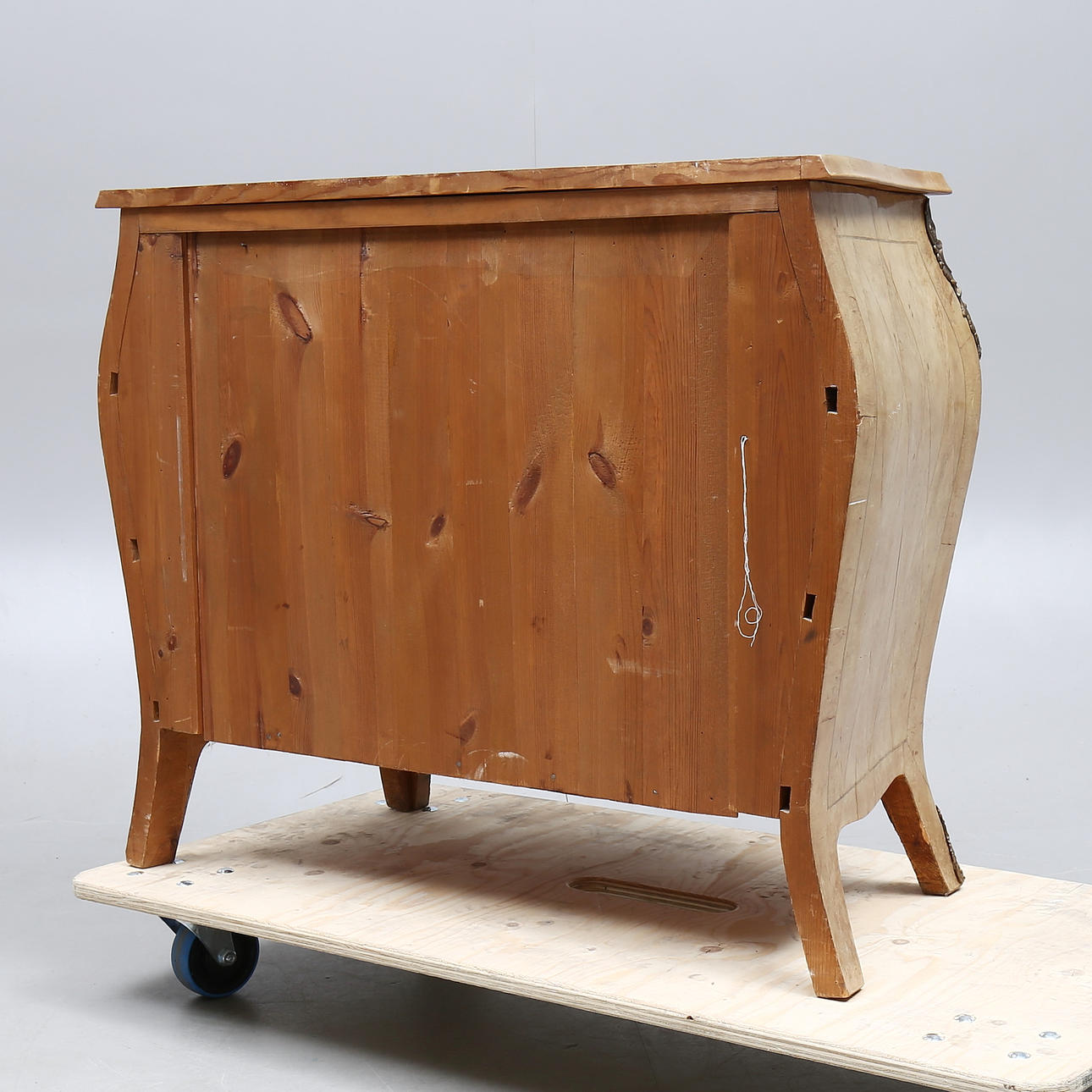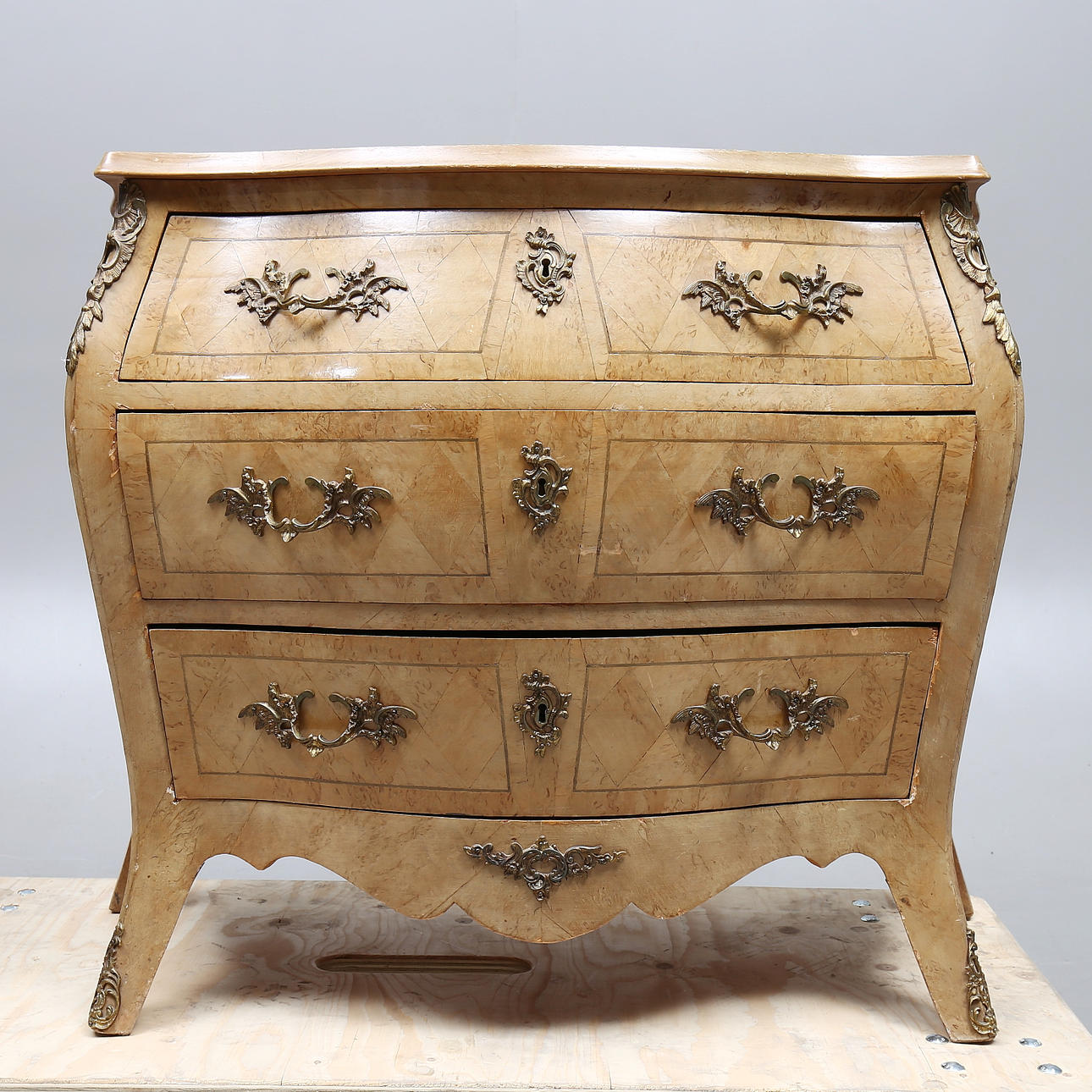 Välvd form, fanérad i masur. Bronserade beslag. Bredd 90, djup 50, höjd 75 cm.