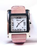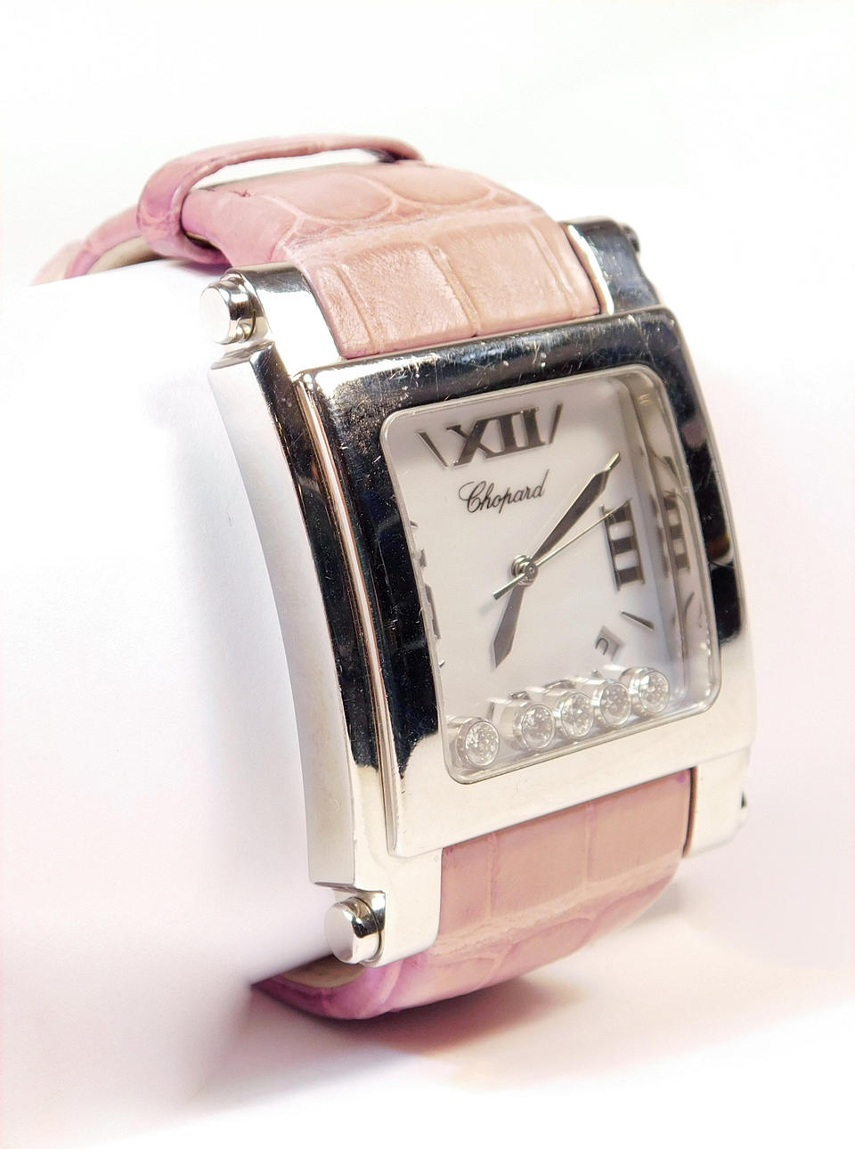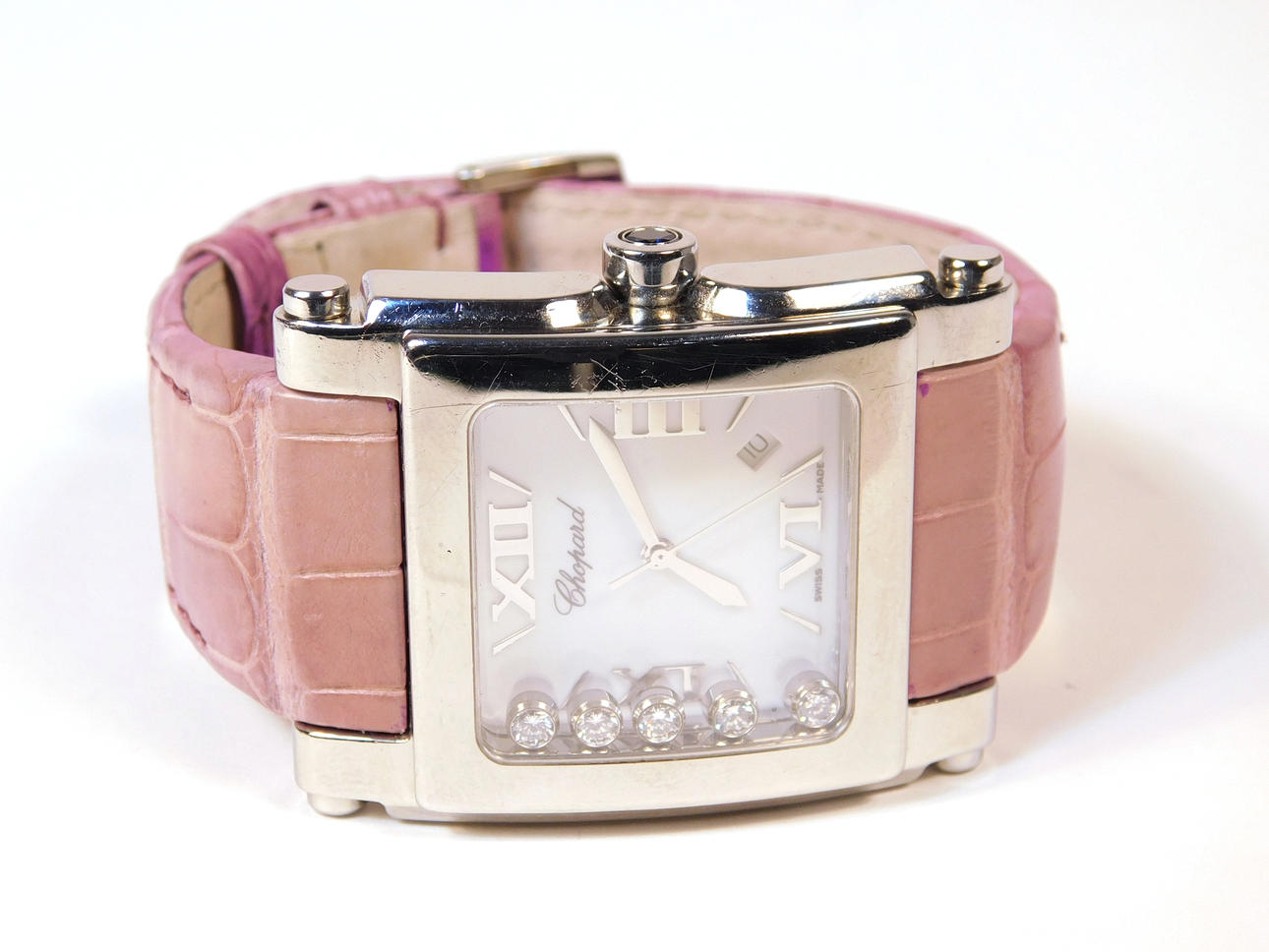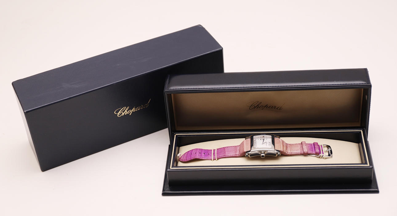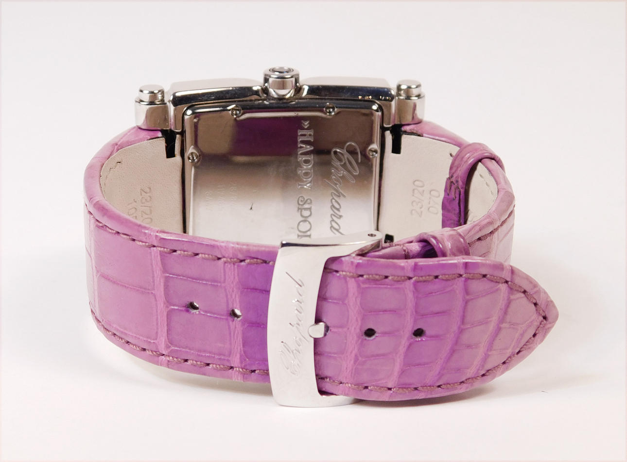 Kvarts urverk i stål med läderband i lila toner. Urtavla med fem dekorativa strass. 35 mm. Med låda och dokumentation.