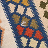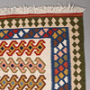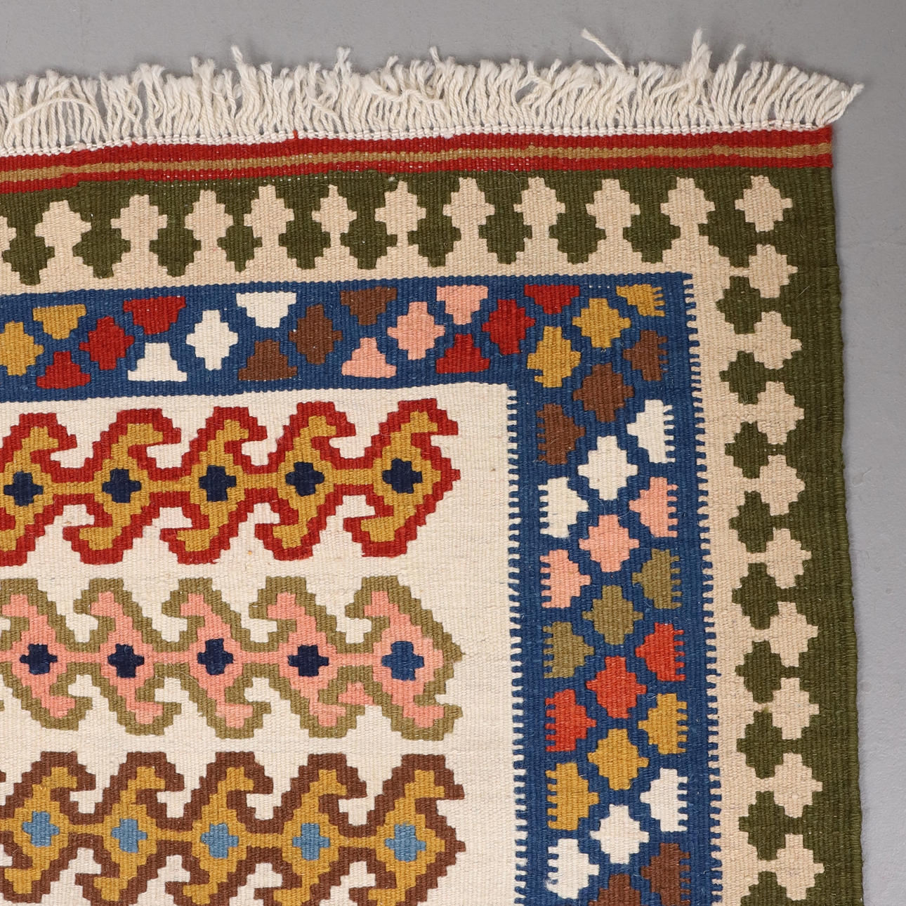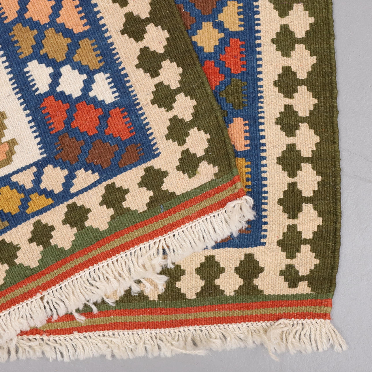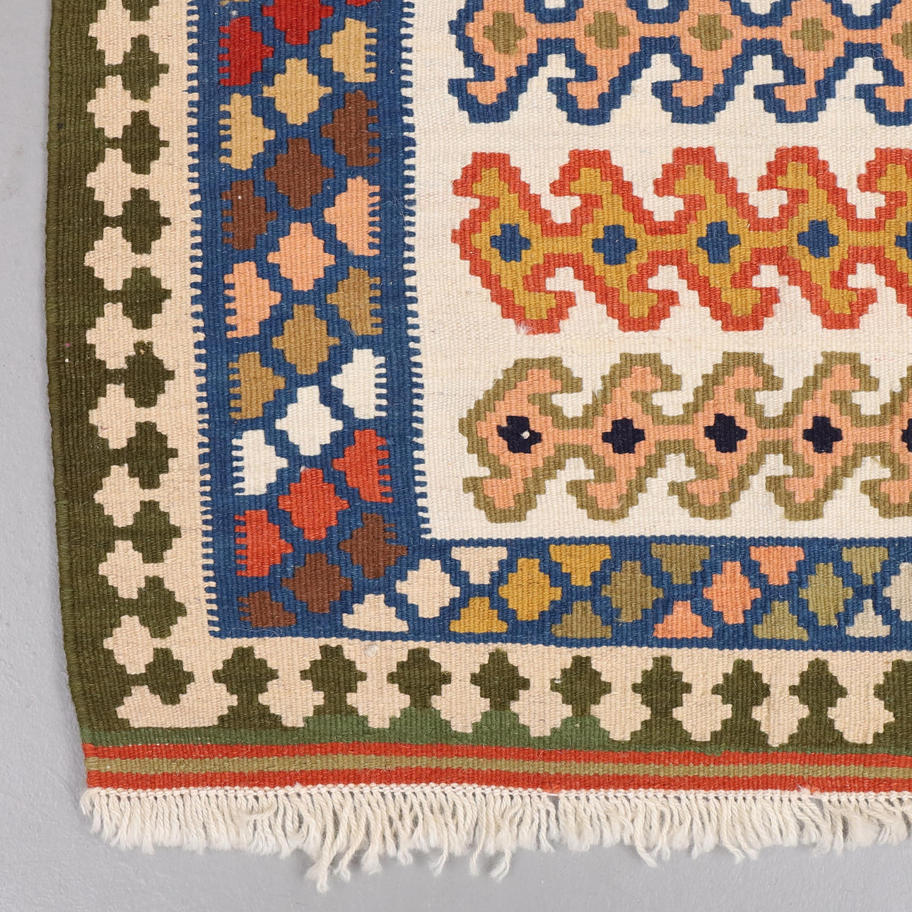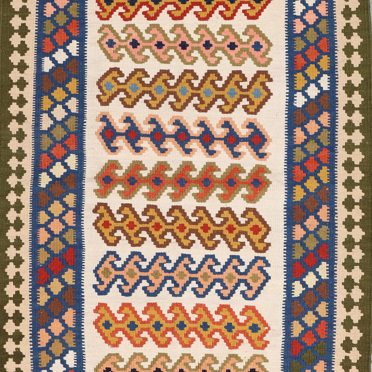 Flatvävd kelimmatta helt i ull, traditionellt mönster i bred färgskala.