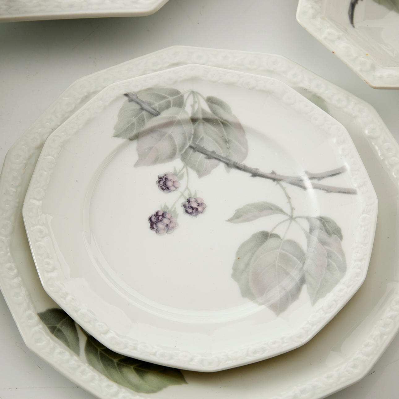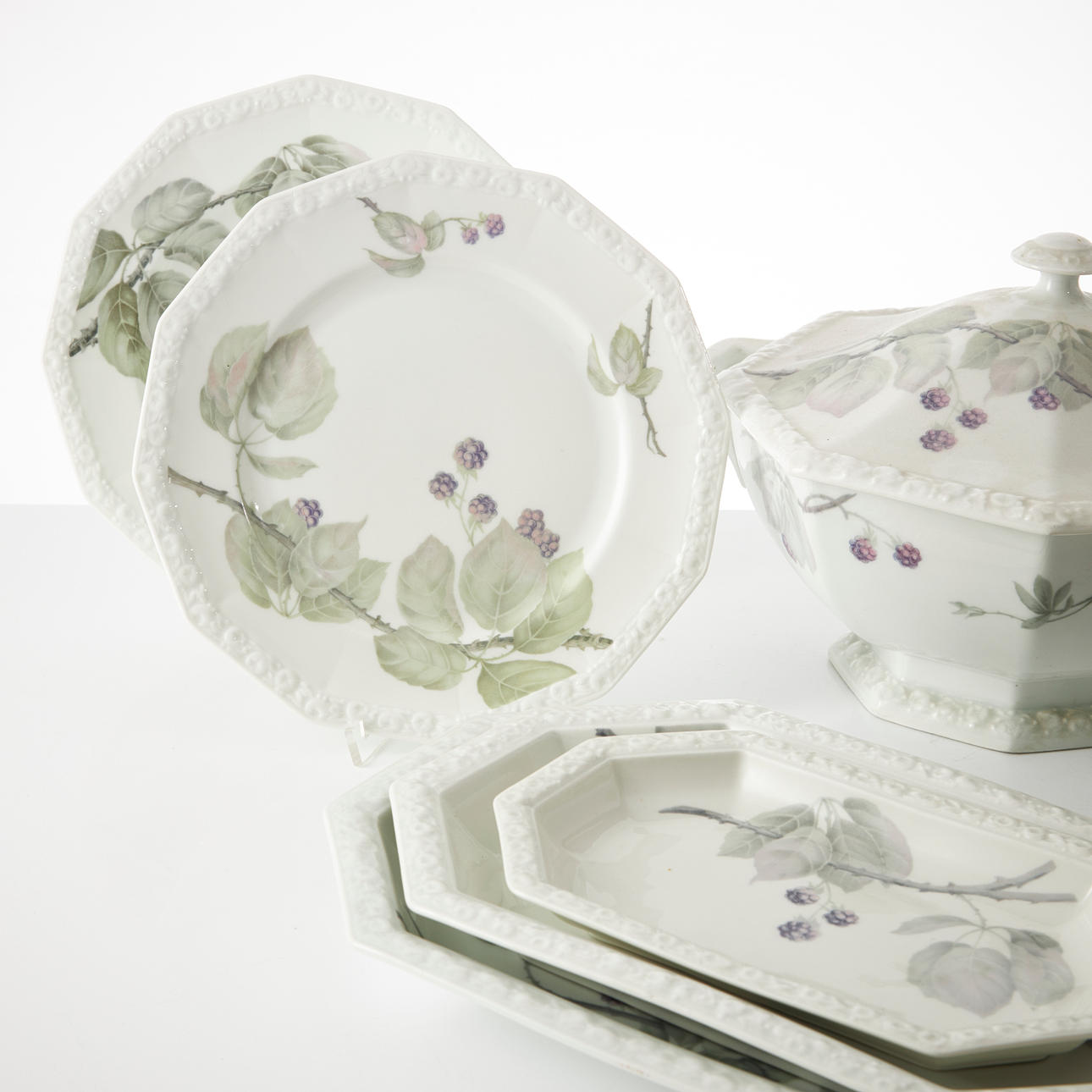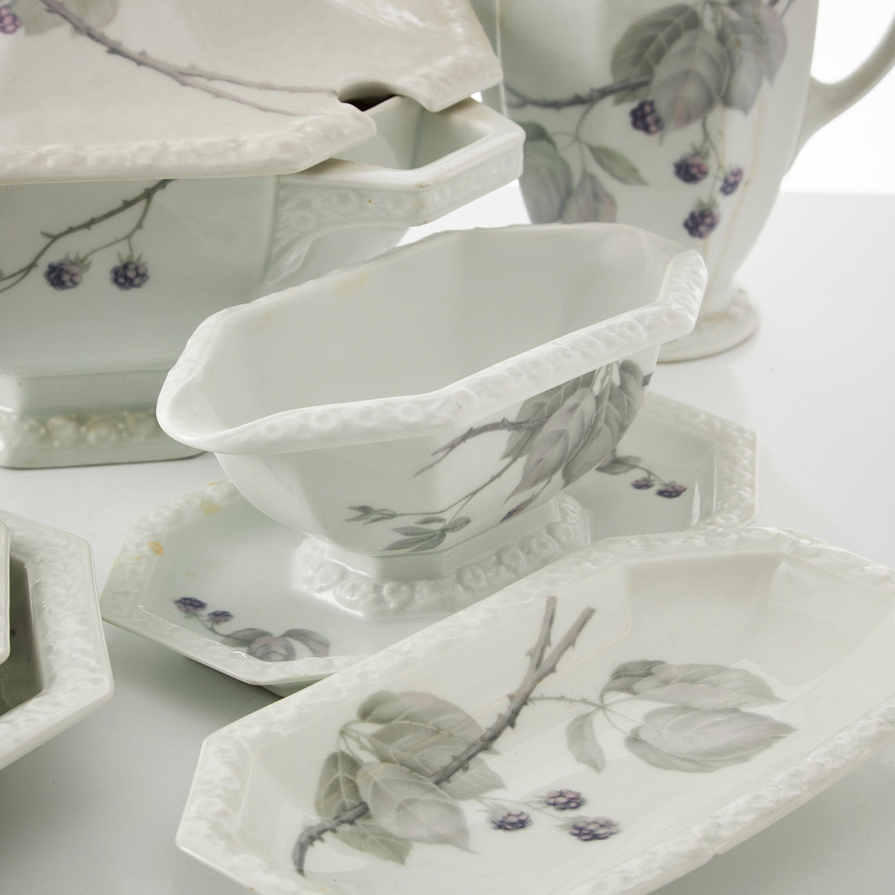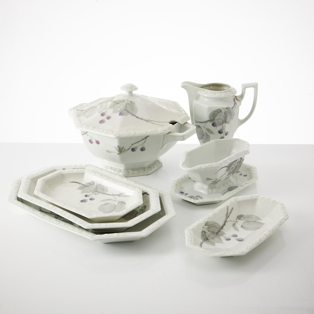Bestående av 8 uppläggningsfat, varav ett par på fot, 15 förrättsfat, 18 mattallrikar, 7 djupa tallrikar, 12 assietter, 3 koppar- två fat, kanna, såskanna, terrin med lock.