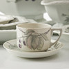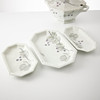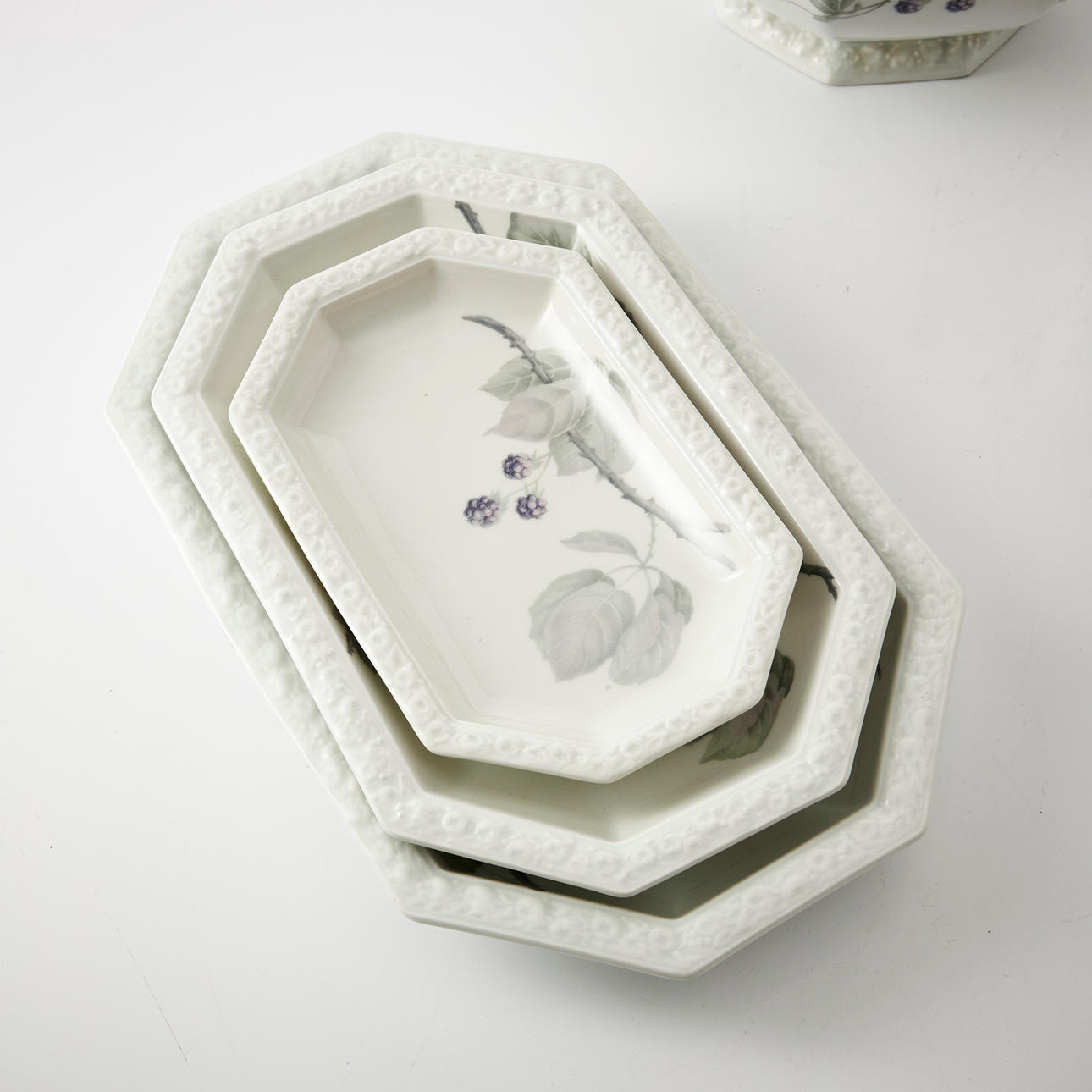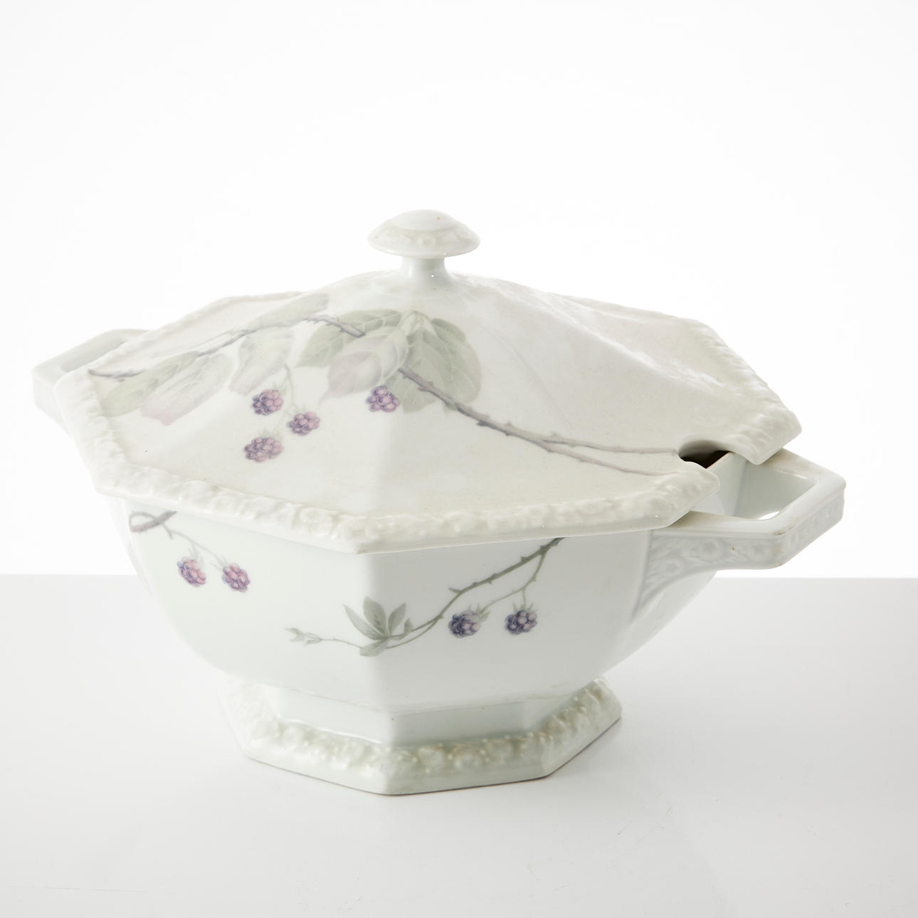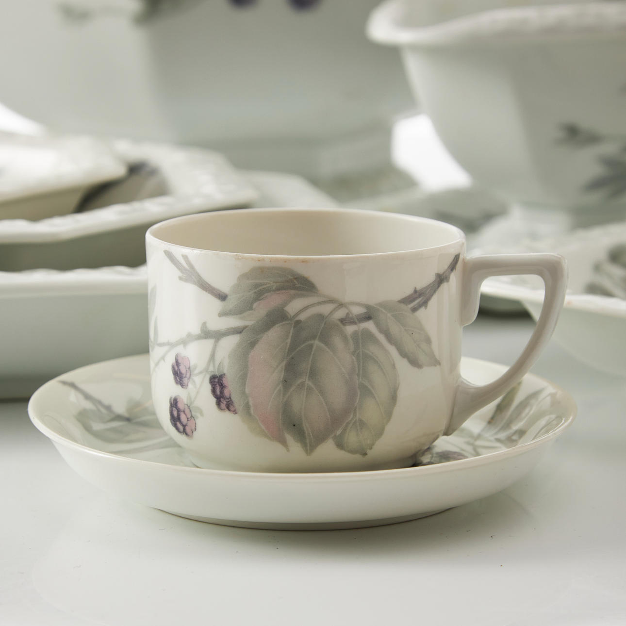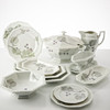 Bestående av 8 uppläggningsfat, varav ett par på fot, 15 förrättsfat, 18 mattallrikar, 7 djupa tallrikar, 12 assietter, 3 koppar- två fat, kanna, såskanna, terrin med lock.
