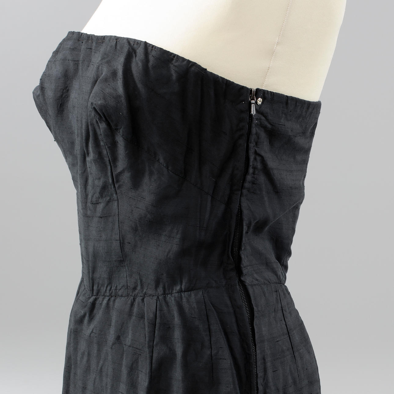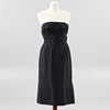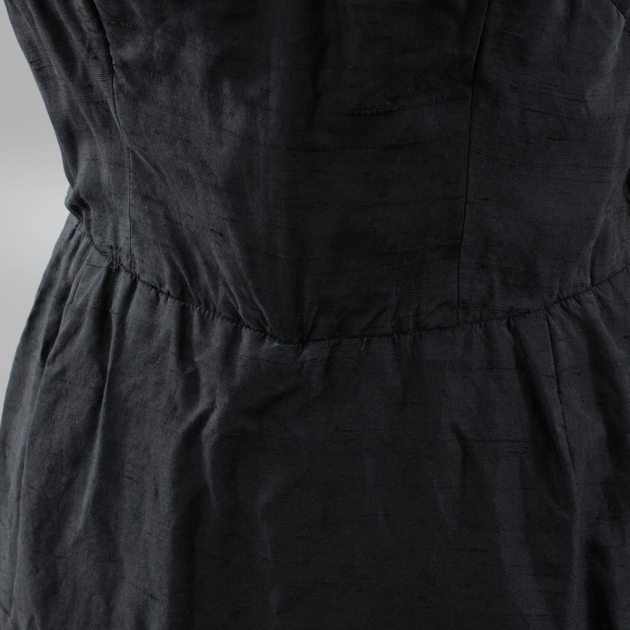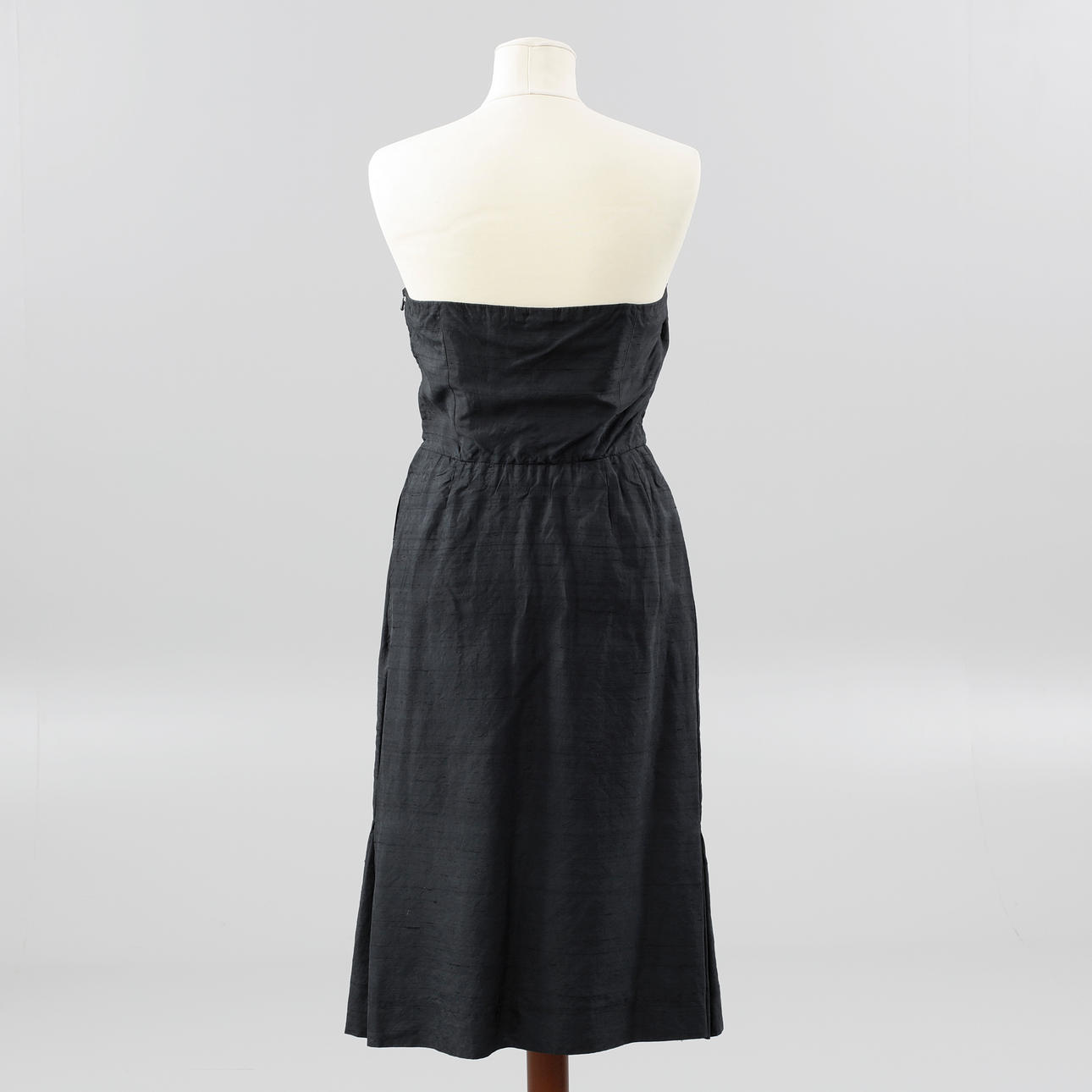 Skräddarsydd klänning med korsettliv. Midjemått 68 cm, bystvidd ca 85 cm. Kjolens längd 69 cm.