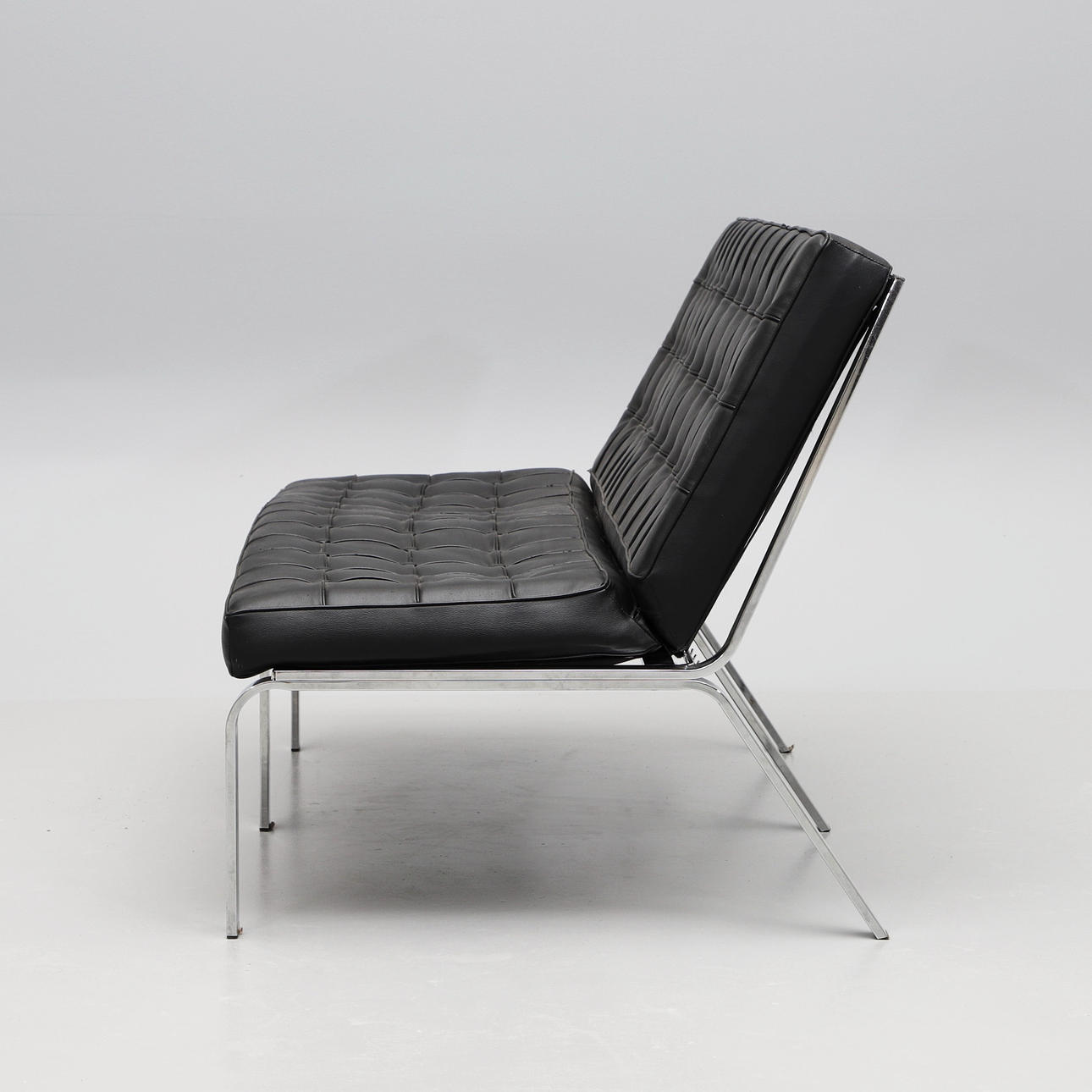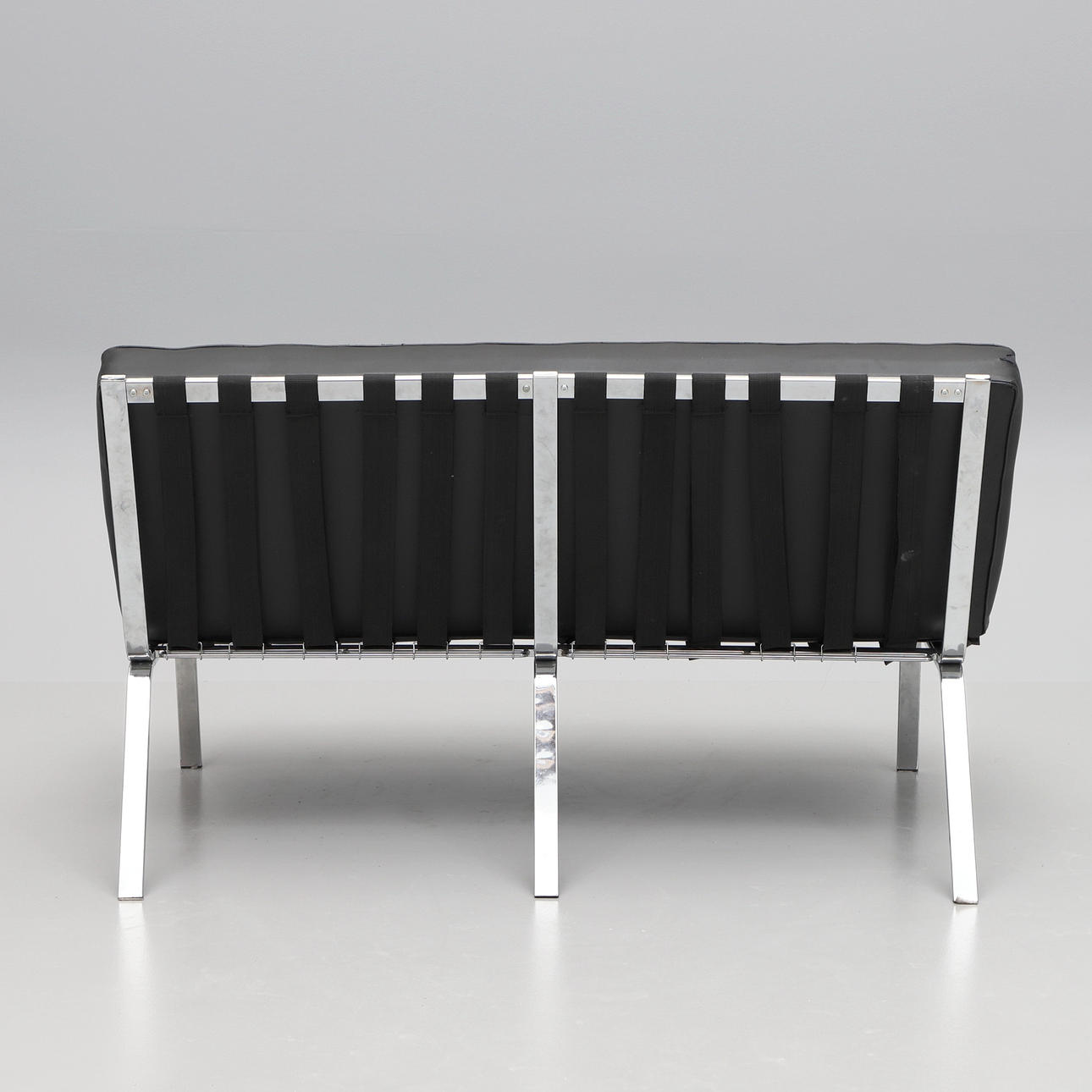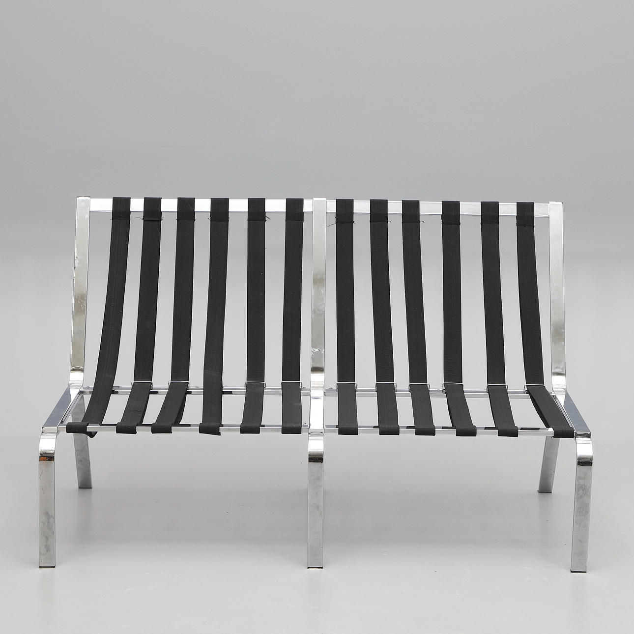 Stomme i kromad metall. Djuphäftad konstskinn.Två fästen till sadelgjorden saknas. Längd 140 cm. Sitthöjd ca 45 cm.