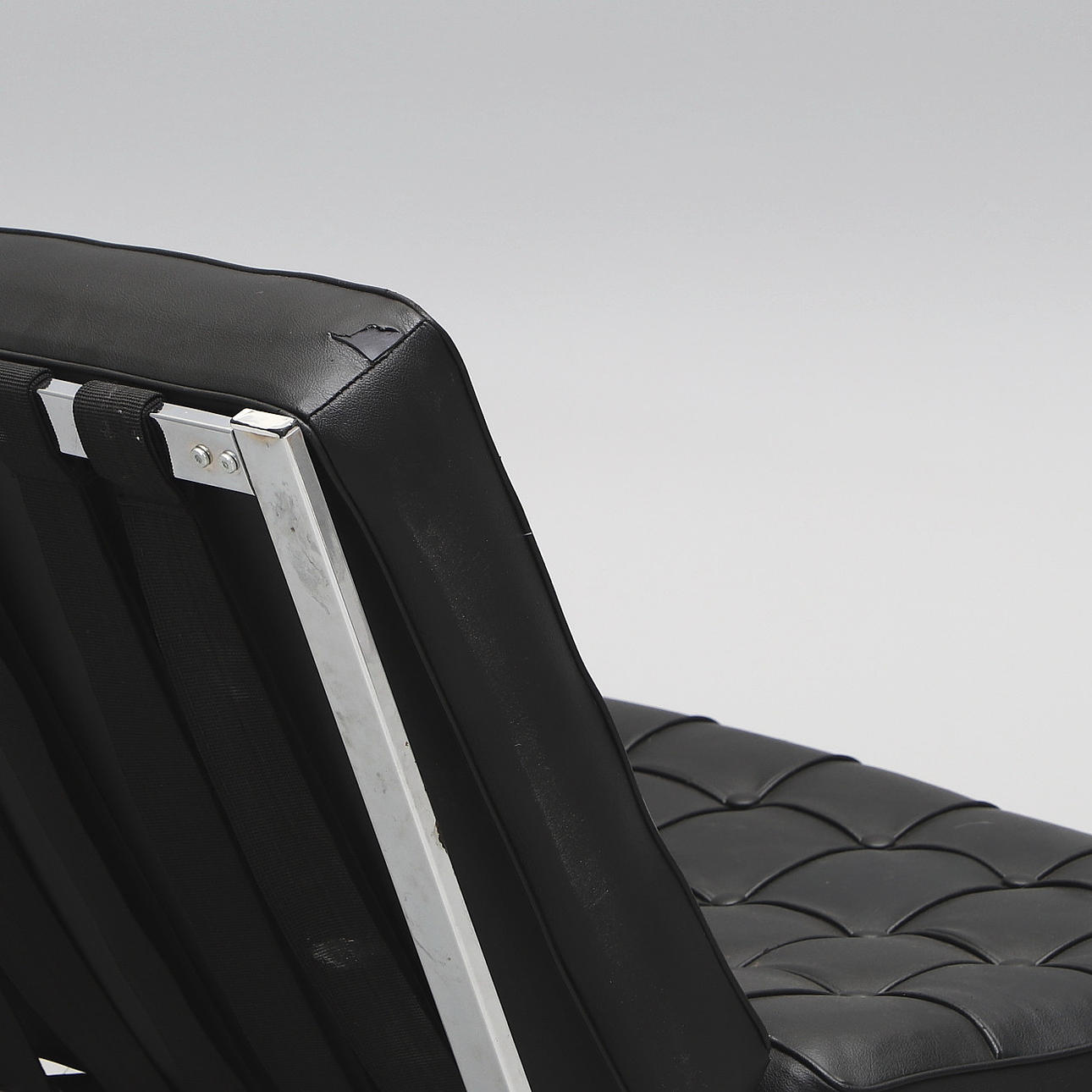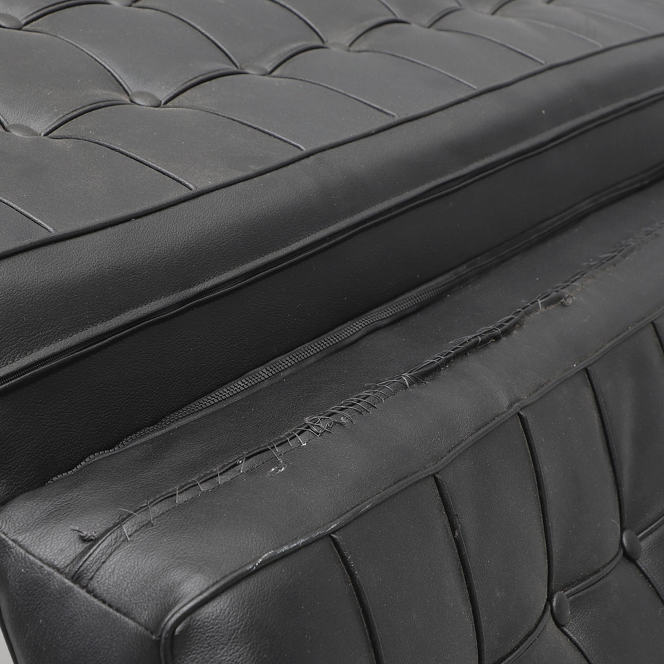 Slitage. Ena sittdynan saknar blixtlås, lagat med tråd.