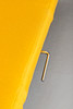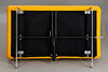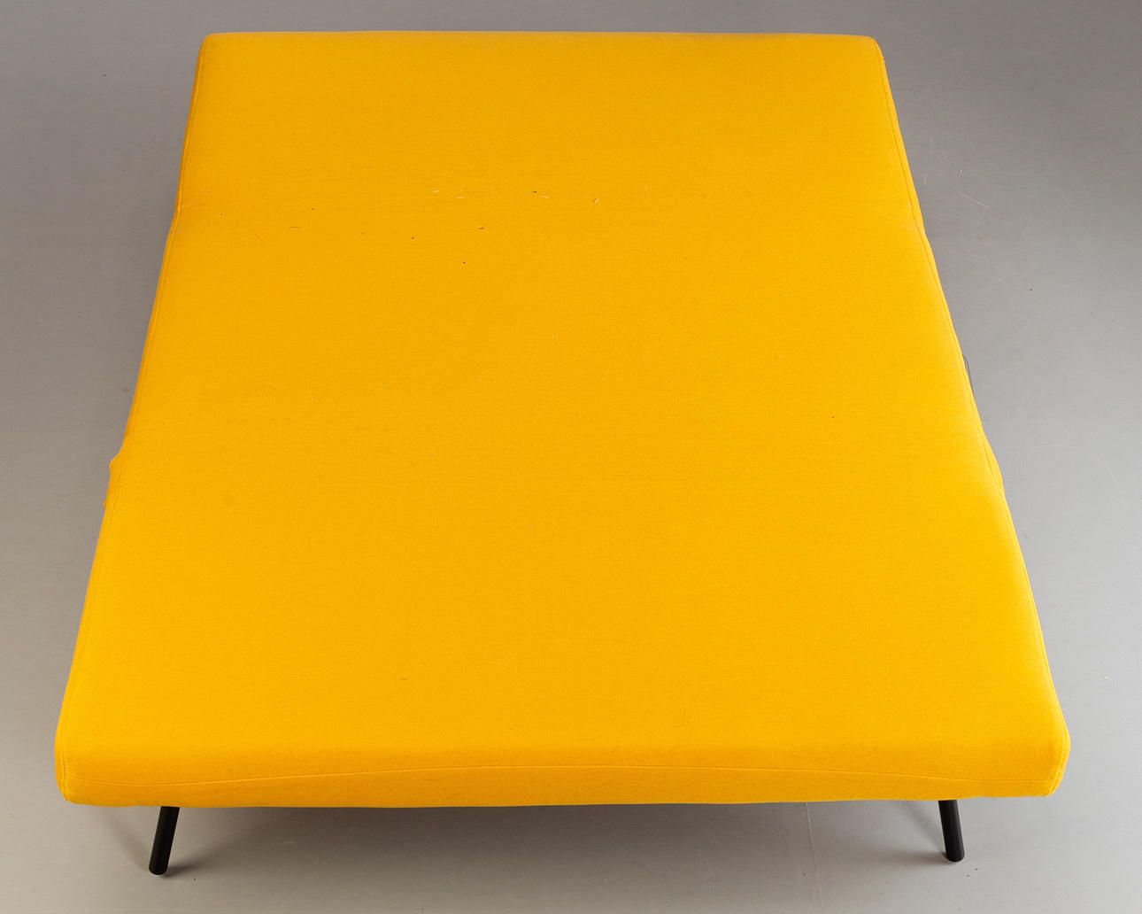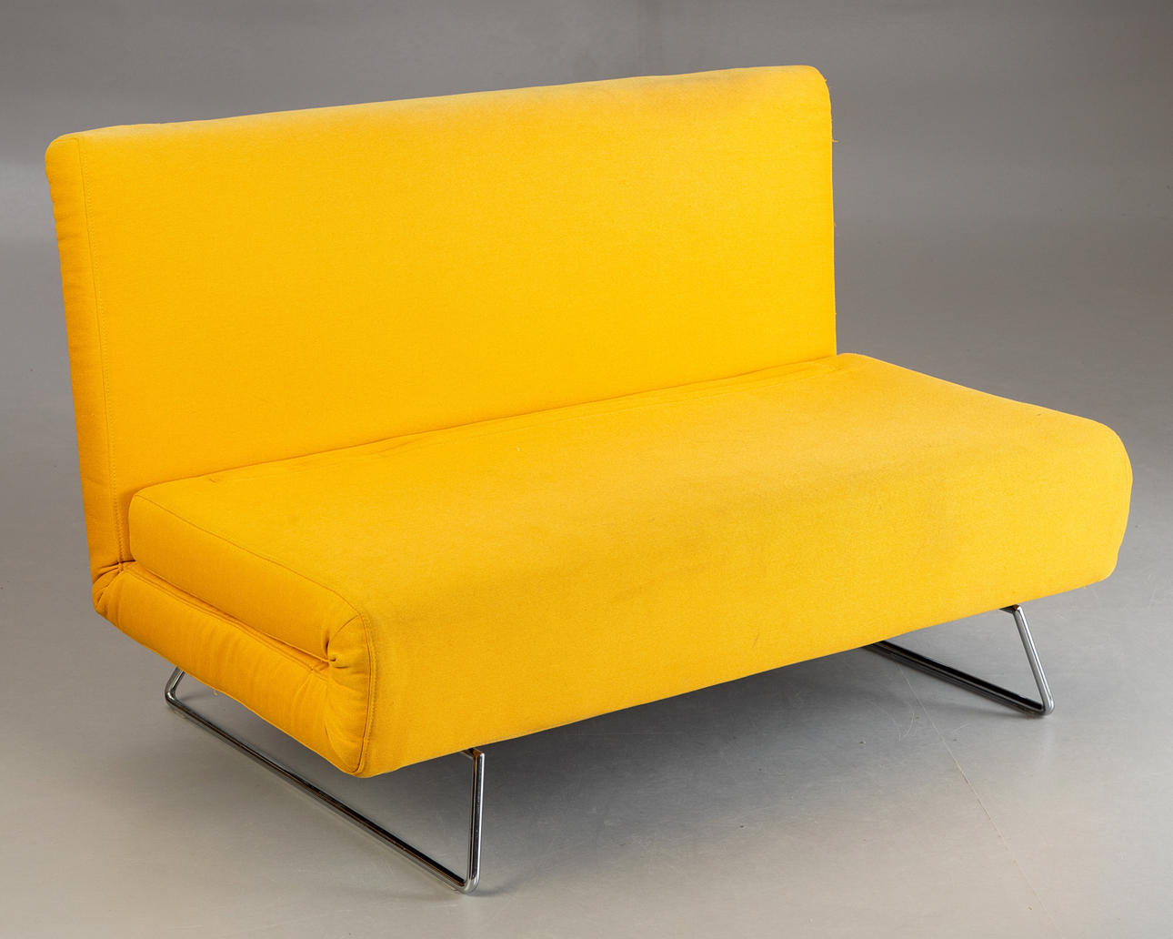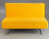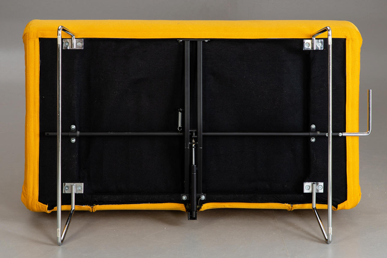 Soffa/dagbädd med förkromad och hopfällbar bas, ryggstöd och sits i hopfälld klädsel. Klädd med gult tyg