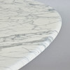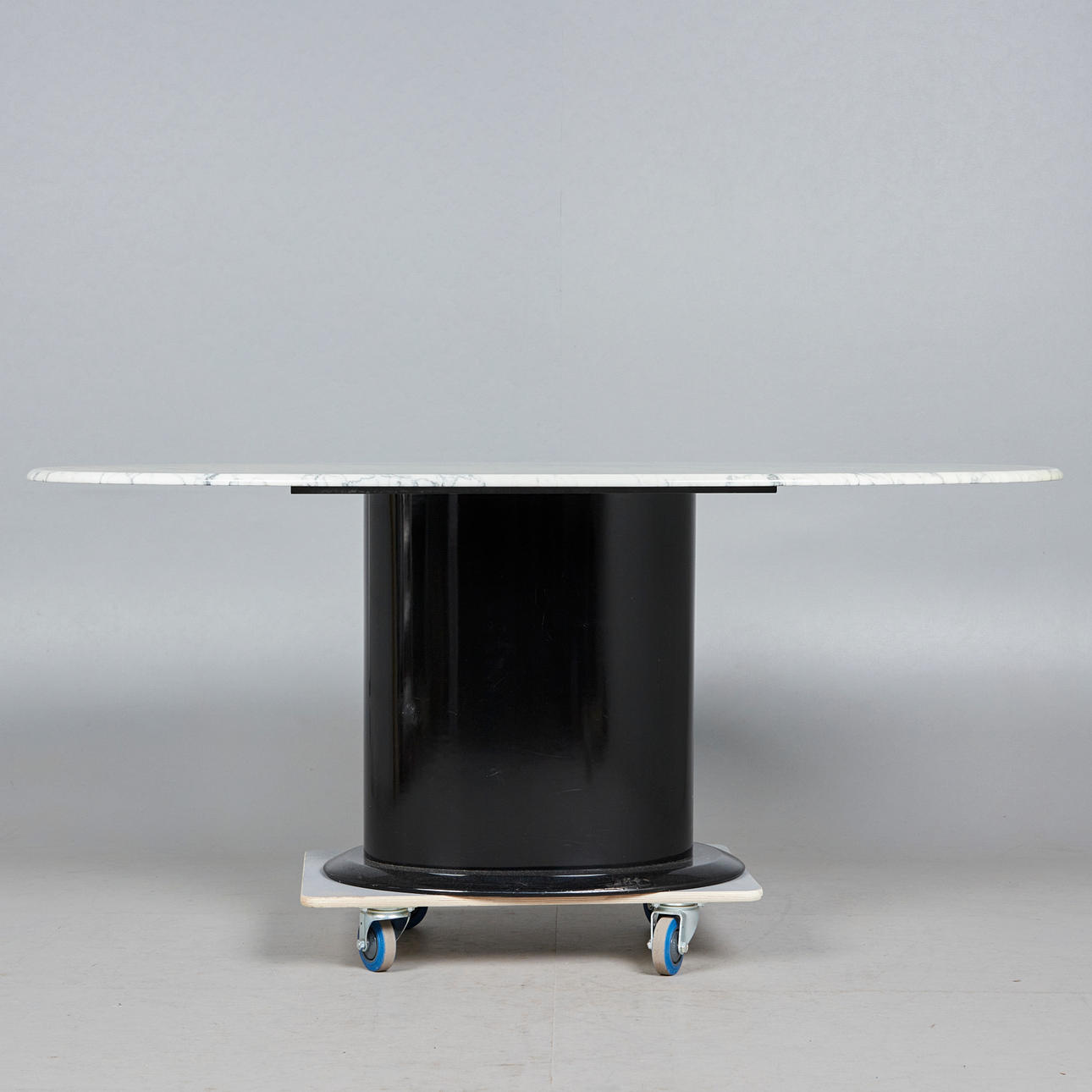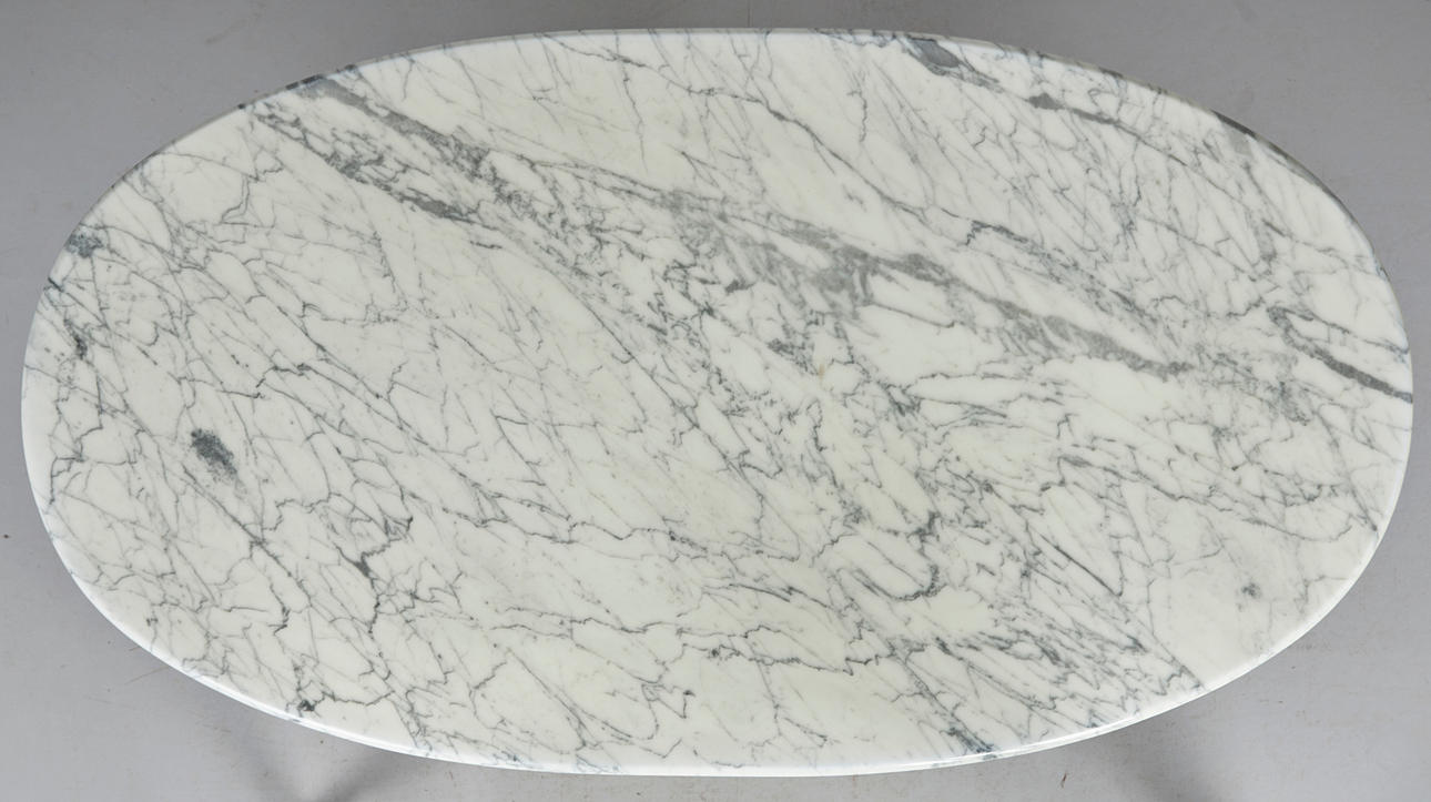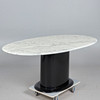 Bord/matbord, marmor, Italien. Ovalt matbord i vit marmor med grå ådring, försedd med en oval fot i svartlackerad plast, bord: h.74cm, l.185cm, W.99cm, sockel: 70x50cm.