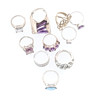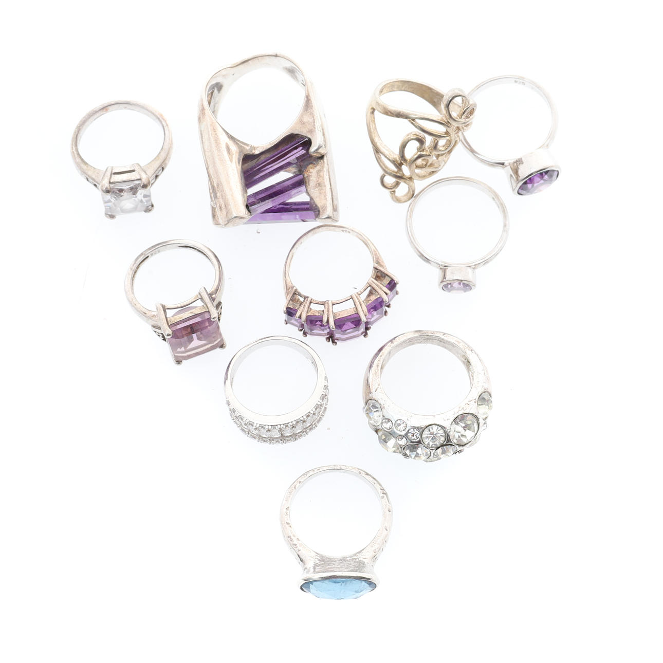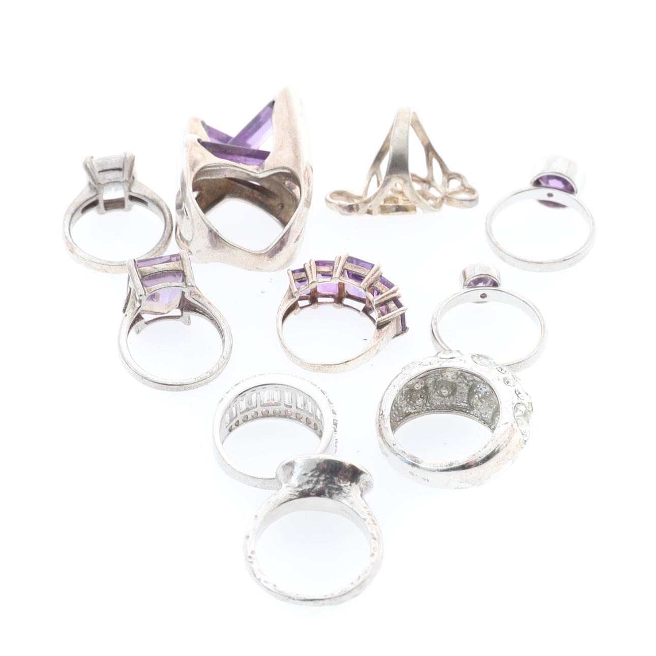 annan, av rullade trådverk form, en abstrakt klänning ring, omärkt, med tre korsade ametist färg batonger, och en annan, set med vit pasta, varierande fingerstorlekar, 74,5 g brutto (10).