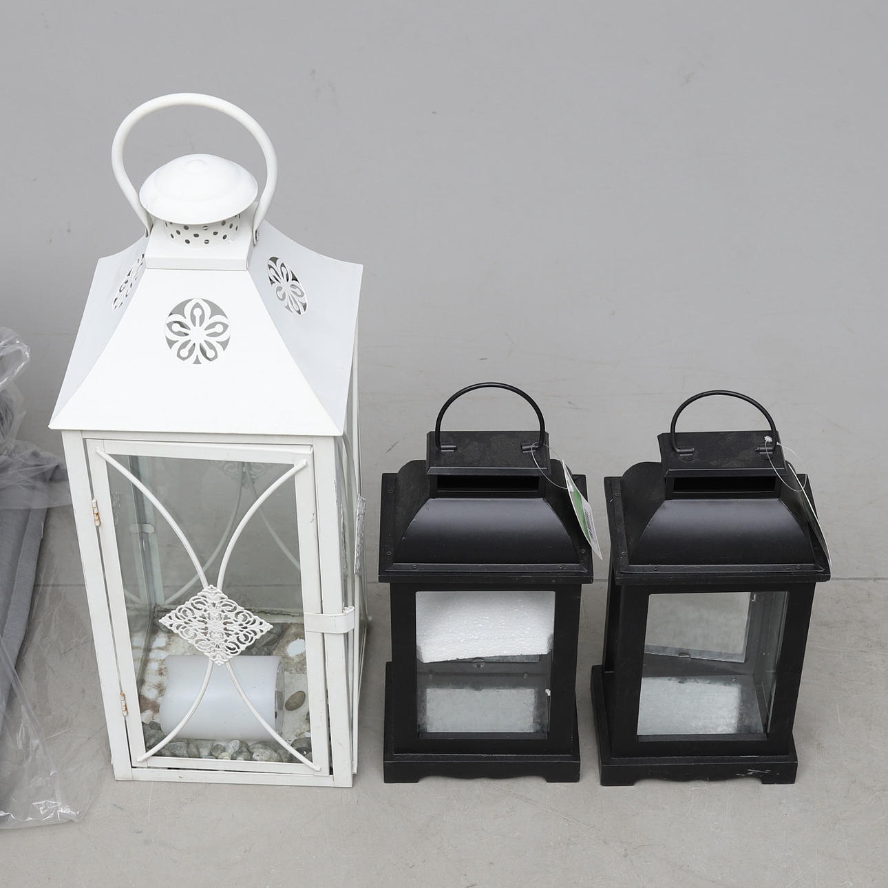 4 dynor, 3 lyktor. höjd ca 32-60cm. Dynor ca 118x48.cm.