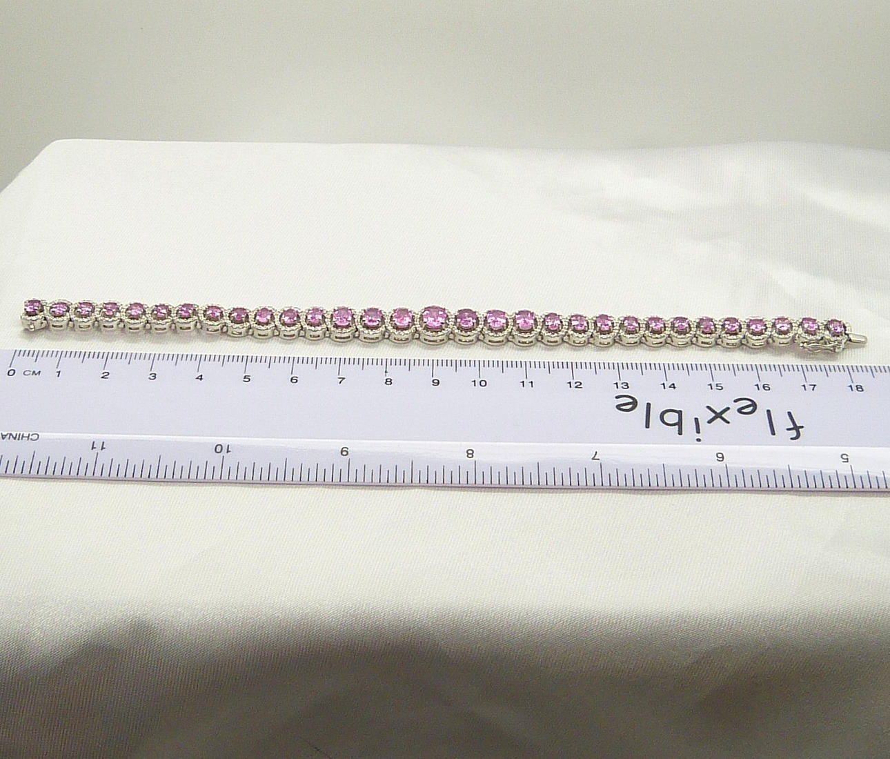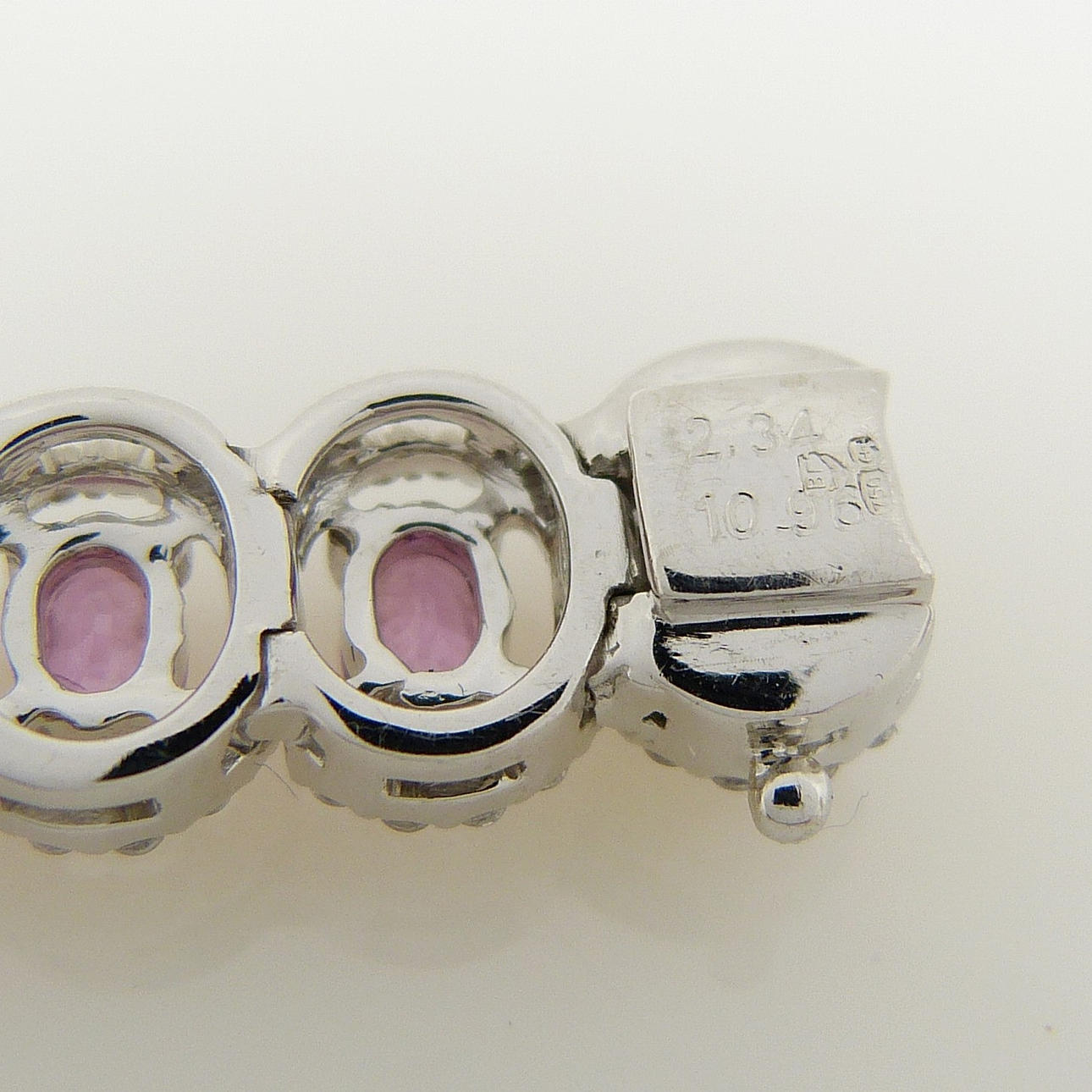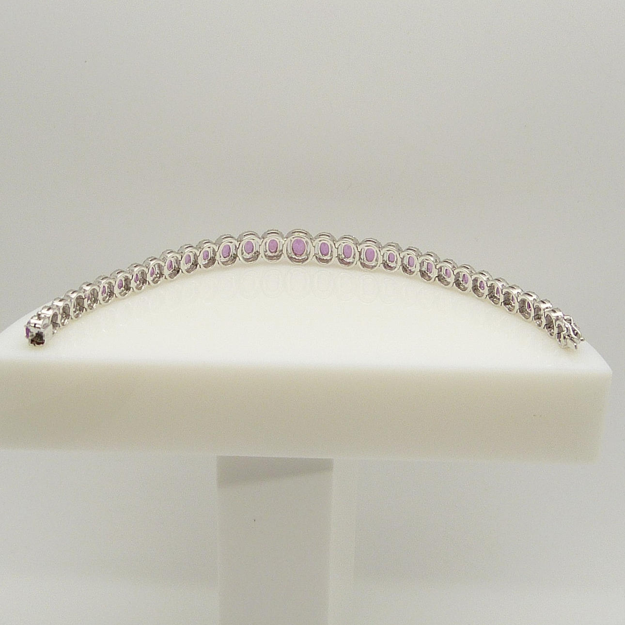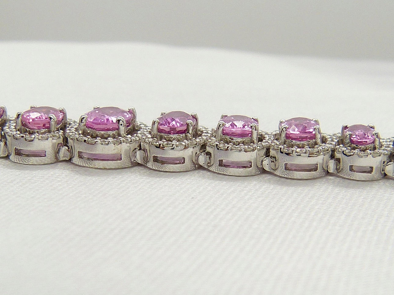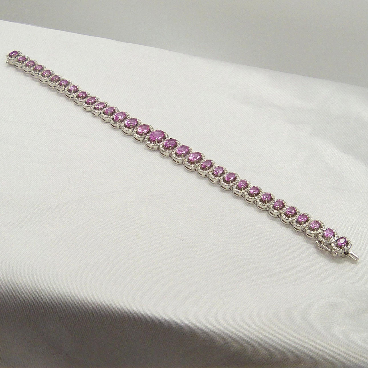 Den kombinerade karatvikten hos de rosa safirerna är 10,96 ct. Den rosa safiren blir större mot mitten av armbandet.