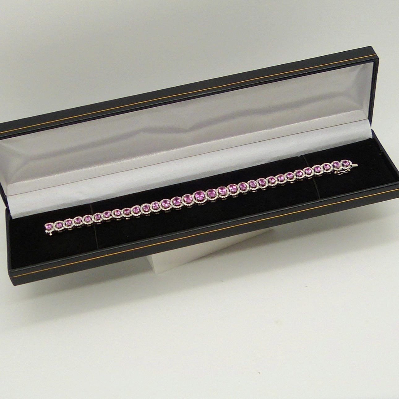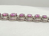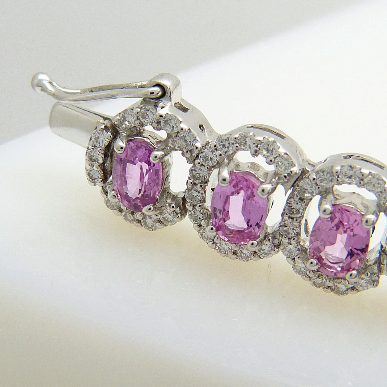 Armband med fin kvalitet 18k vitguld rosa safir (10.96 ct) och diamant (2.34 ct) multi-halo armband, boxed.