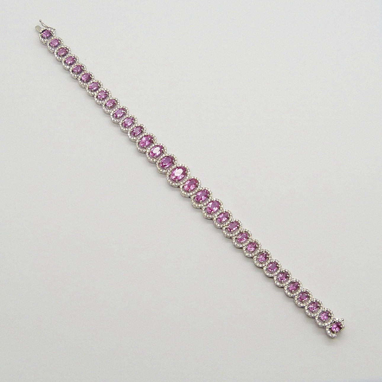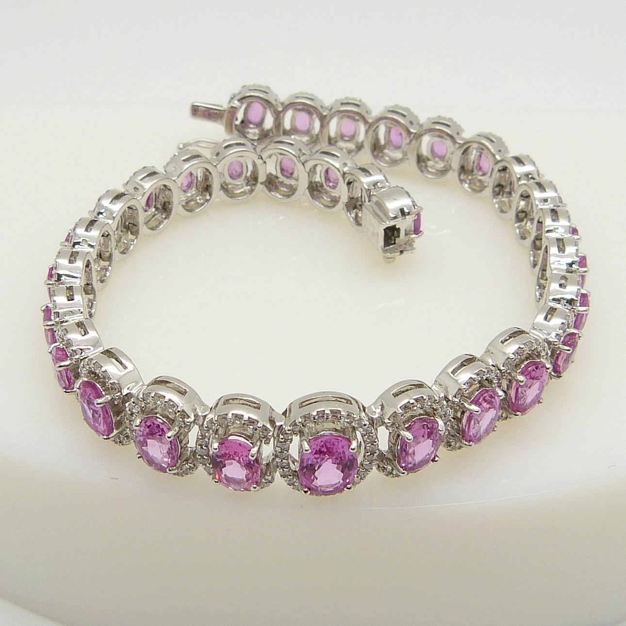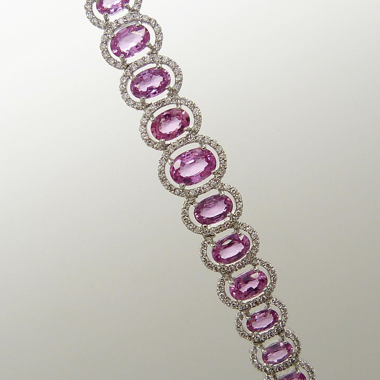 Detta eleganta armband är 4-klo set med 31 ovalslipade rosa safir ädelstenar och 400 rundslipade diamanter.