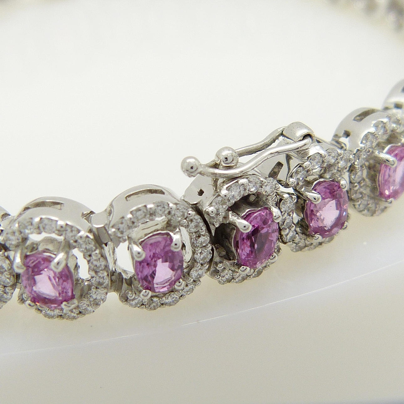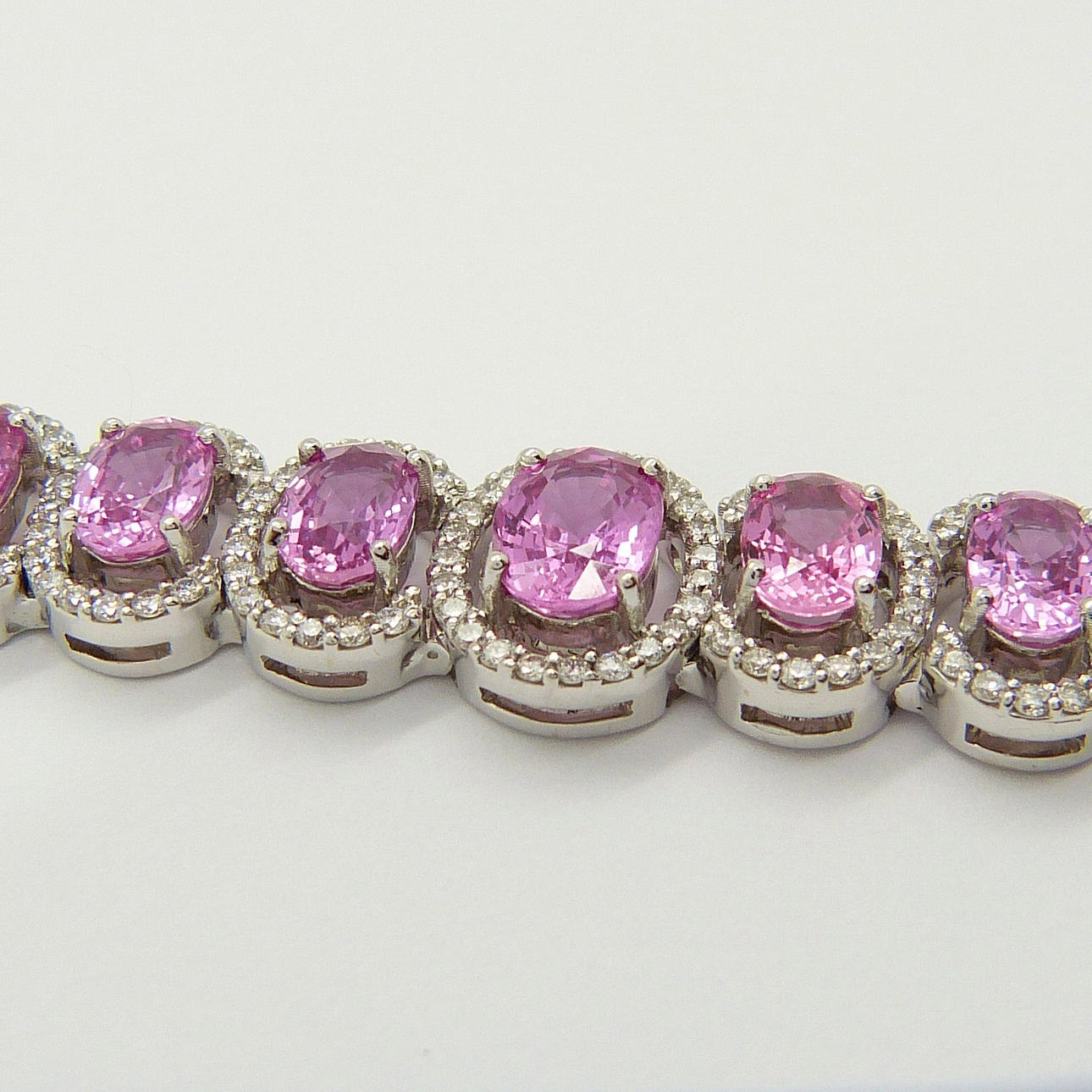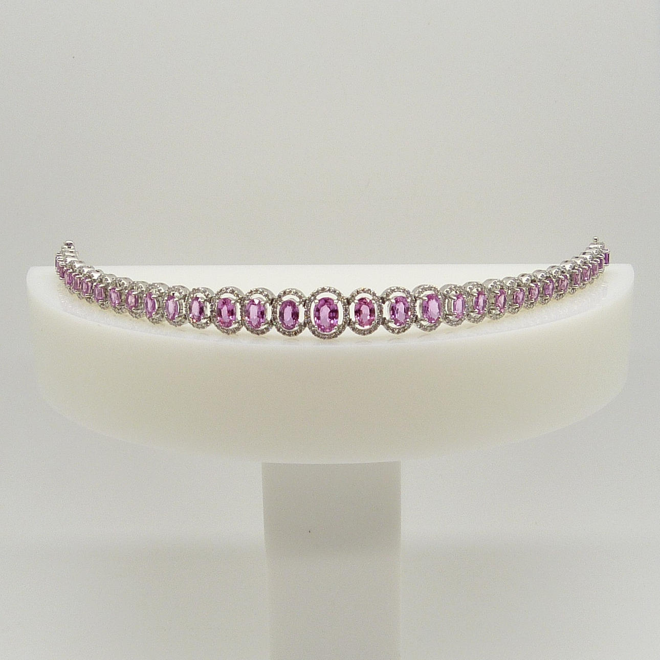 Detta eleganta armband är 4-klo set med 31 ovalslipade rosa safir ädelstenar och 400 rundslipade diamanter.