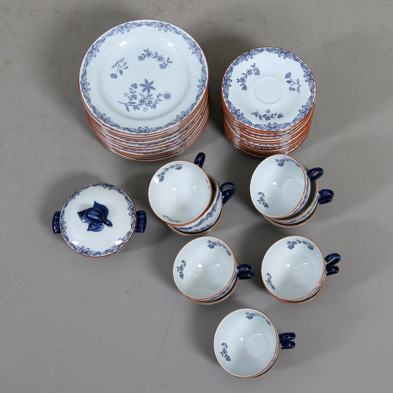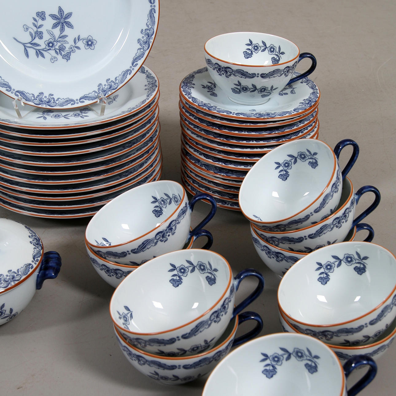 12 koppar, höjd 5 cm. 12 fat, diameter 13 cm. 12 assietter, diameter 18 cm. Sockerskål, höjd 8 cm.