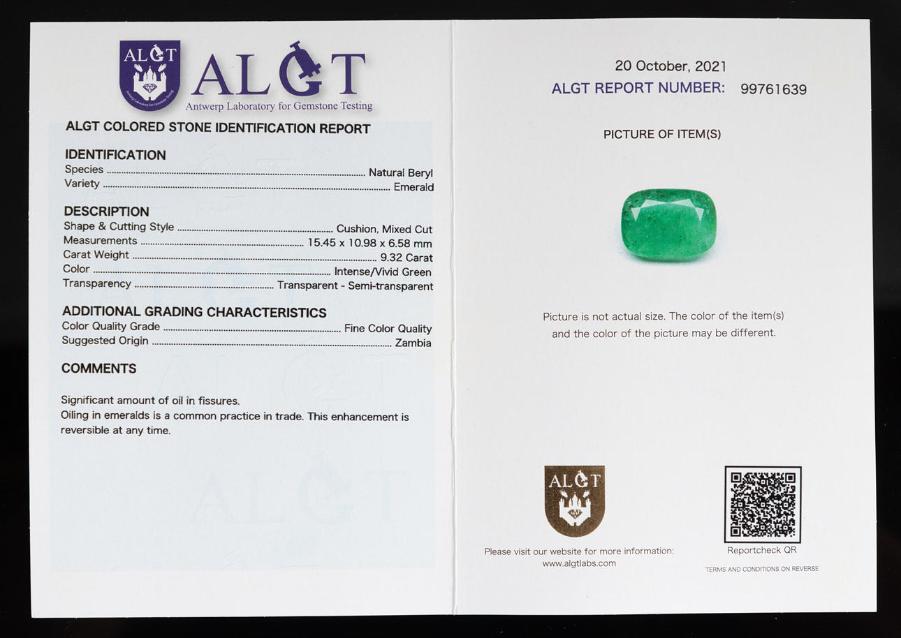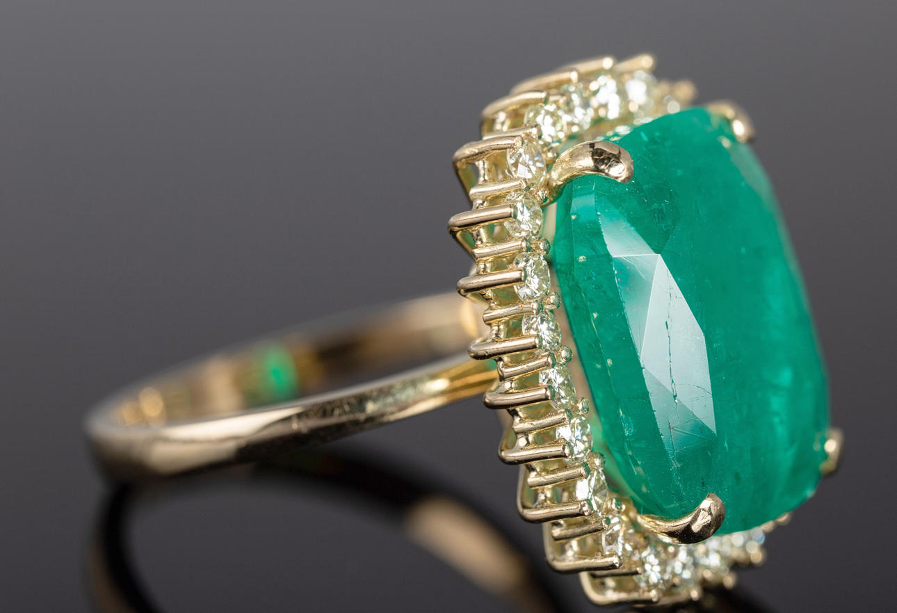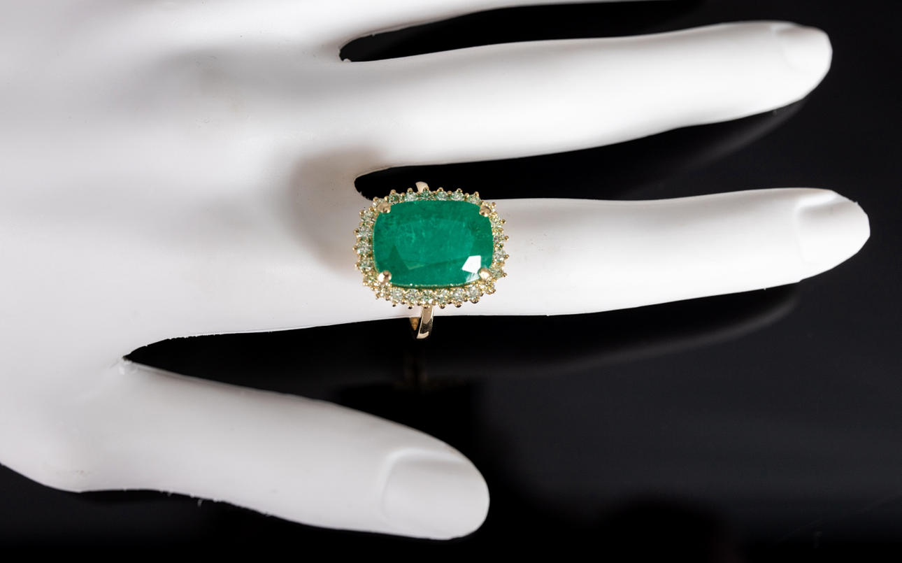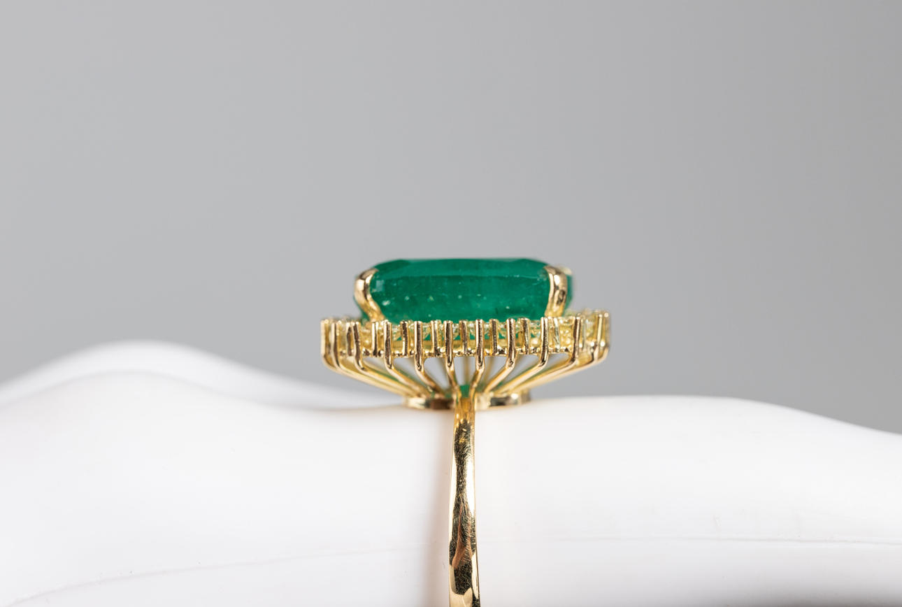 Ring i 750 guld, set med en smaragd i mitten av ca. 9.32 ct och diamanter totalt ca. 0,82 ct. färg.: Mycket ljusgul, renhet.: VVS. Smaragdmått ca. 10,9 mm x 15,4 mm Ringstorlek ca.. 57. Vikt ca. 8 gram Certifikat ingår.