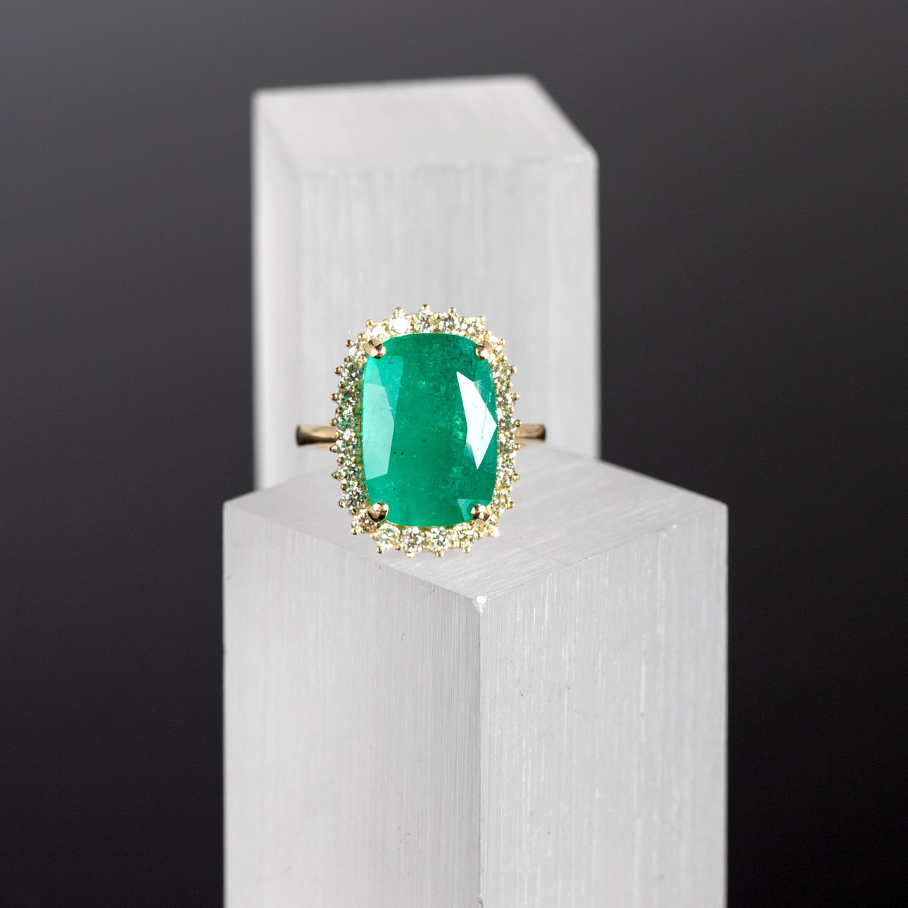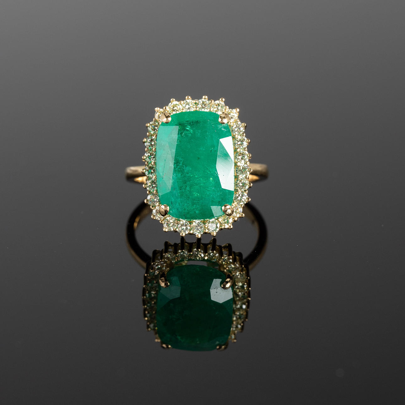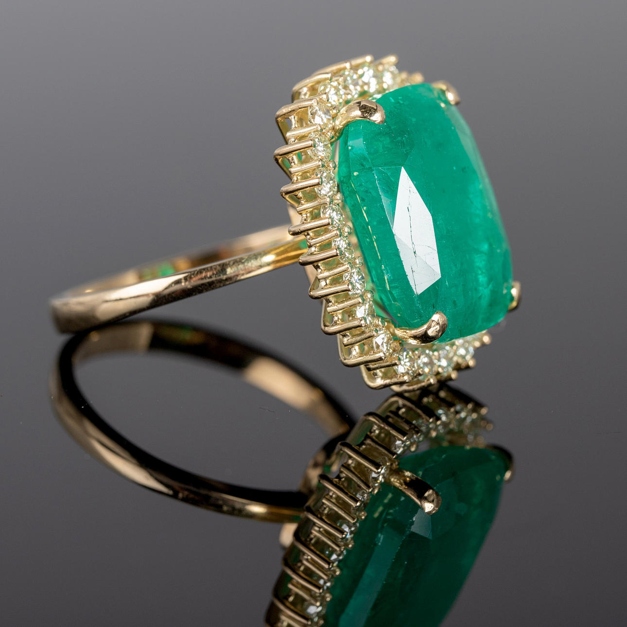 Ring i 750 guld, set med en smaragd i mitten av ca. 9.32 ct och diamanter totalt ca. 0,82 ct. färg.: Mycket ljusgul, renhet.: VVS. Smaragdmått ca. 10,9 mm x 15,4 mm Ringstorlek ca.. 57. Vikt ca. 8 gram Certifikat ingår.