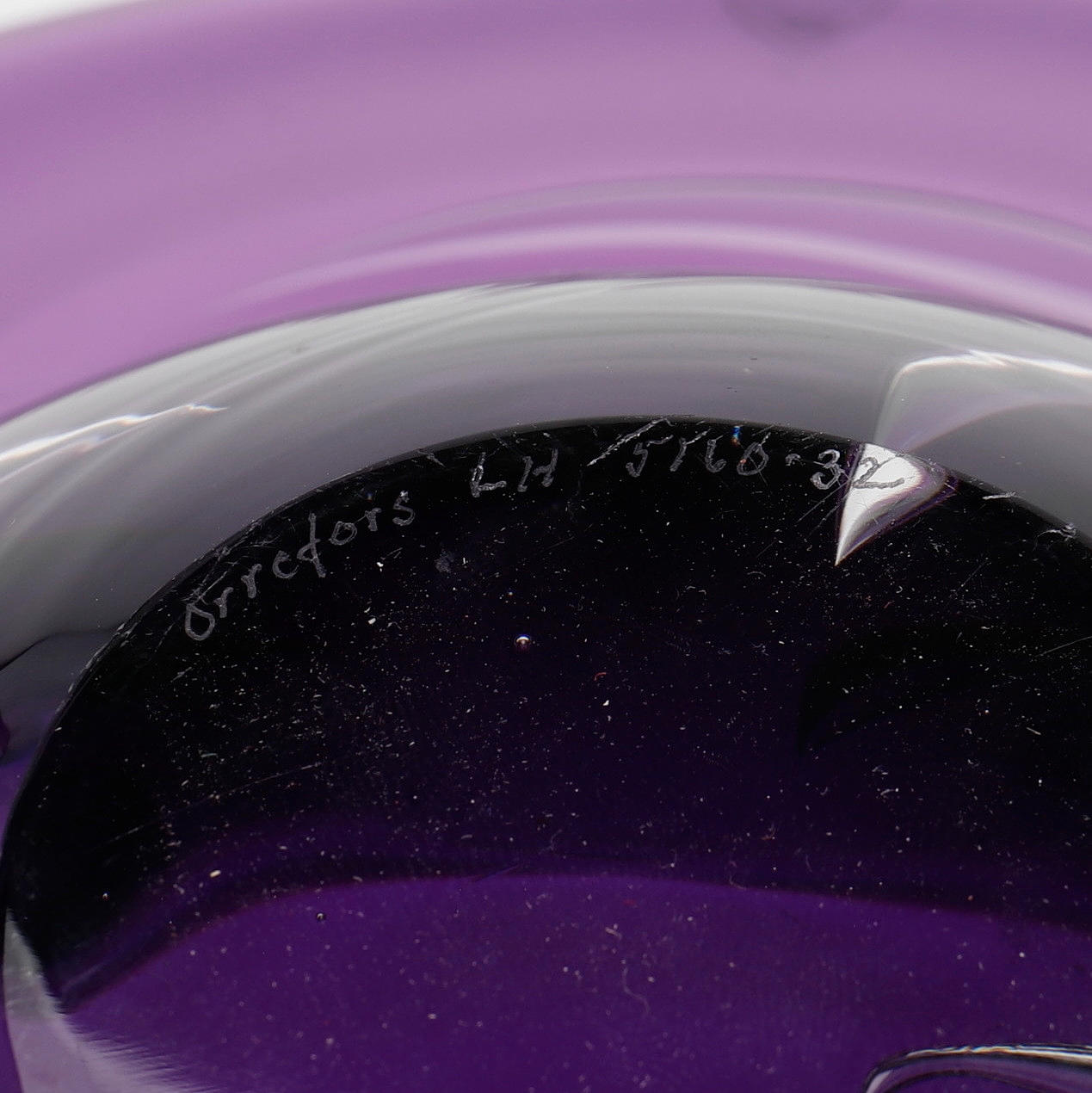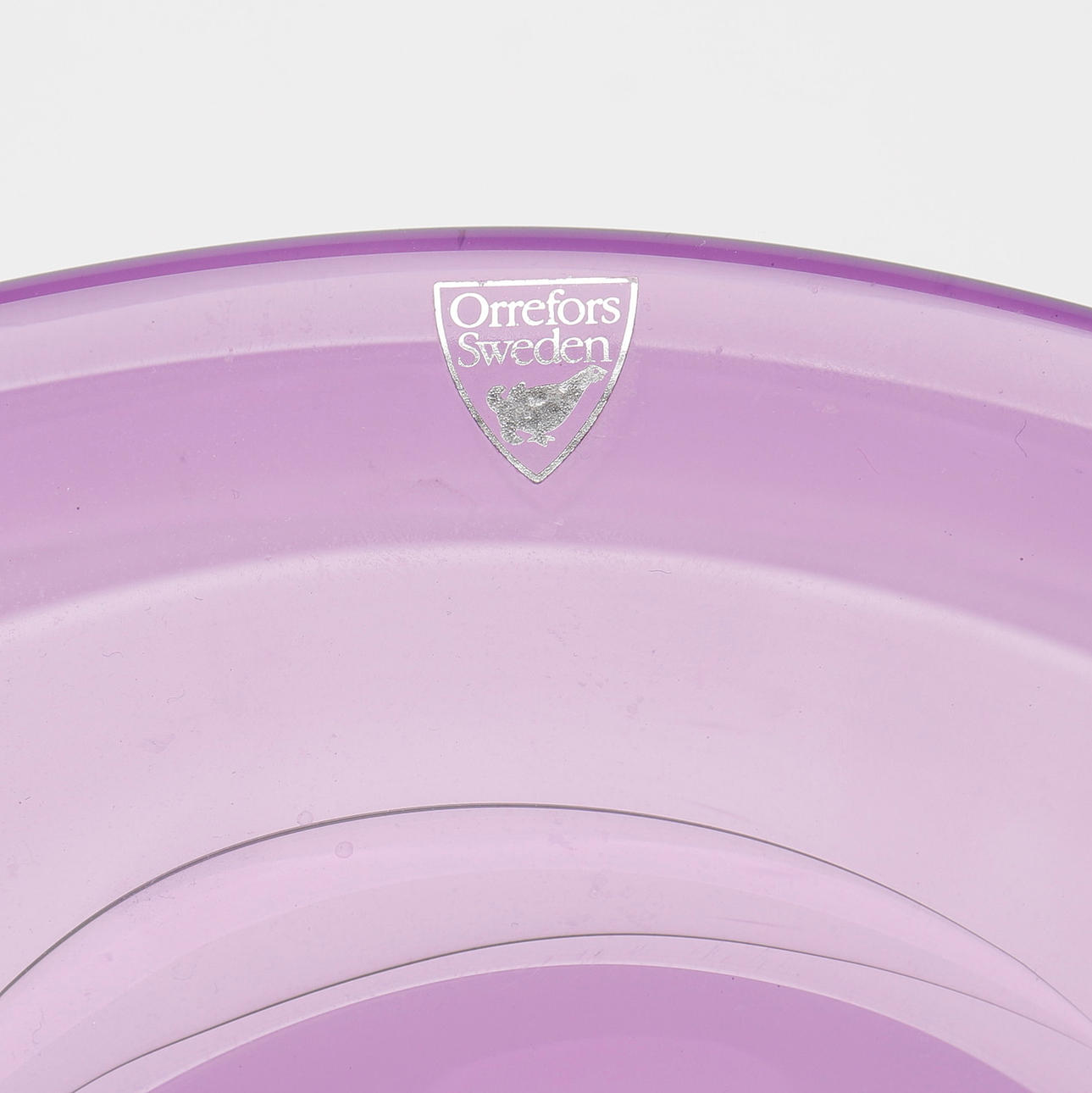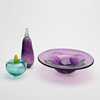 1 Skål, Lars Hellsten, Orrefors, violett glas, signerad, diameter 30 cm samt 2 frukter, Gunnel Sahlin, Kosta Boda, signerade, höjd 12, längd 23 cm.
